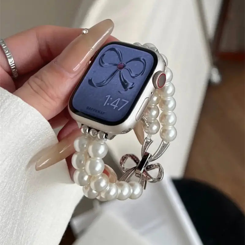 The Pearl Bow Watch Strap brings timeless elegance and feminine charm to your wrist. Designed with lustrous pearl beads and finished with a delicate crystal-accented bow, this strap offers a graceful, jewelry-inspired look.