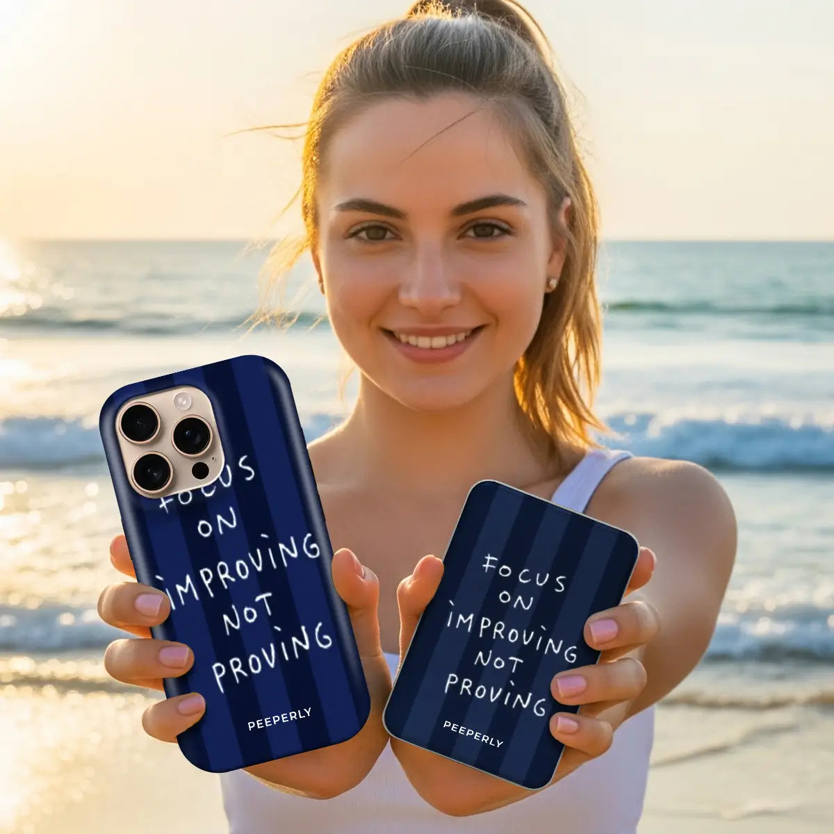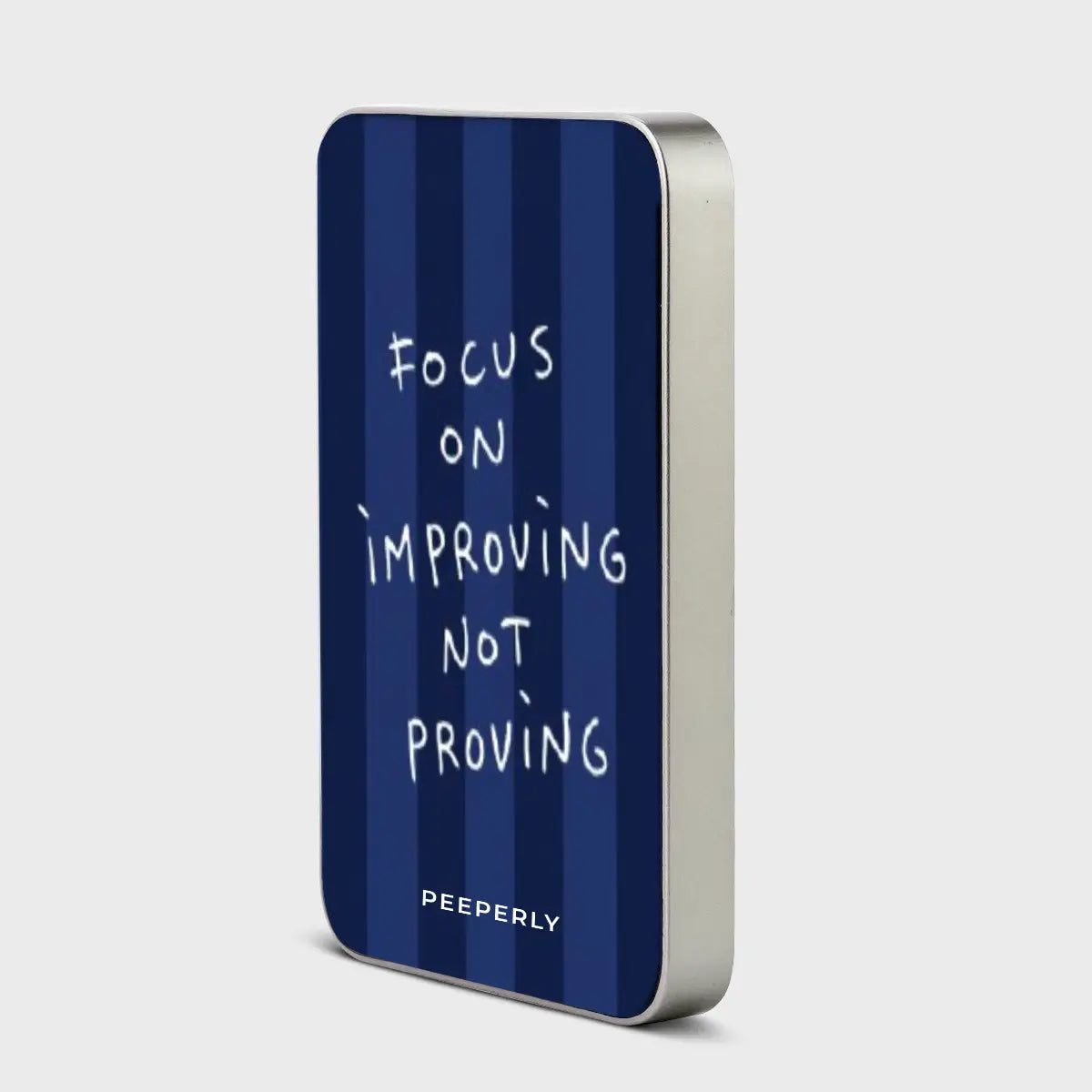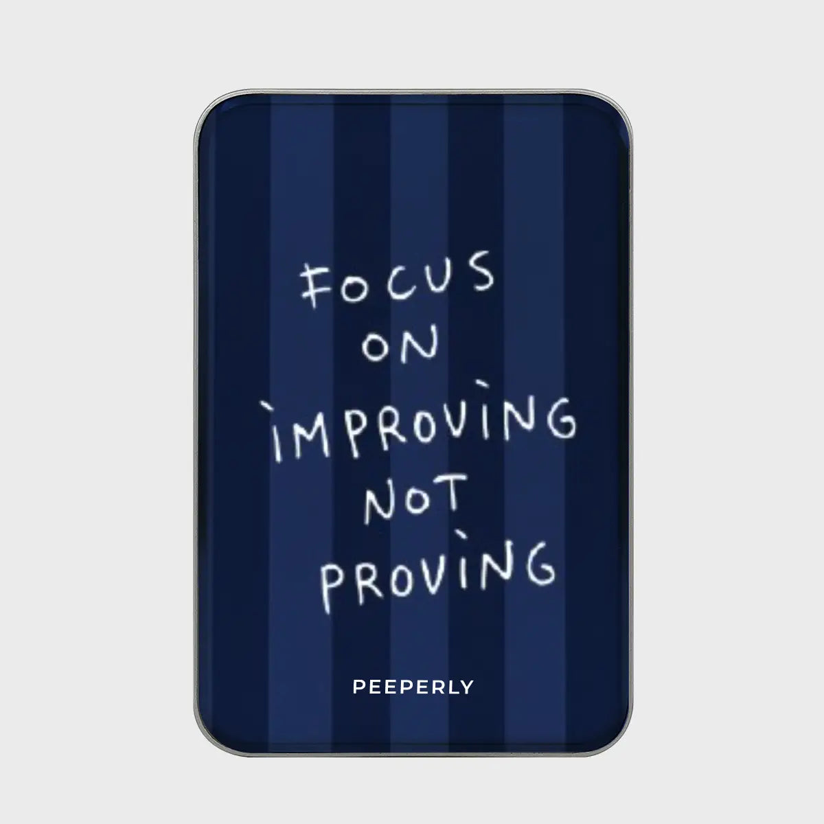 Calm, disciplined, and purpose-driven. Focused Becoming pairs deep navy stripes with a handwritten reminder to prioritize growth over validation. The bold yet minimal design reflects clarity of mind and steady progress — a daily cue to invest in improvement, not approval.