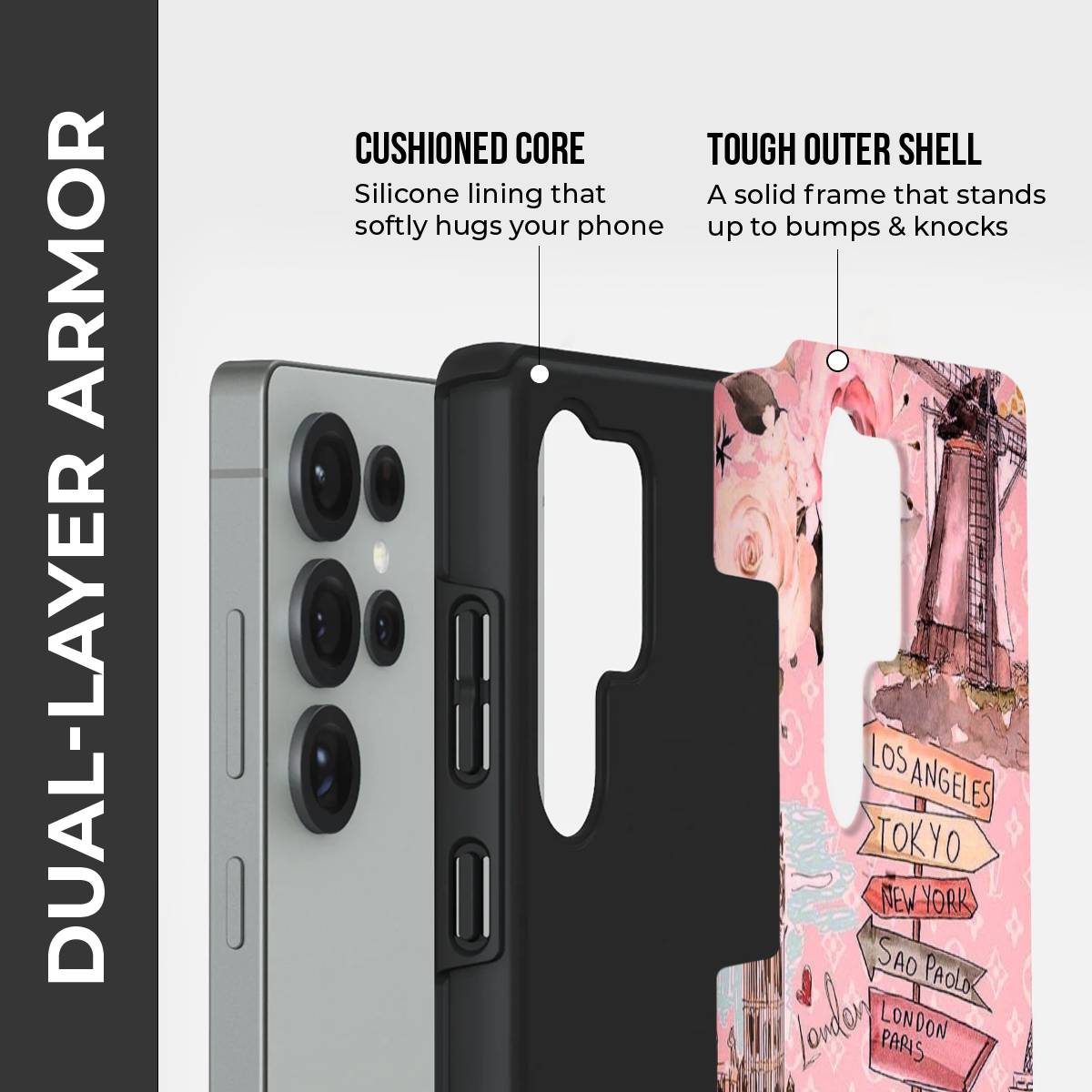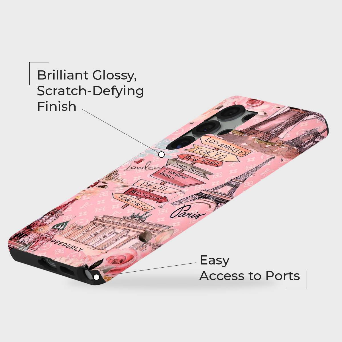 A perfect fusion of travel, style, and elegance. This phone case celebrates the beauty of world cities with a touch of charm, featuring iconic landmarks and vibrant street signs. Whether you're a wanderer or a dreamer, Global Love is your perfect companion to carry the essence of the world's most beloved destinations, all in one stylish, pink design.Â