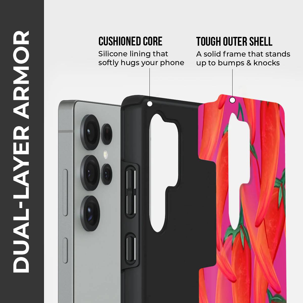 Turn up the heat with this fiery phone case! Featuring bold red chili peppers against a vibrant pink backdrop, this design is all about confidence, energy, and playful sass. It’s the perfect accessory for anyone who loves to stand out and keep things sizzling.
