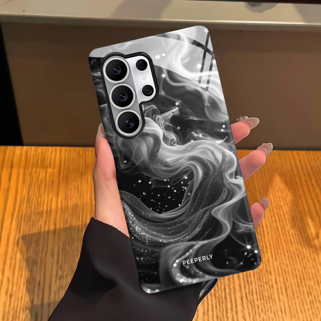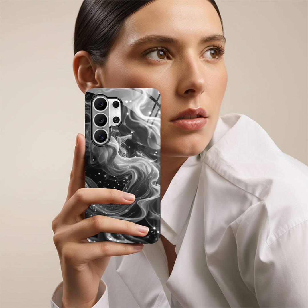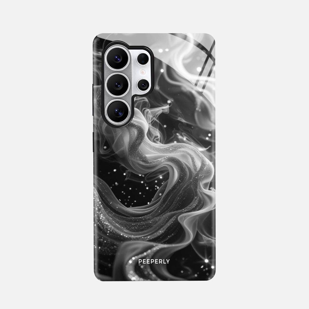 Mysterious and effortlessly elegant, Lunar Smoke blends swirling silver wisps against a deep midnight backdrop. The fluid, smoke-like design drifts gracefully across the surface, accented with delicate specks that resemble distant stars.