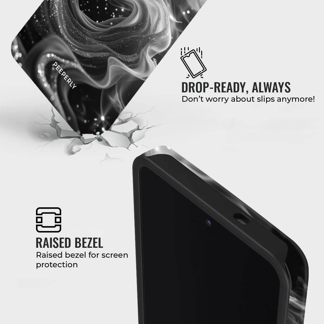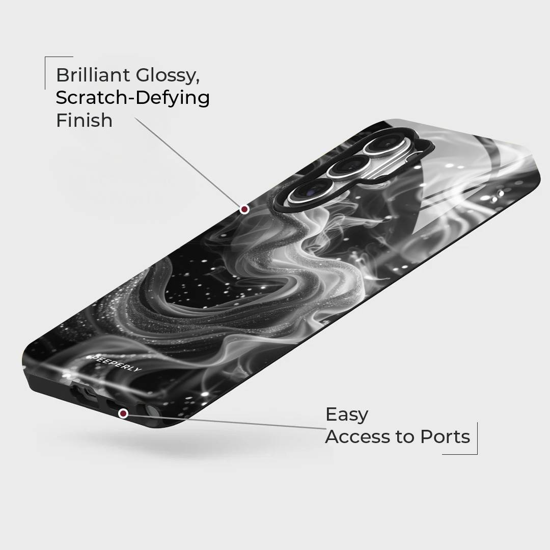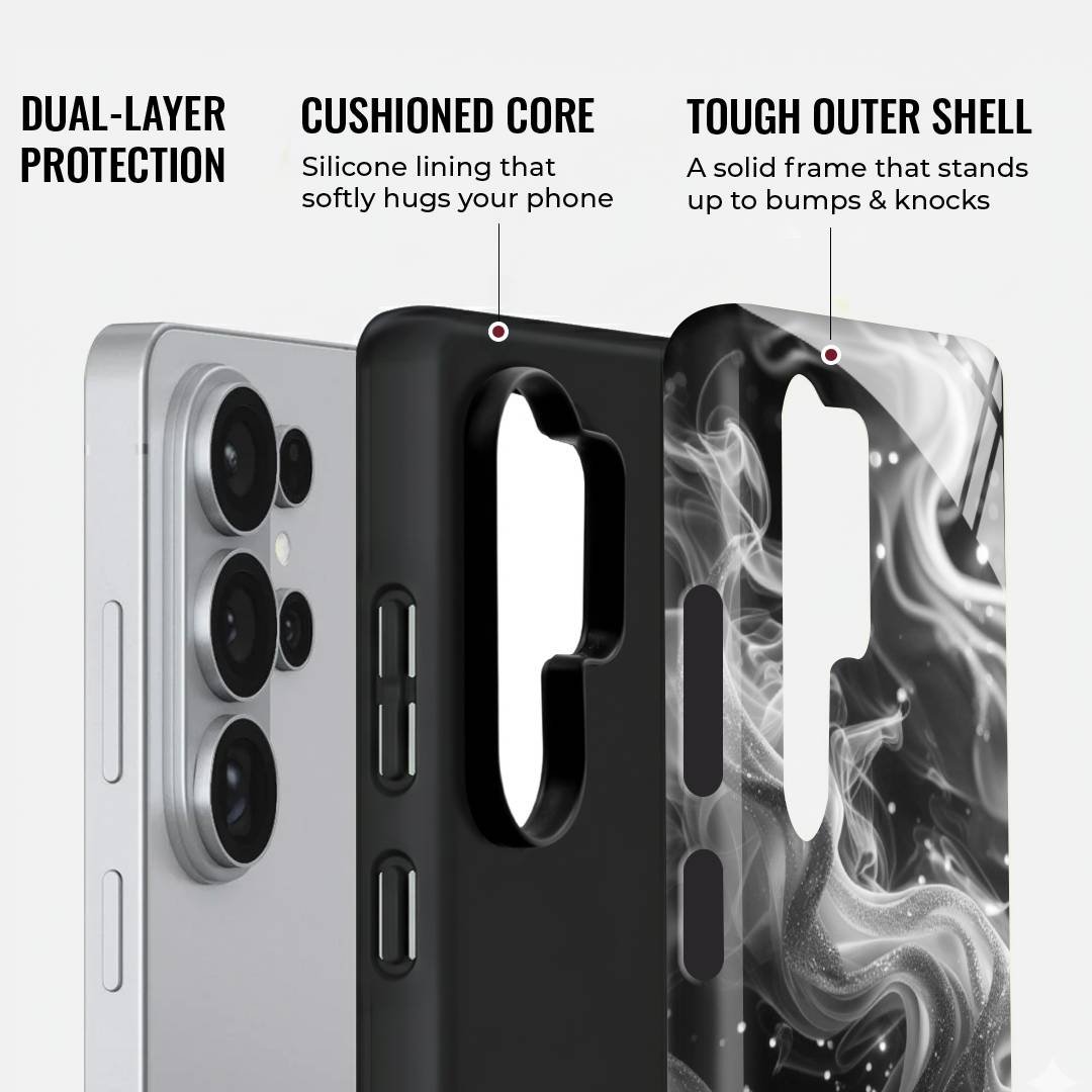Mysterious and effortlessly elegant, Lunar Smoke blends swirling silver wisps against a deep midnight backdrop. The fluid, smoke-like design drifts gracefully across the surface, accented with delicate specks that resemble distant stars.