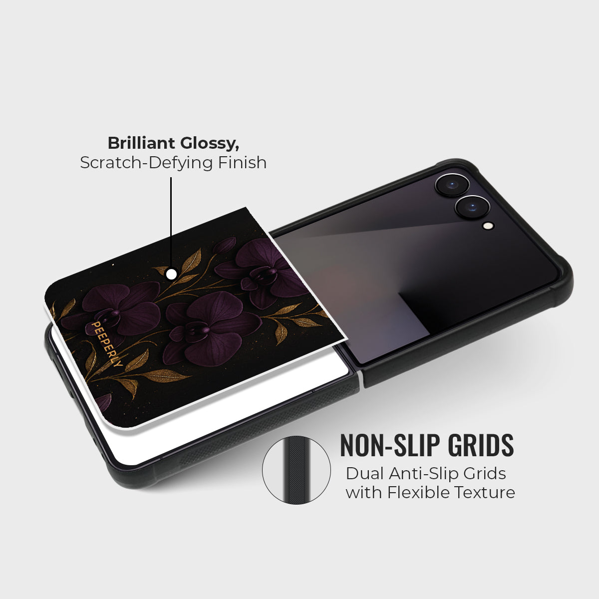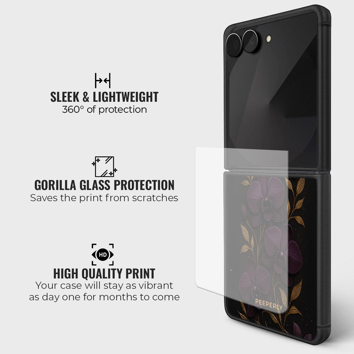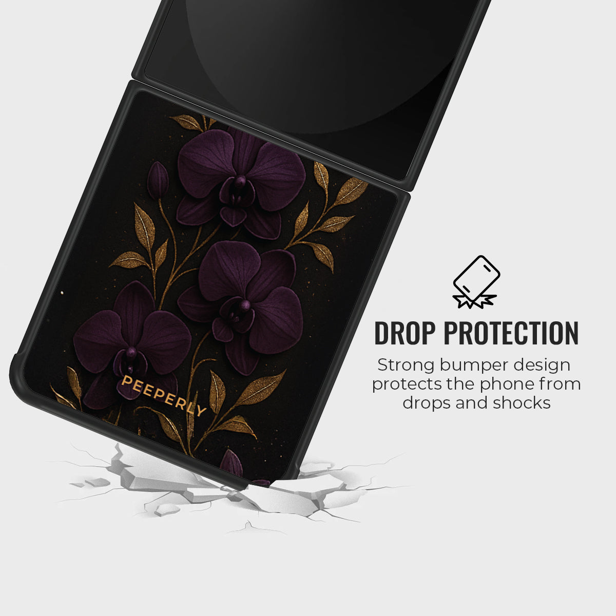 Indulge in understated elegance with the Luxe Bloom phone case. This design pairs deep, rich purple orchids with subtle gold accents, creating a sophisticated fusion of luxury and nature. Set against a sleek black backdrop, the flowers seem to blossom out of the darkness, exuding an air of refined beauty.
