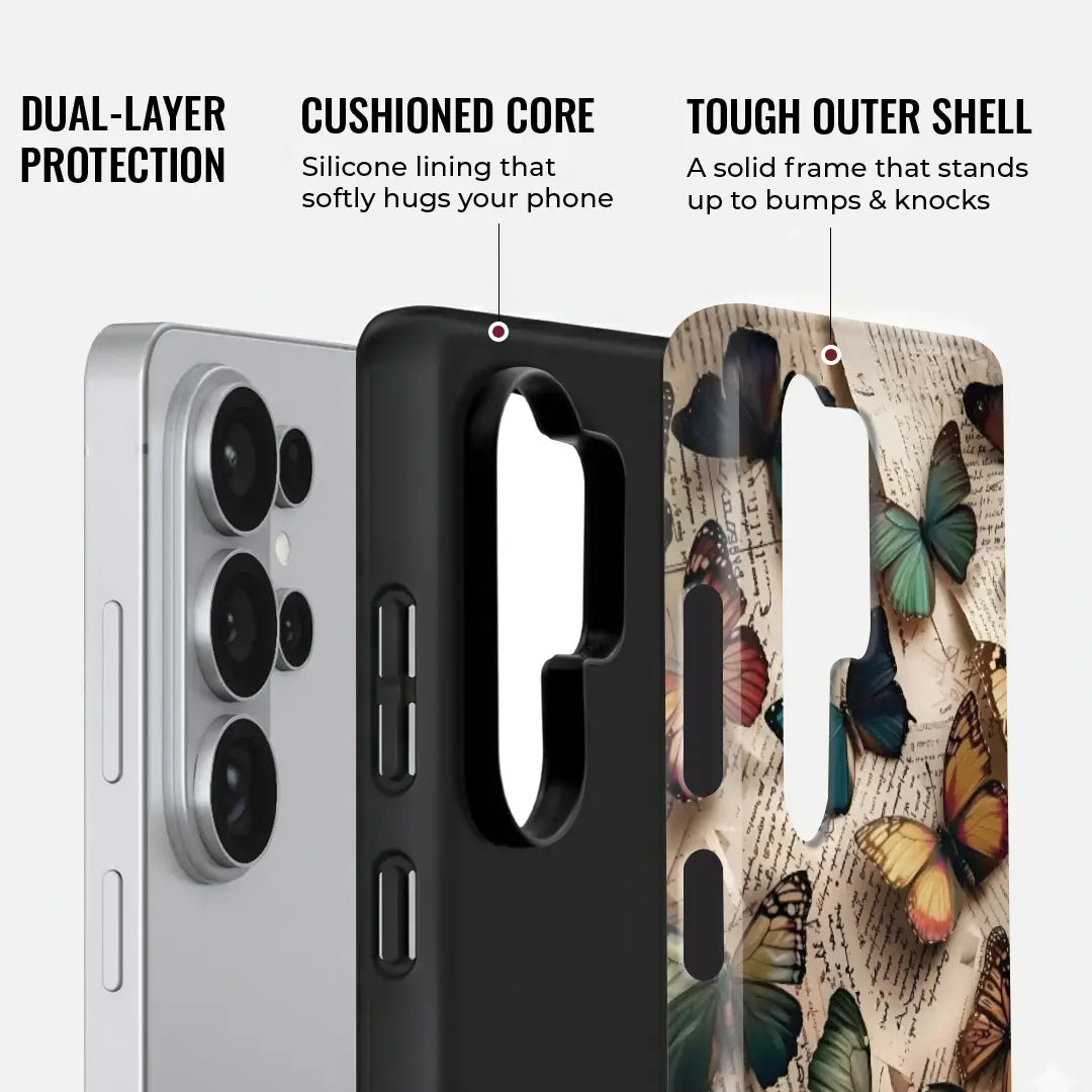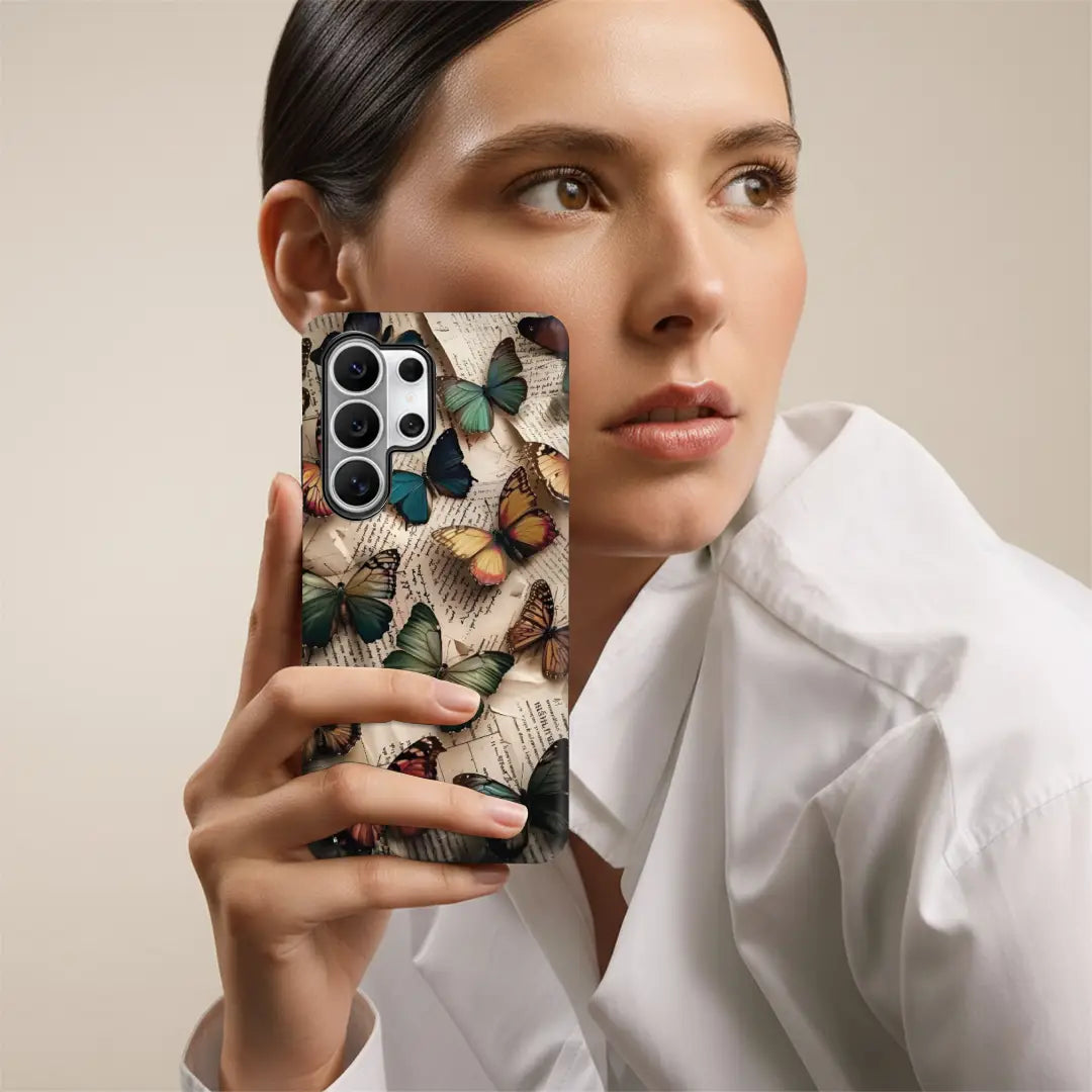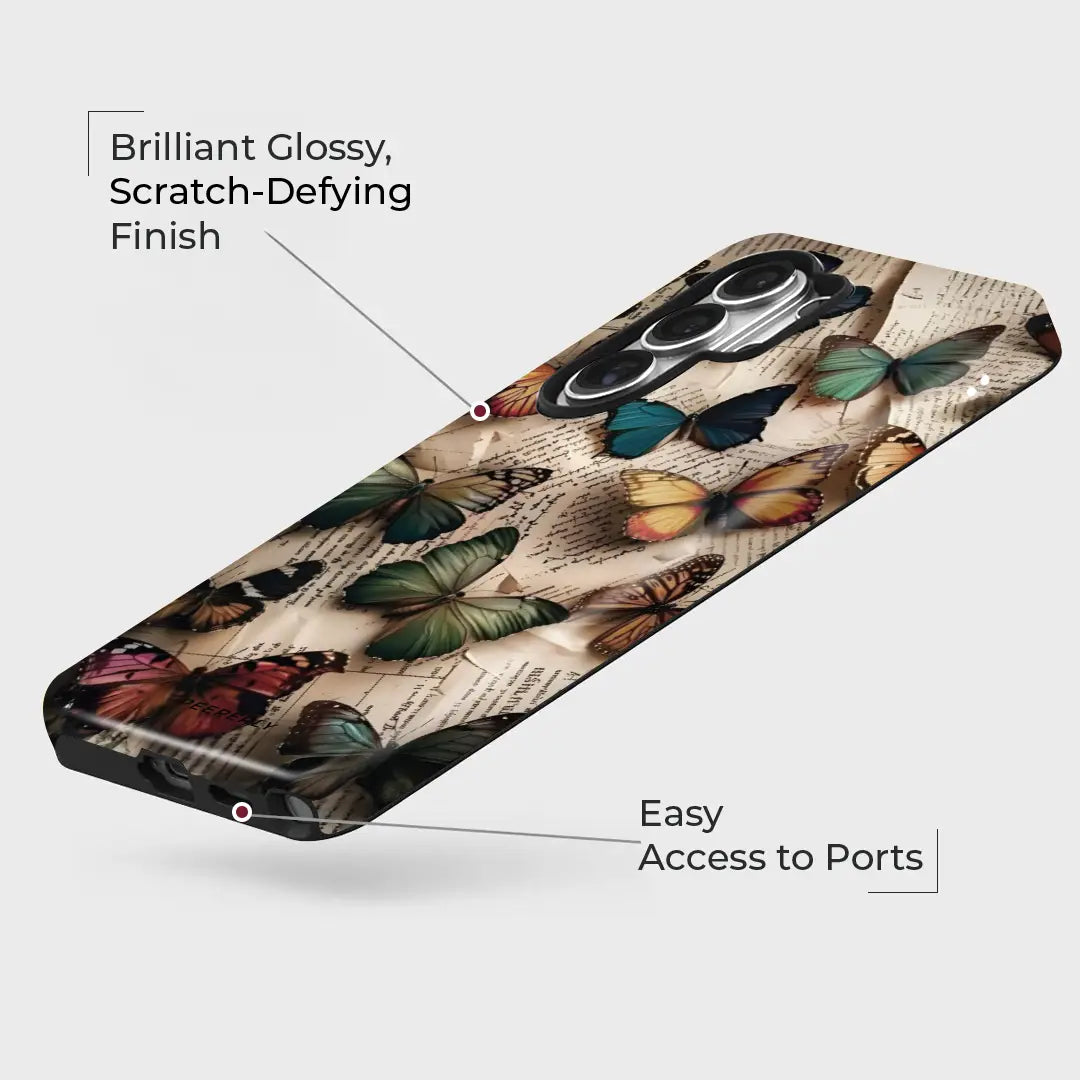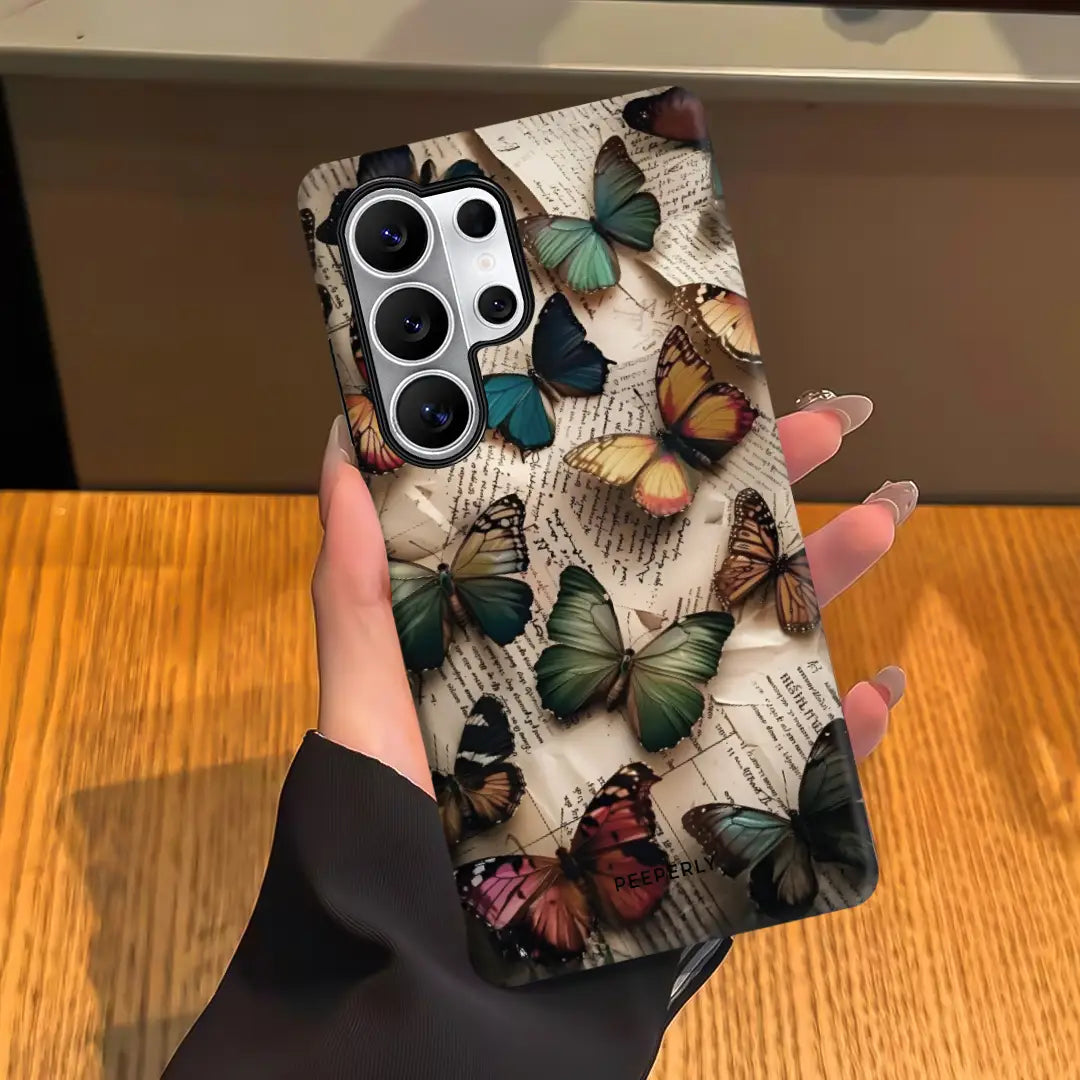 A delicate dance of elegance and freedom — the Papillon Whispers Case embodies the gentle poetry of nature’s most graceful creatures. Inspired by the timeless charm of butterflies, this design layers soft parchment tones with beautifully detailed wings in shades of teal, amber, and gold.