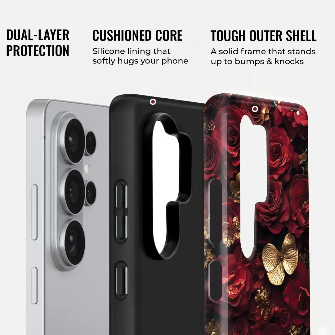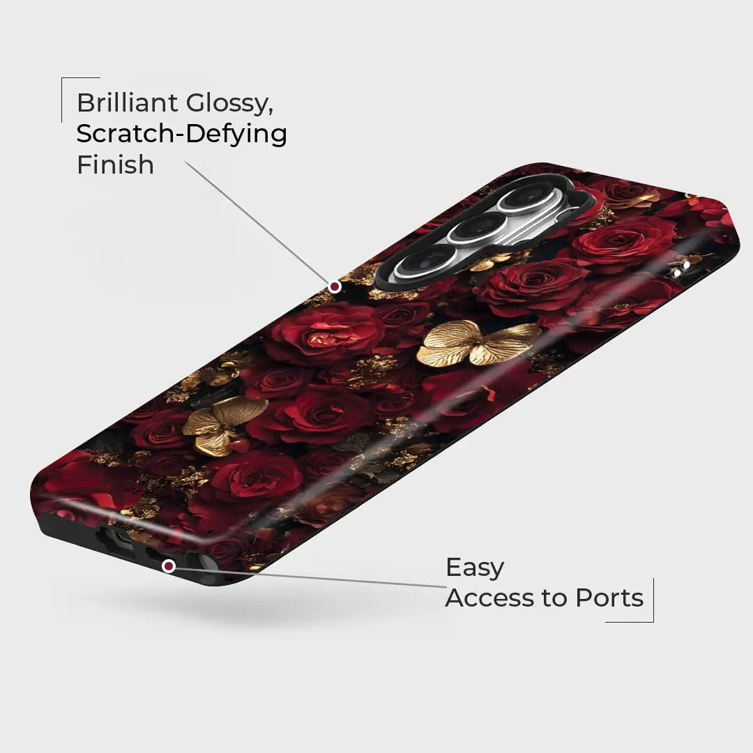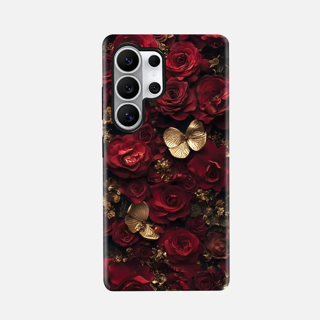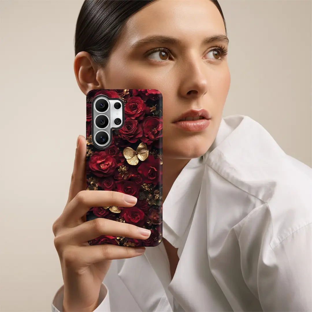 Royal Rose Luxe is a case that exudes timeless beauty and sophistication. Featuring deep crimson roses paired with golden butterflies, it creates a striking contrast of passion and luxury. Every detail is crafted to reflect elegance and charm, making this case not just protection but a statement accessory.