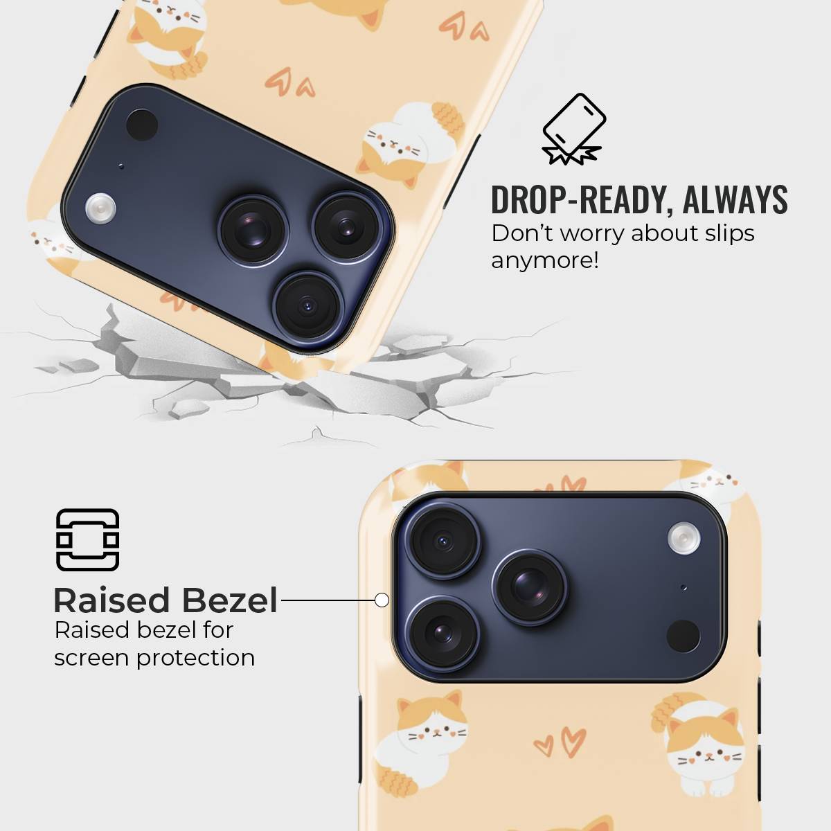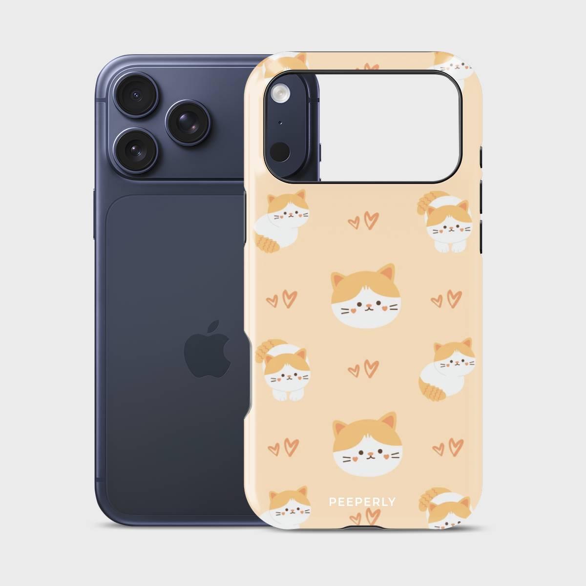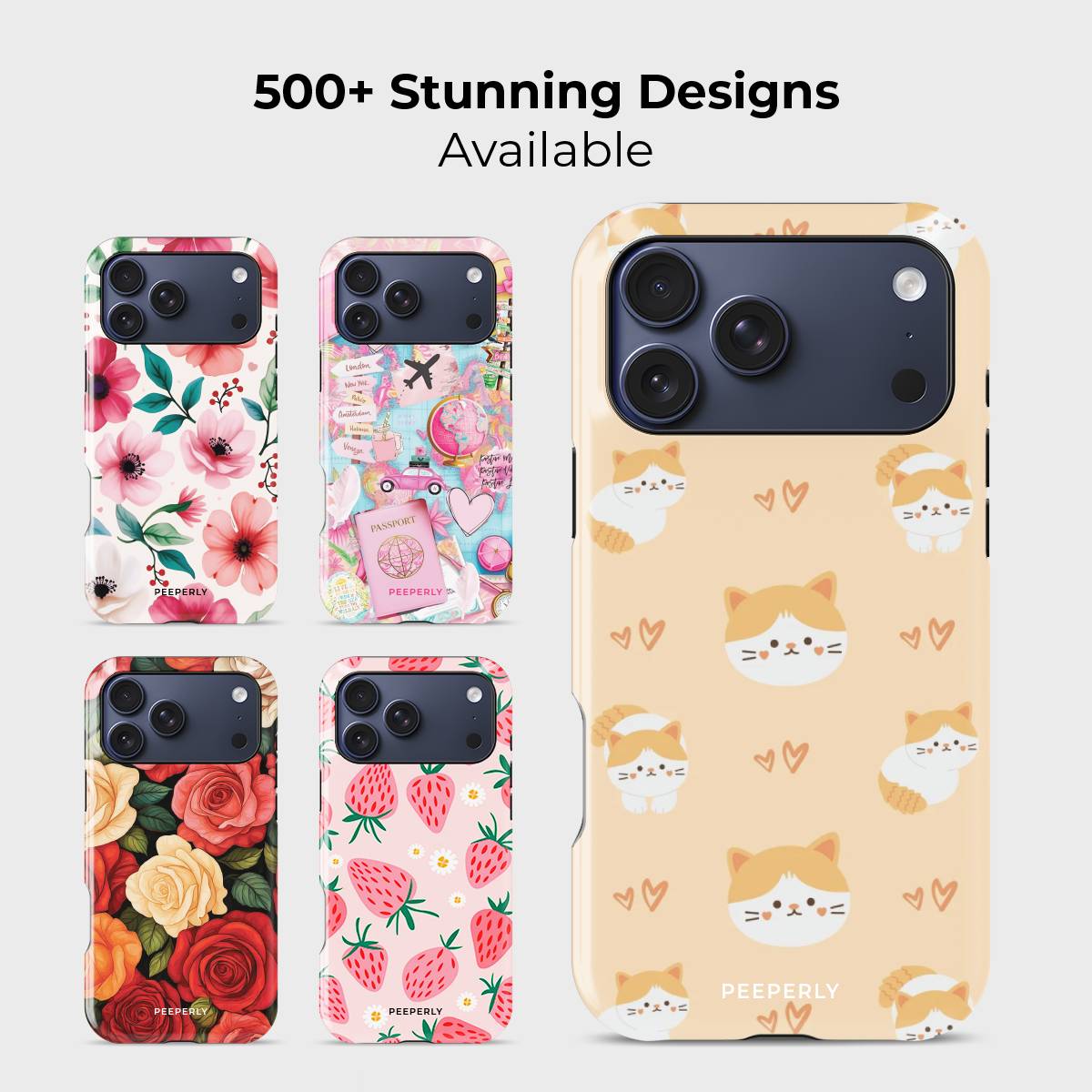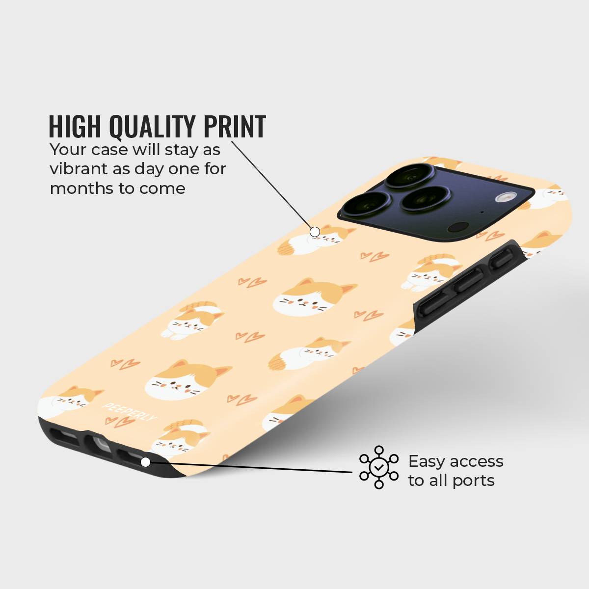 The Feline Crush case features an irresistibly cute pattern of orange-and-white kittens surrounded by dainty peach-toned hearts—all set against a soft pastel backdrop. This playful and heartwarming design is perfect for cat lovers who adore charm with a splash of sweetness.
