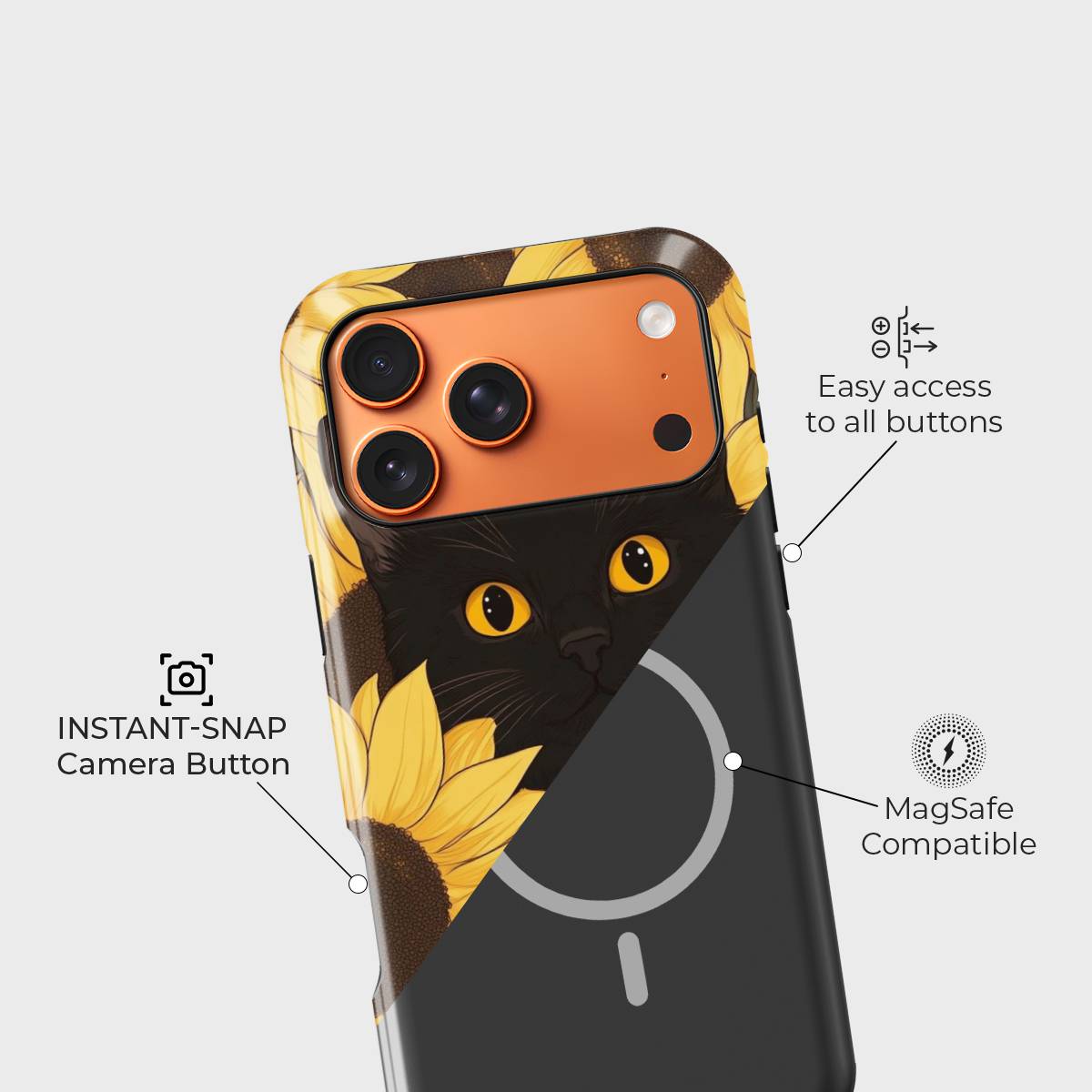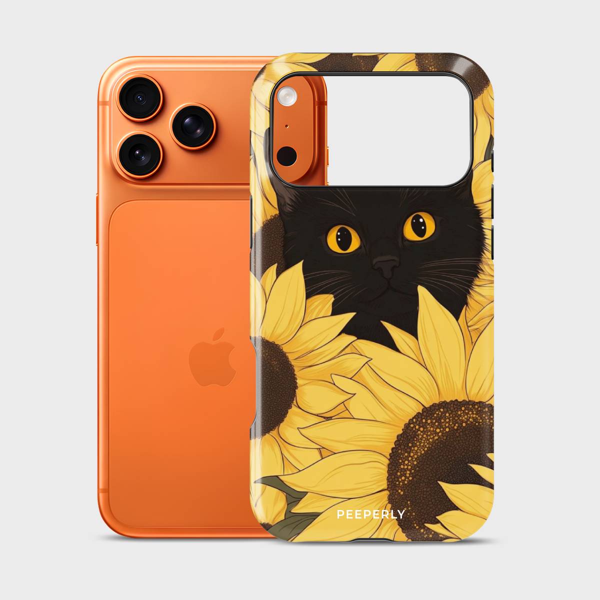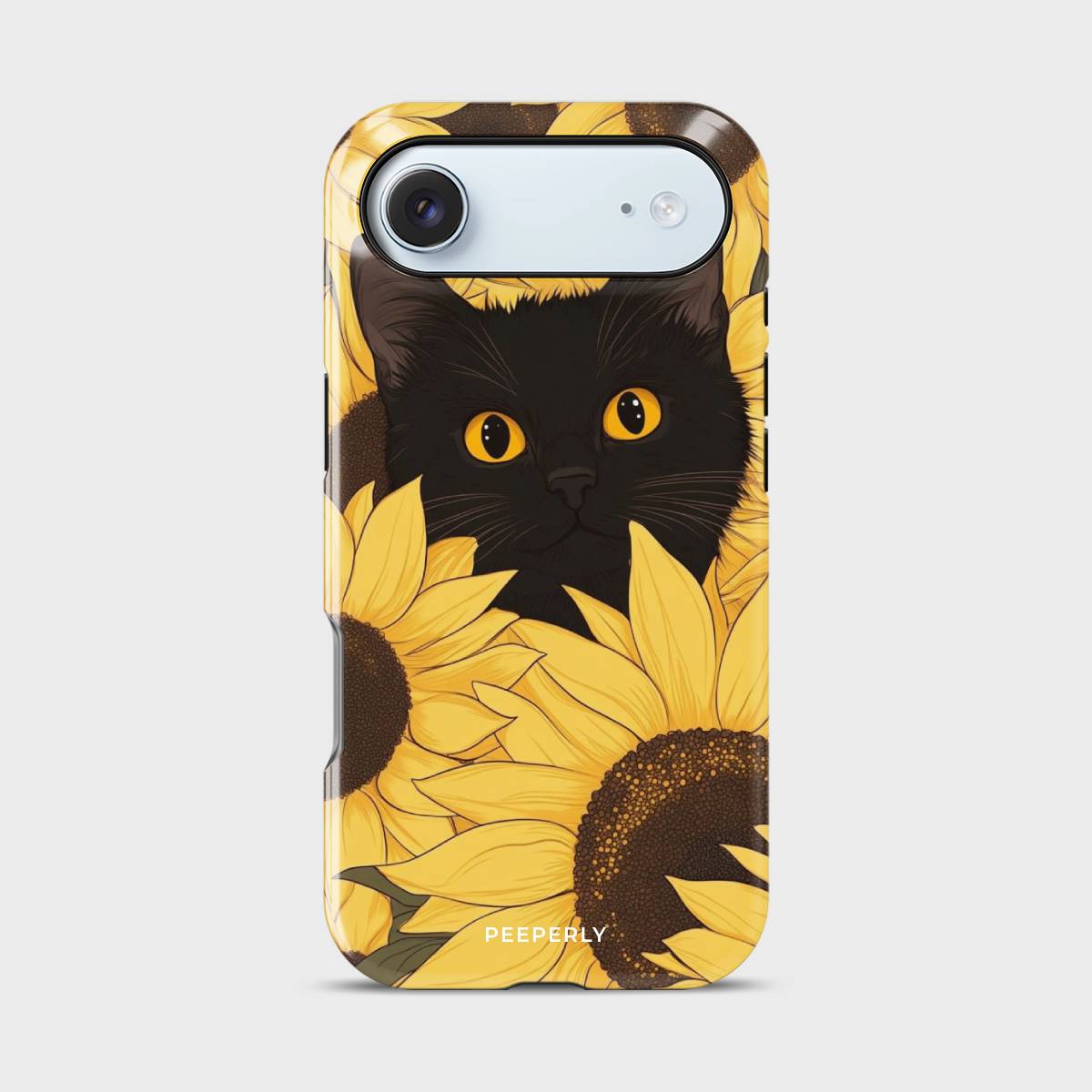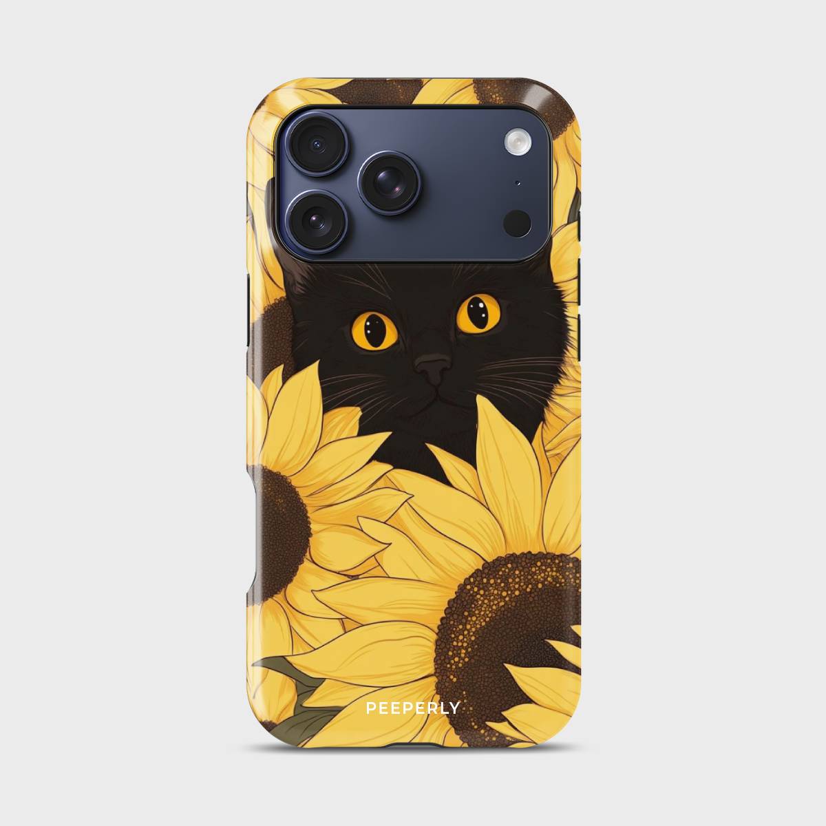 Bask in the warm glow of sunshine and charm with the Meow in Sunflower phone case. Featuring a captivating black cat with striking amber eyes peeking through a field of vibrant golden sunflowers, this design perfectly blends elegance with playfulness.