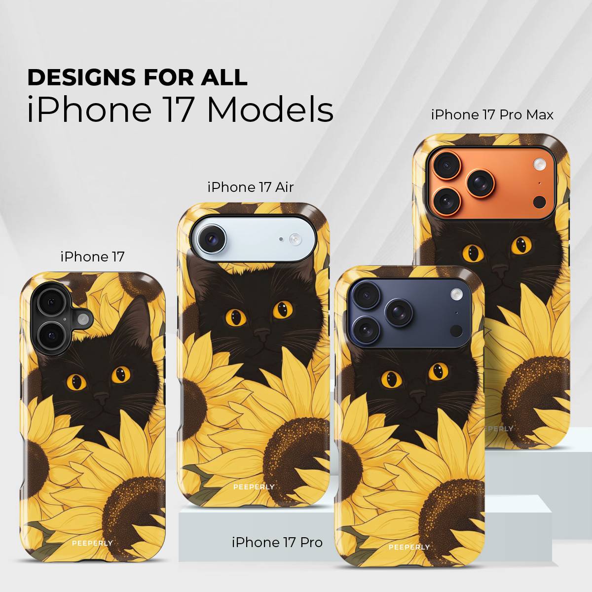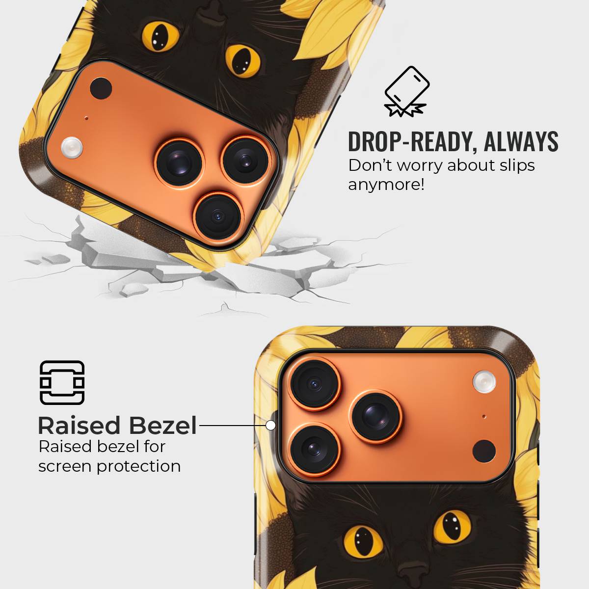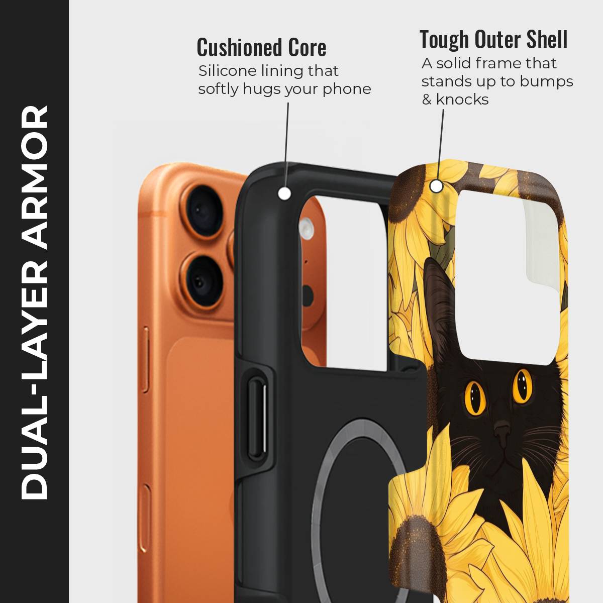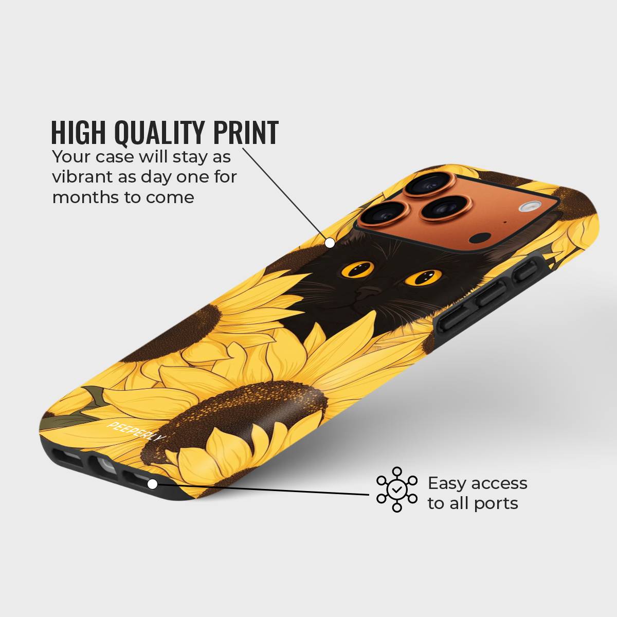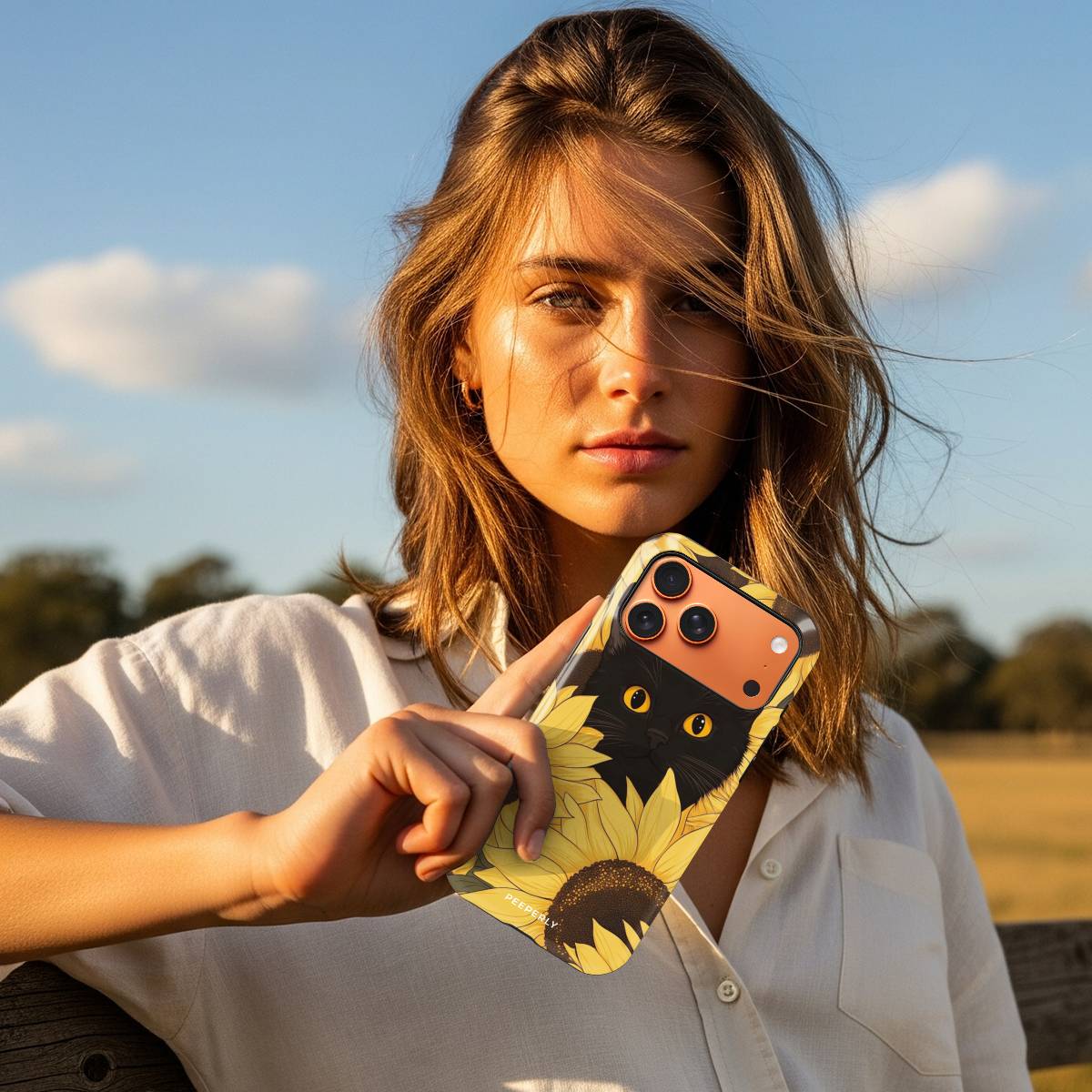Bask in the warm glow of sunshine and charm with the Meow in Sunflower phone case. Featuring a captivating black cat with striking amber eyes peeking through a field of vibrant golden sunflowers, this design perfectly blends elegance with playfulness.