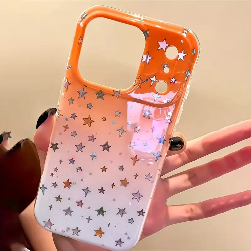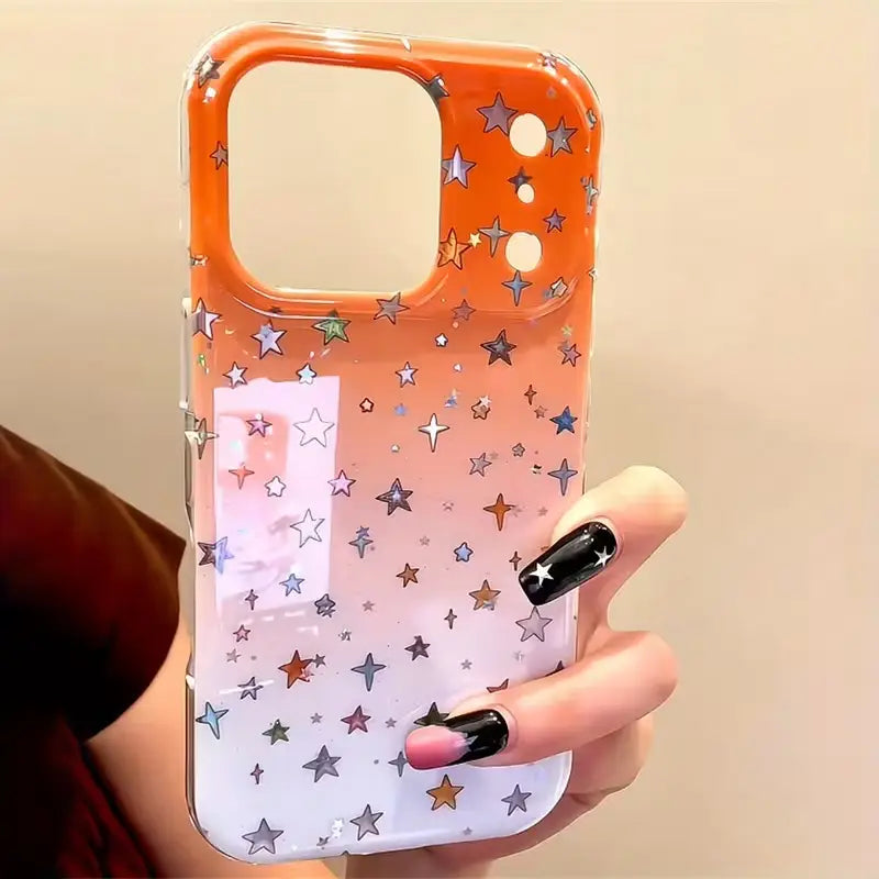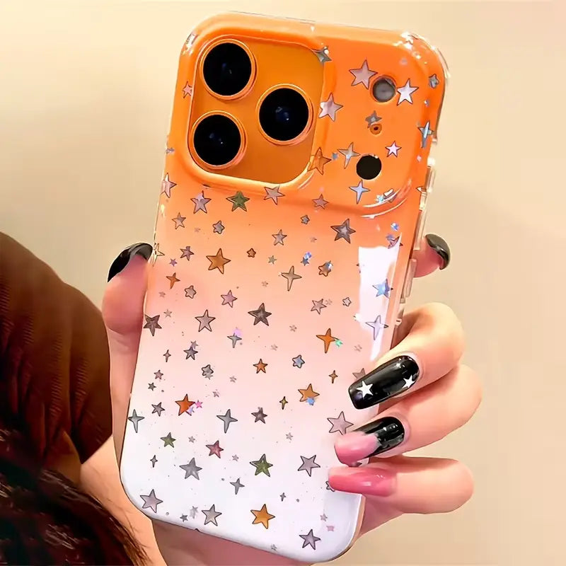 The Galaxy Fade Sparkle Star Case blends cosmic charm with radiant elegance, featuring a smooth orange-to-white gradient sprinkled with holographic stars that shift and shimmer with every movement. Designed to make your phone look magical, this case adds a dreamy galaxy-inspired aesthetic while keeping your device protected and stylish.