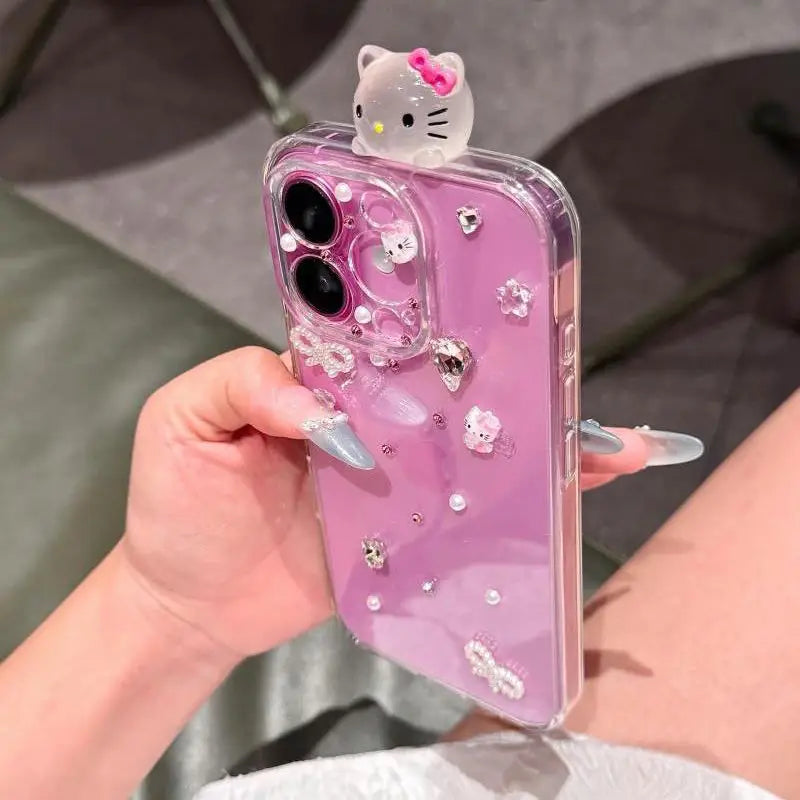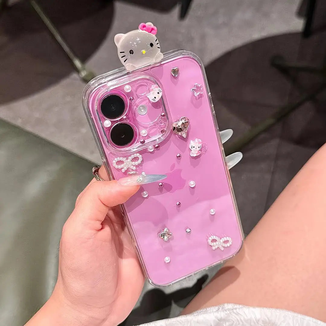 This dazzling phone case features an adorable 3D kitty charm surrounded by sparkling crystals, tiny pearls, and delicate bows, giving your phone a true princess-worthy makeover. The clear base with a pink backdrop lets your phone’s beauty shine through while adding a touch of luxury and fun.