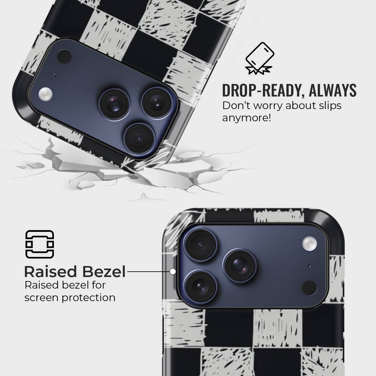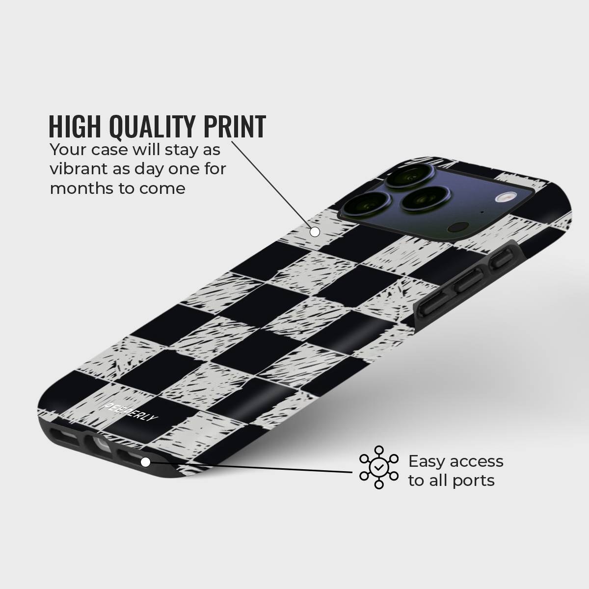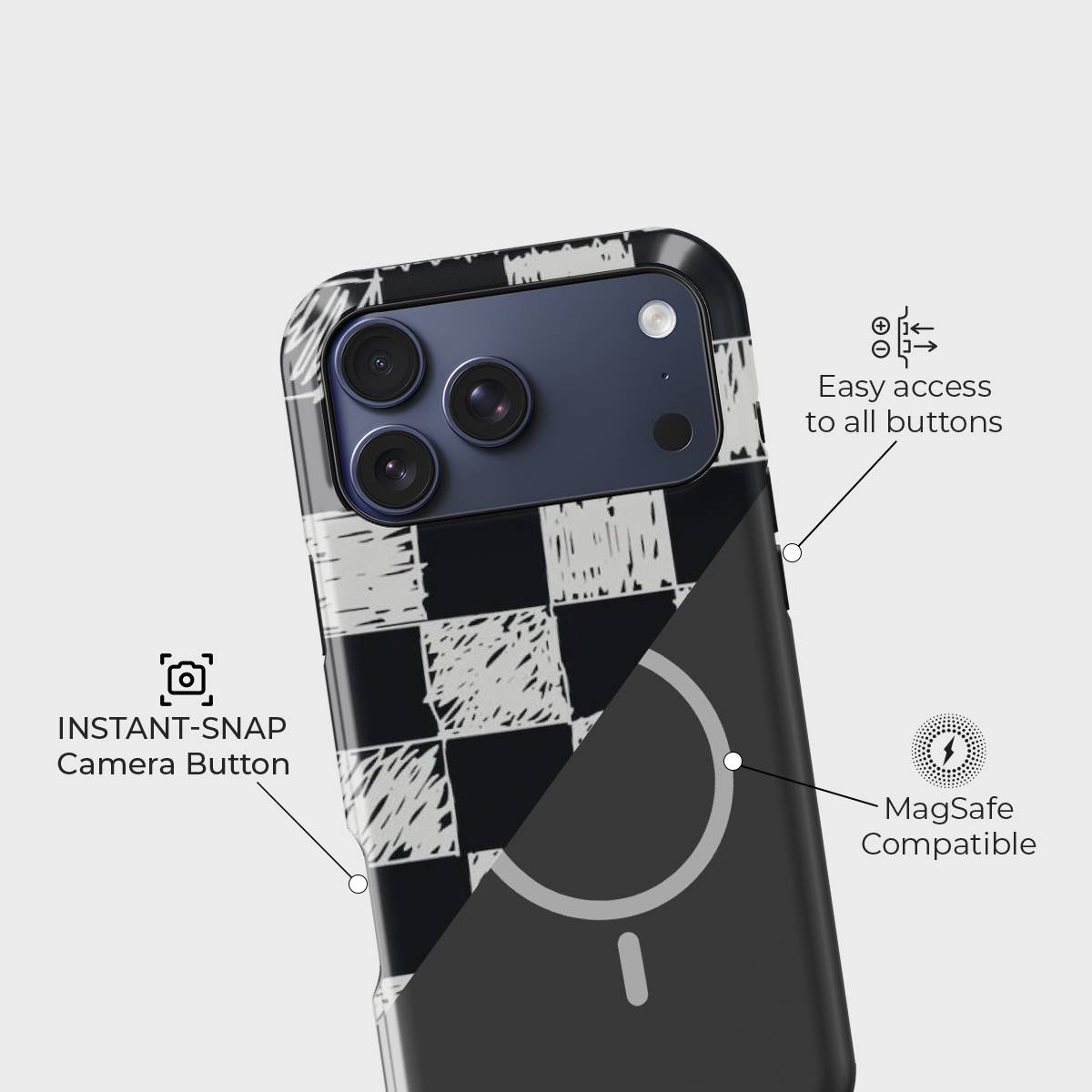 Edgy meets artistic in the Charcoal Check phone case. Featuring a hand-drawn checkerboard pattern in classic black and off-white tones, this design captures the raw essence of sketchbook creativity.