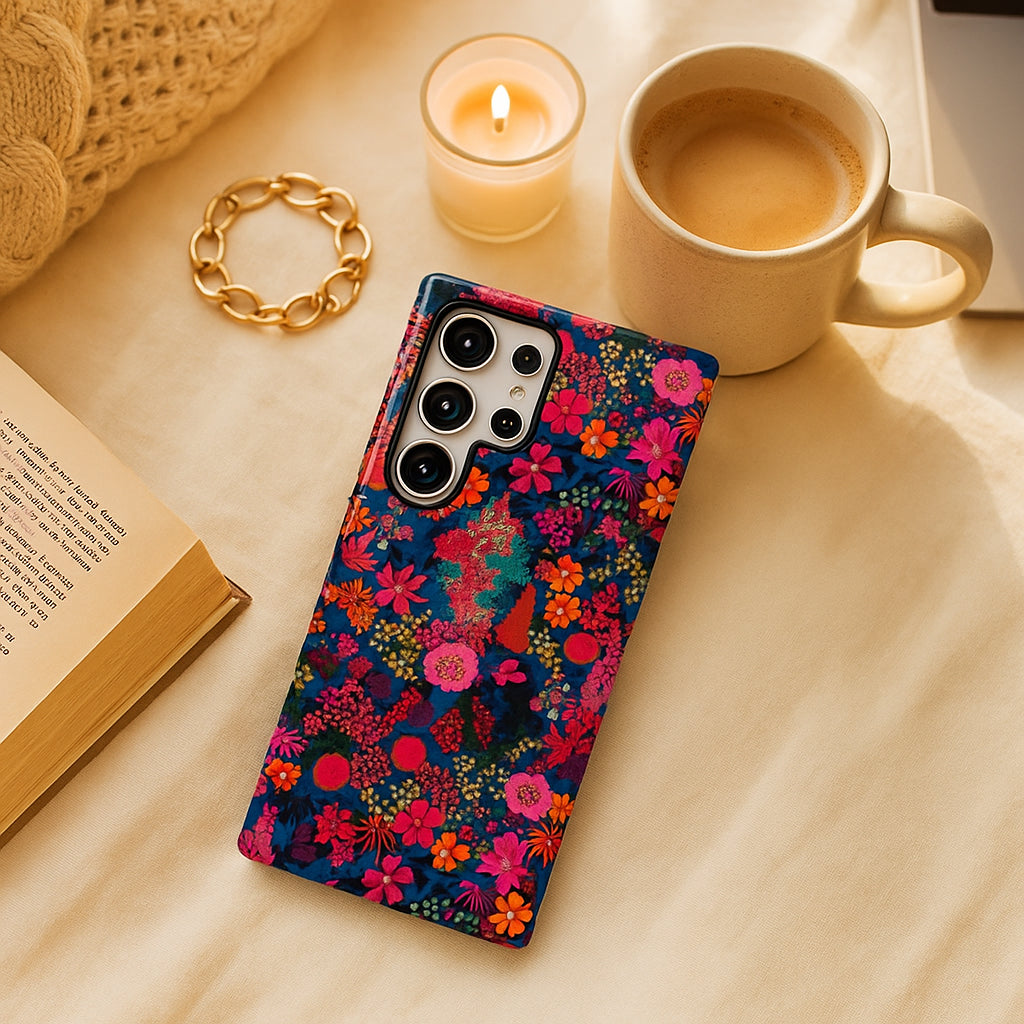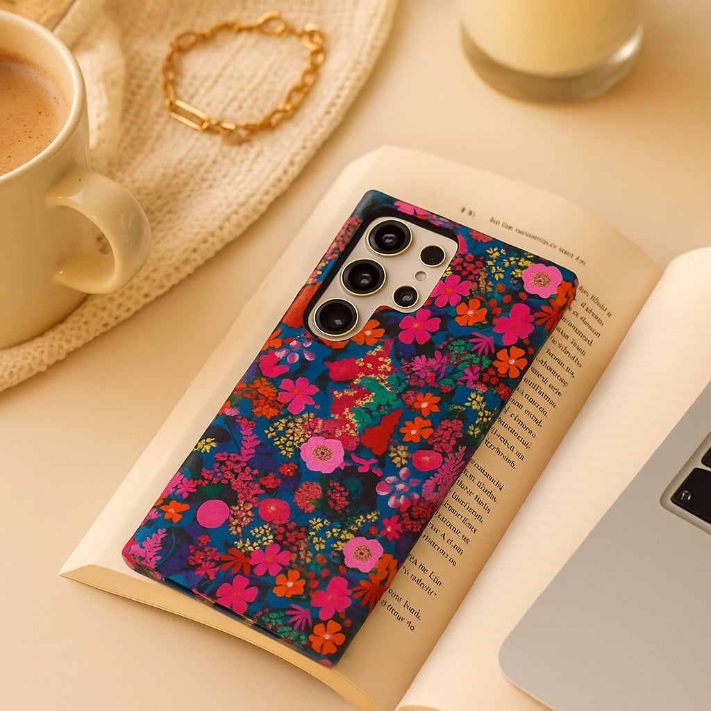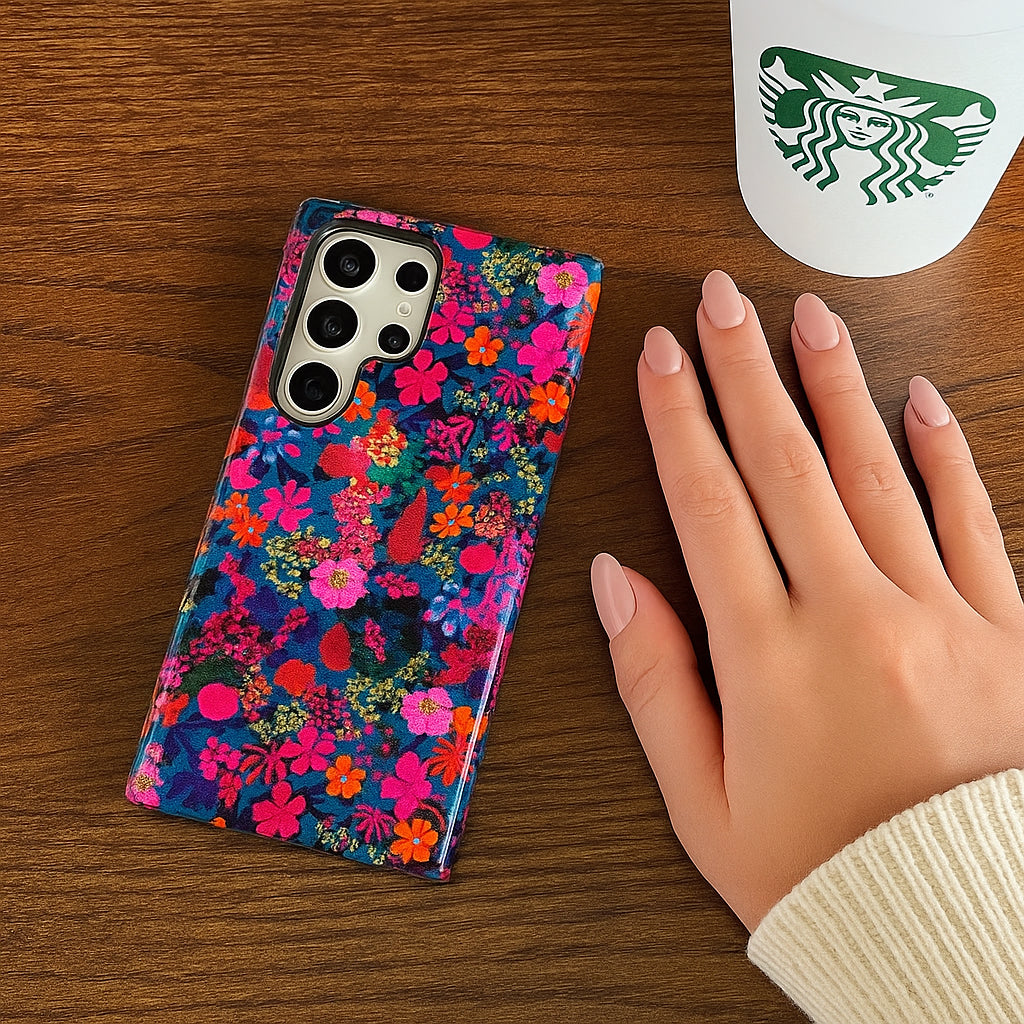 The Bloom Mirage case is where artistry meets vibrance — an explosion of florals that seem to dance under shifting light. With a kaleidoscope of bold hues — magenta, coral, teal, and gold — this design evokes the magic of a blooming paradise glimpsed through a dream.