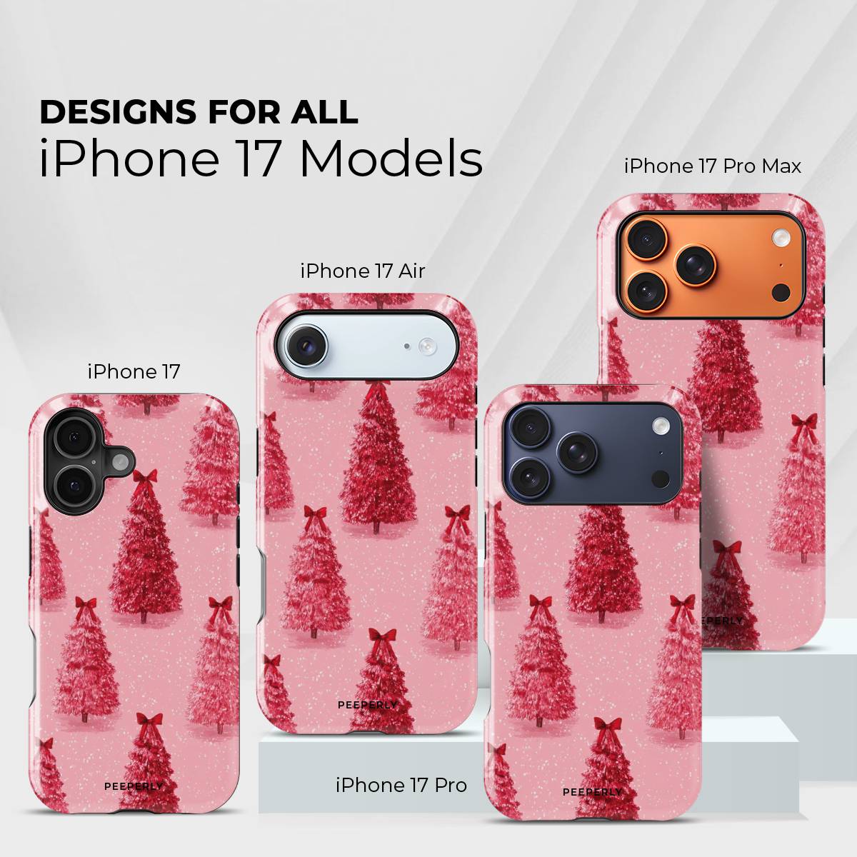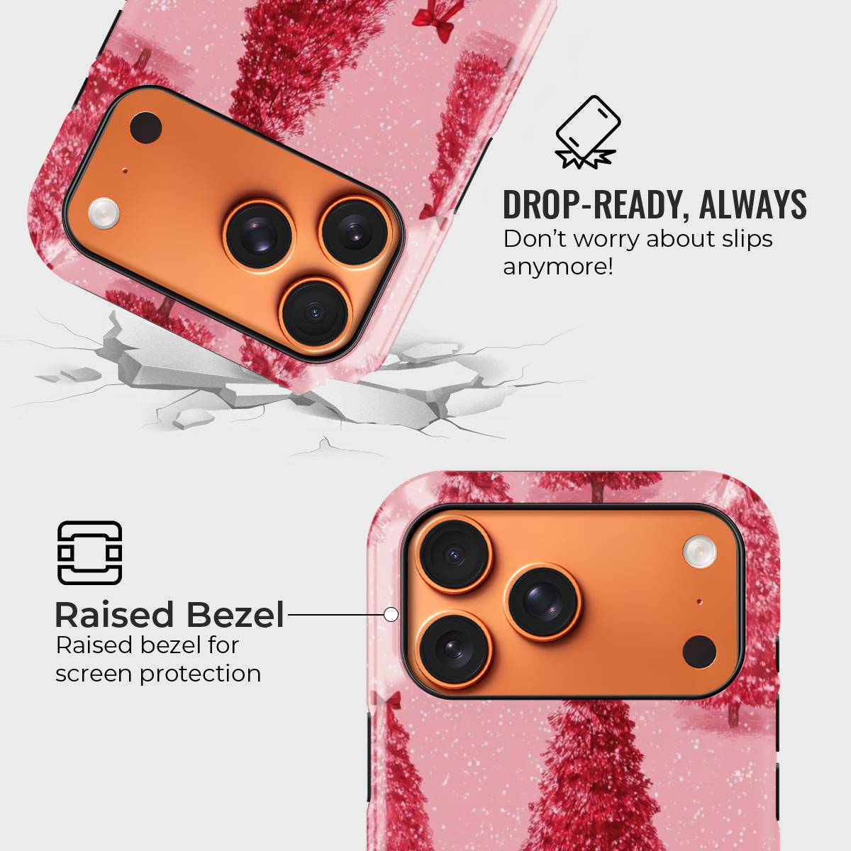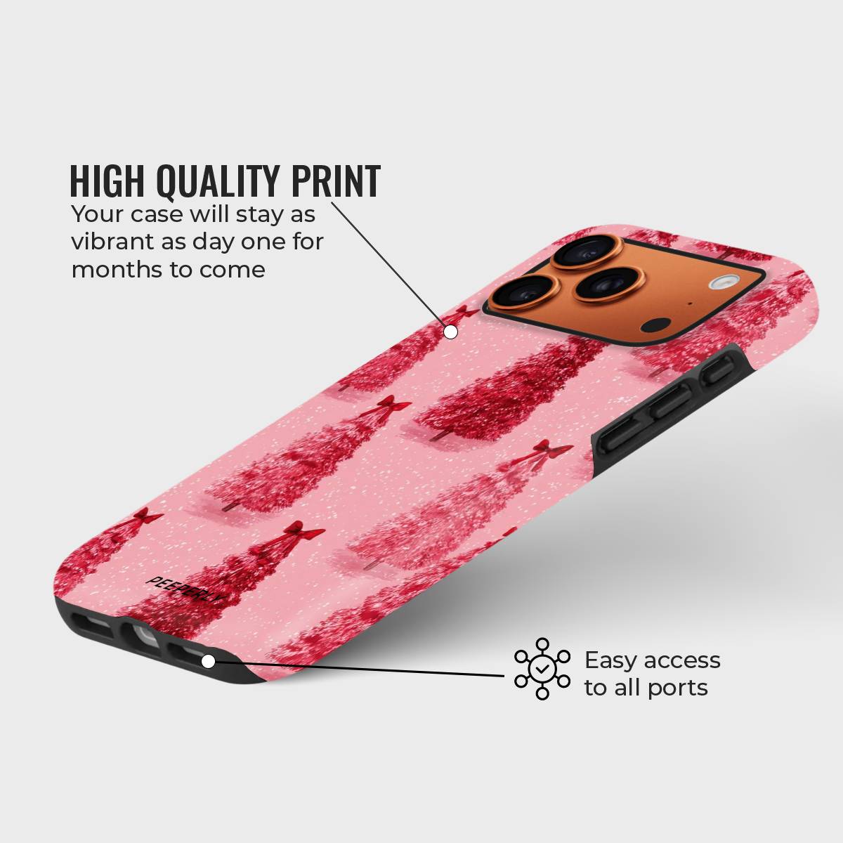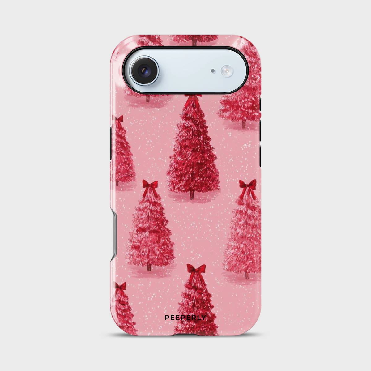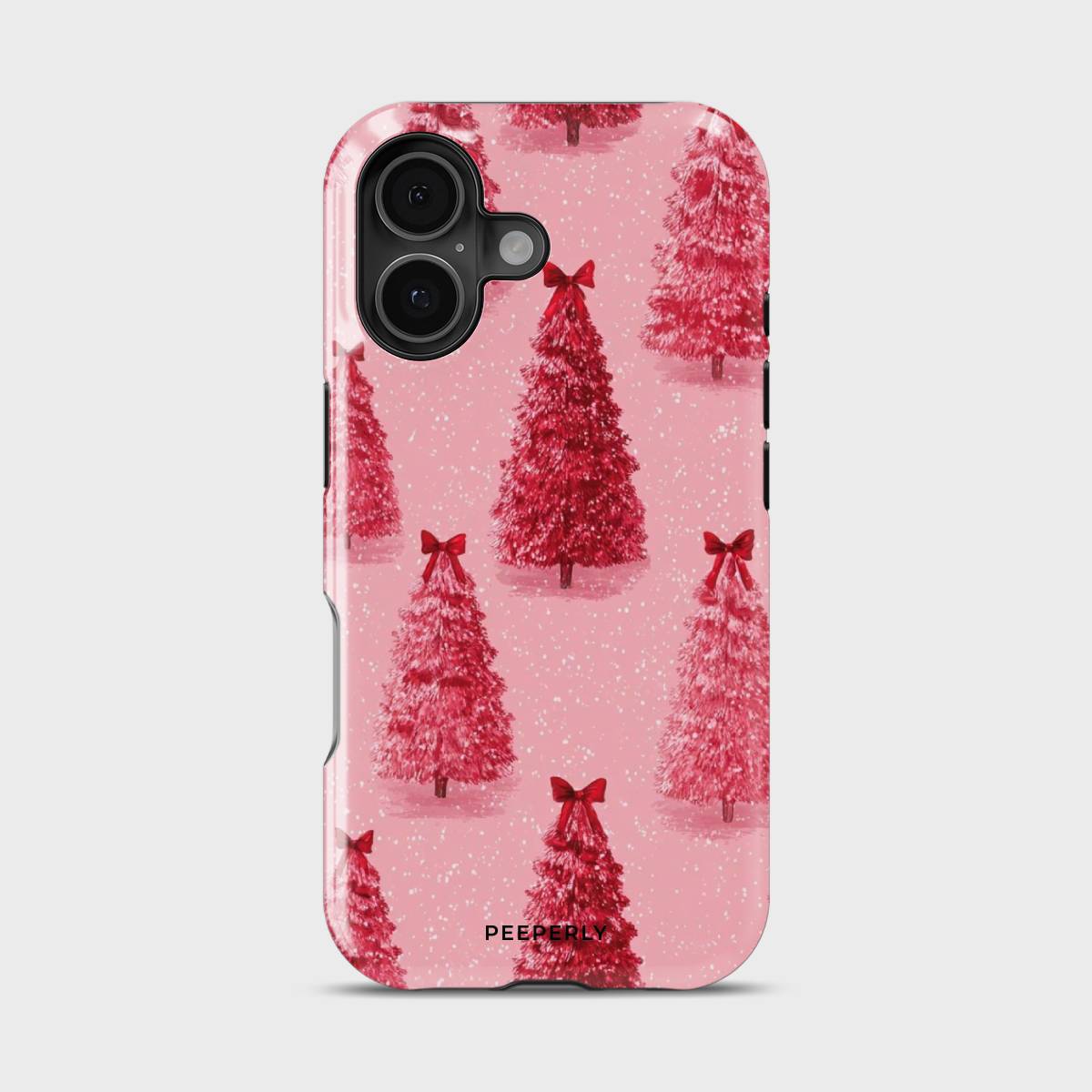 Celebrate the season with soft charm and feminine festivity. This delightful phone case features rows of rosy pink Christmas trees topped with dainty bows, all set against a gentle snowfall backdrop.