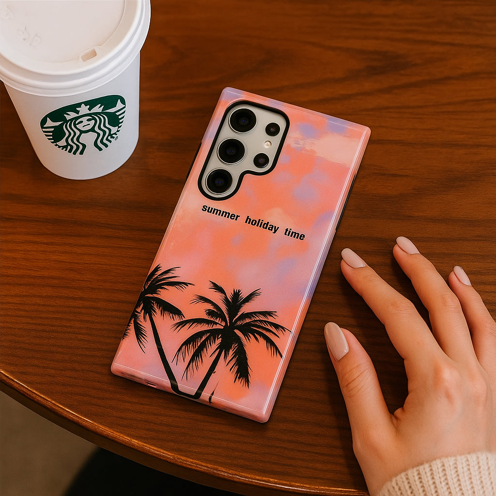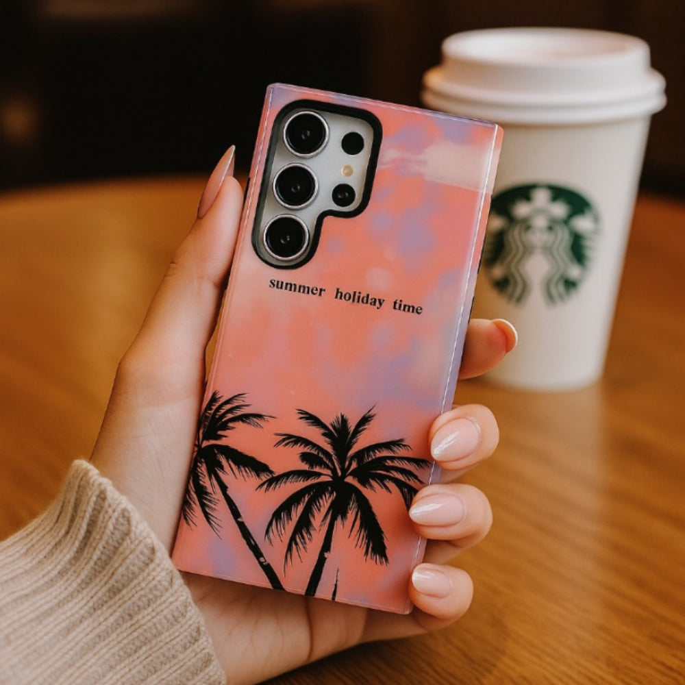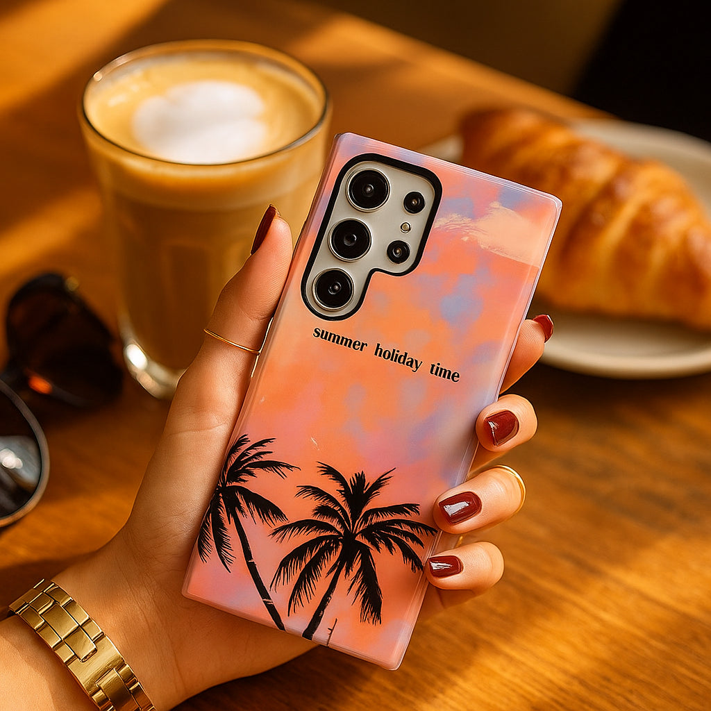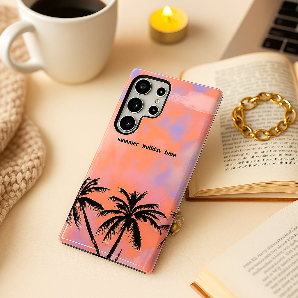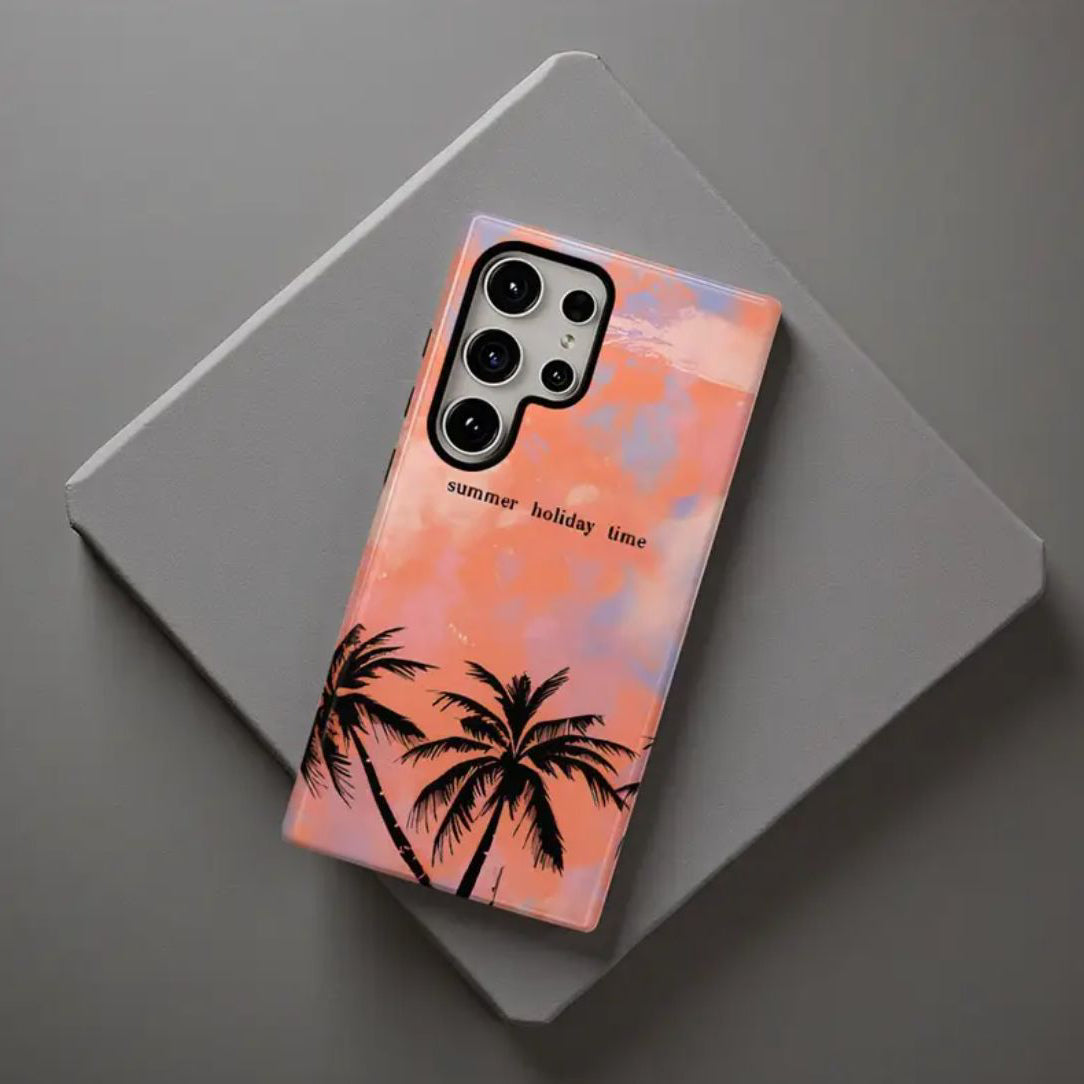 The Holiday Time case captures the carefree essence of sun-drenched days, palm trees swaying in warm breezes, and skies painted in hues of peach and lavender. With its dreamy tropical sunset design, it instantly transports you to the golden hour of your favorite beach getaway.