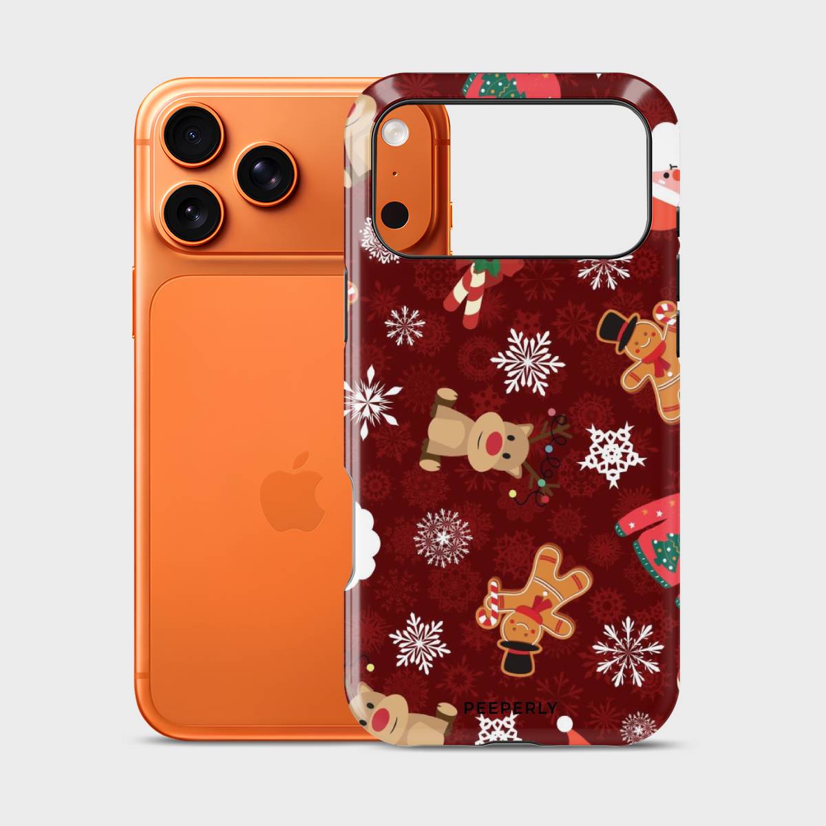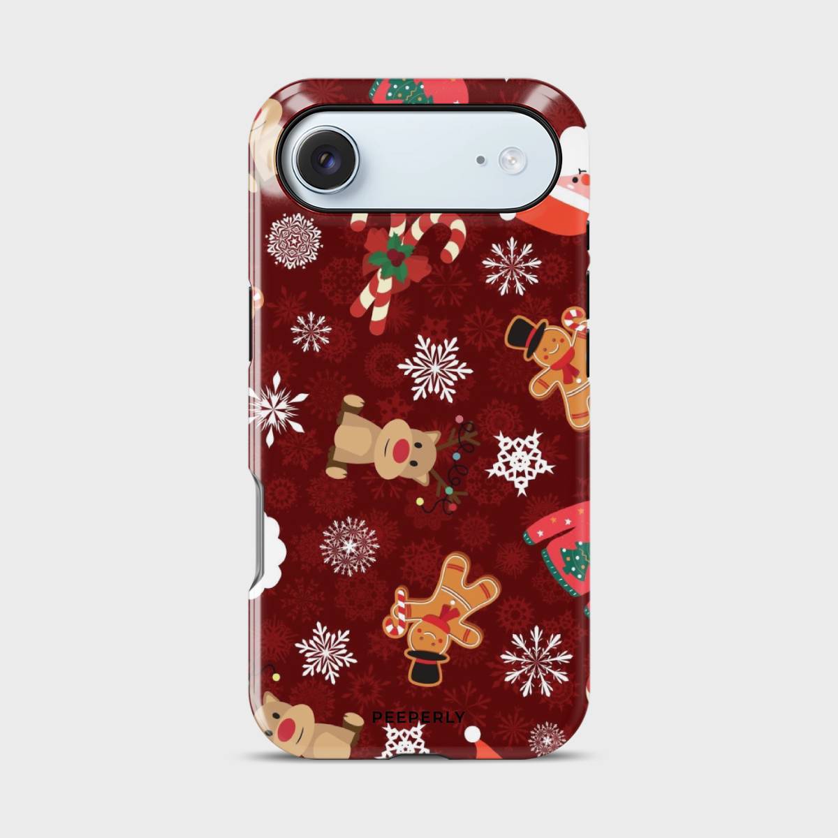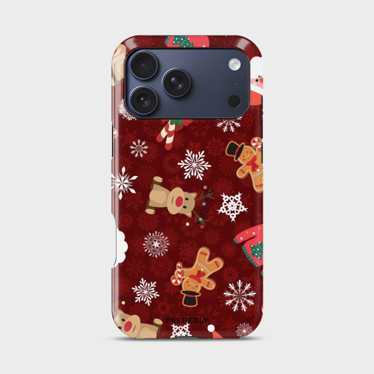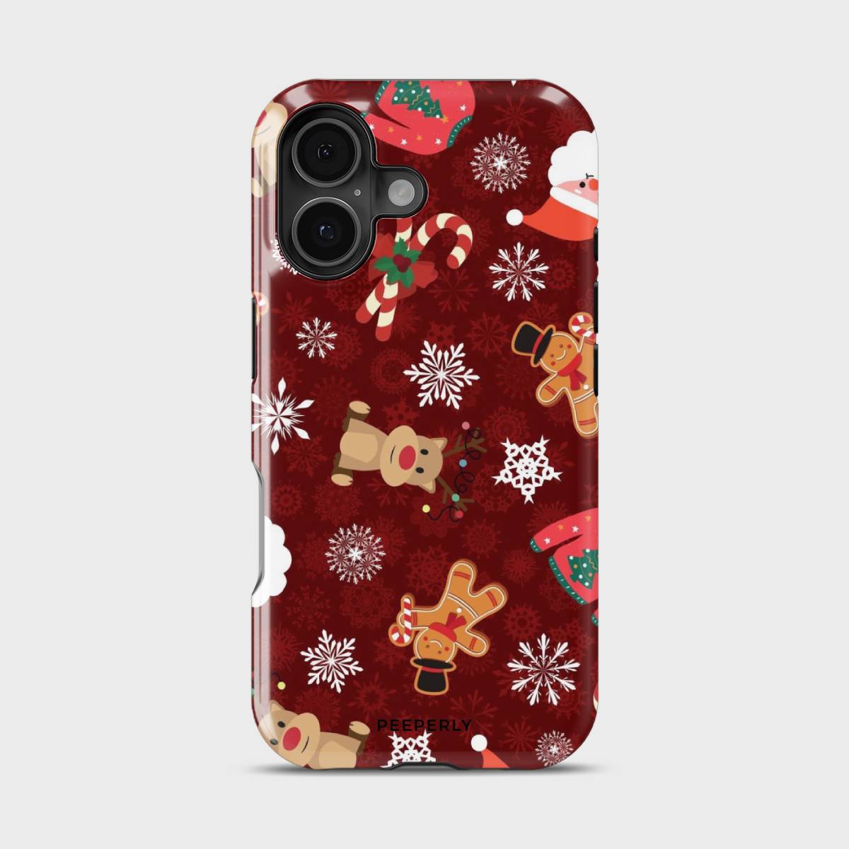 Celebrate the sweetest side of the holidays with this adorable Christmas-themed phone case. Featuring cheerful gingerbread men, playful reindeer, candy canes, and sparkling snowflakes scattered across a rich red background, it captures the cozy, cookie-filled joy of the season.