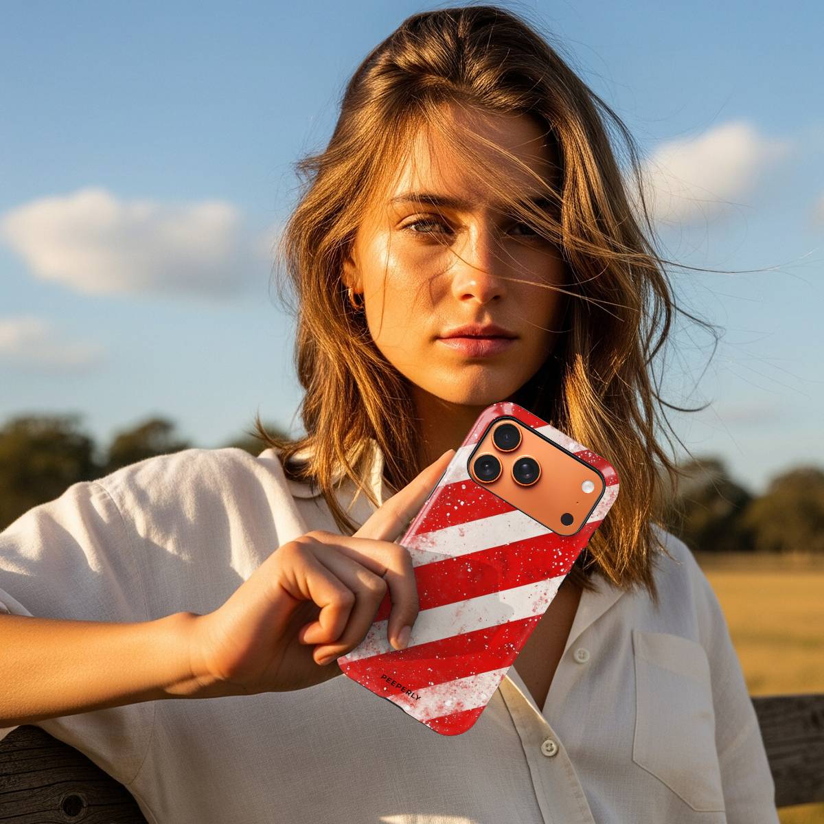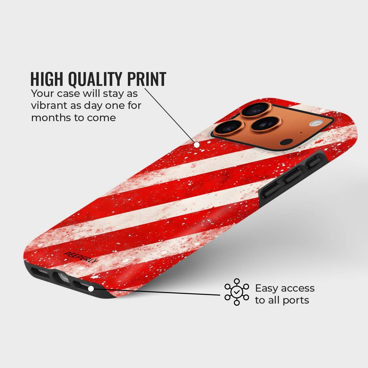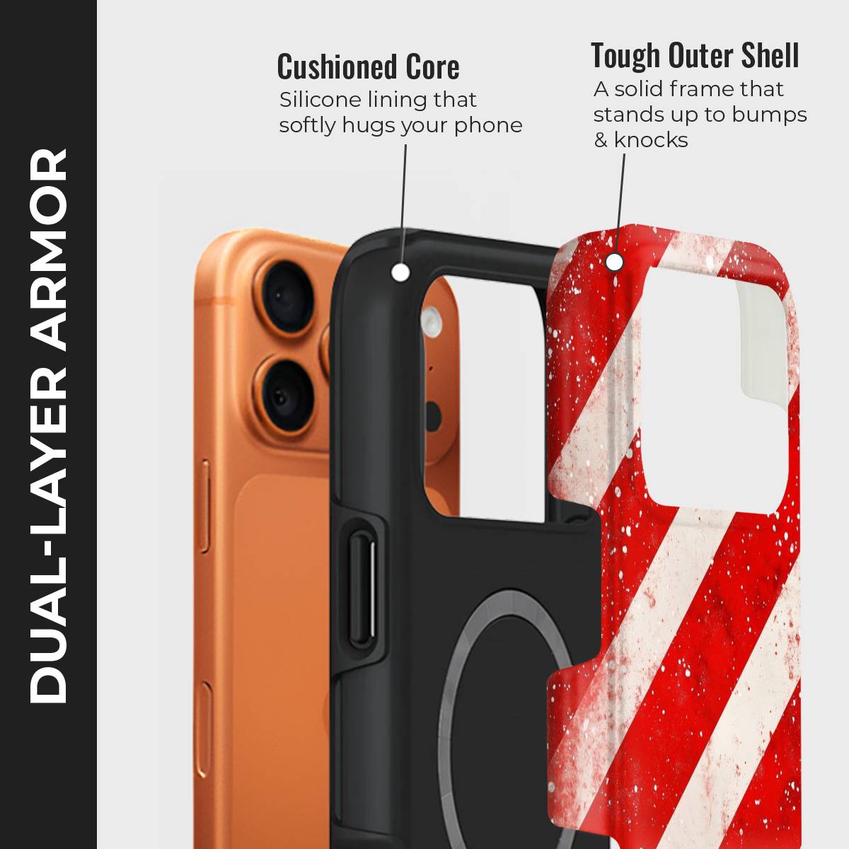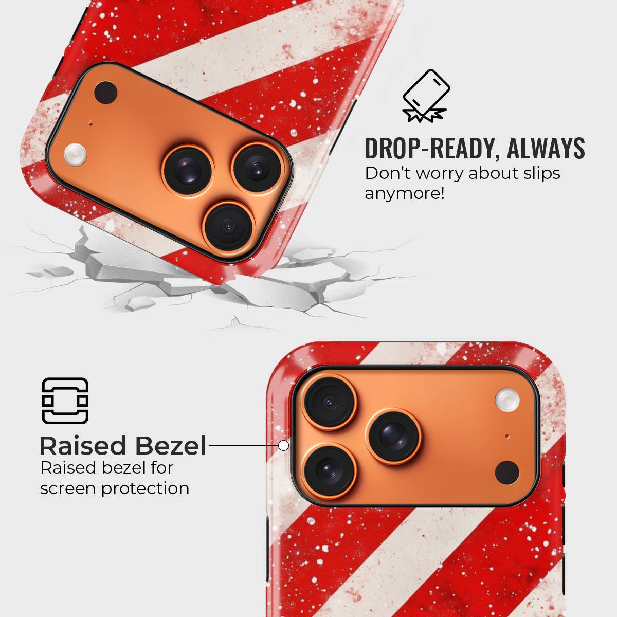 Add a burst of holiday cheer to your phone with this bold candy-cane–inspired case. Featuring vibrant red and white diagonal stripes dusted with a snowy, textured finish, it captures the sweet, playful spirit of the season.
