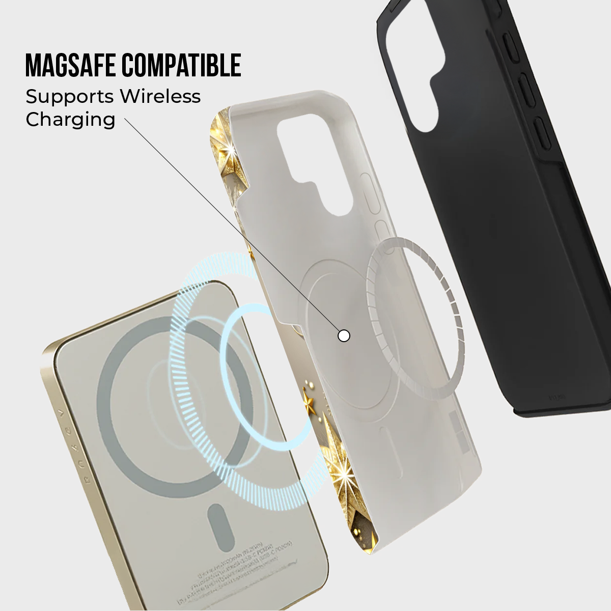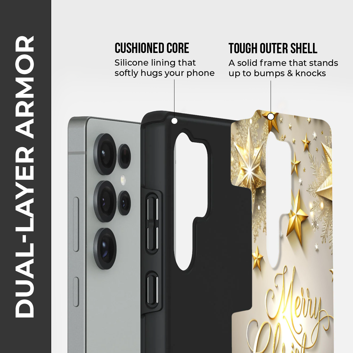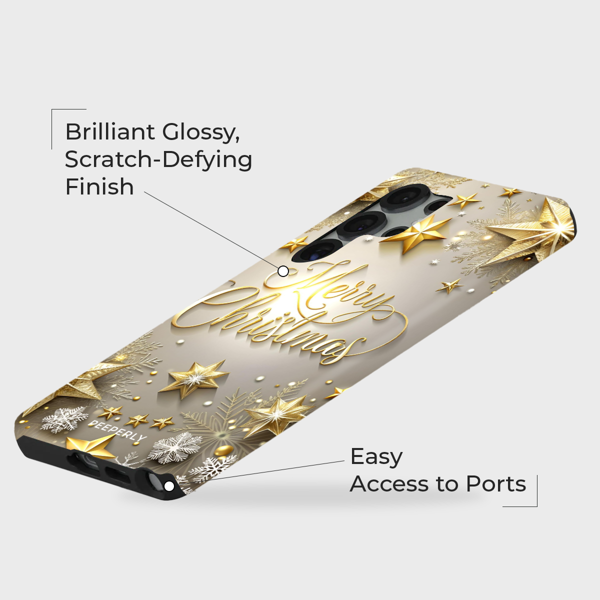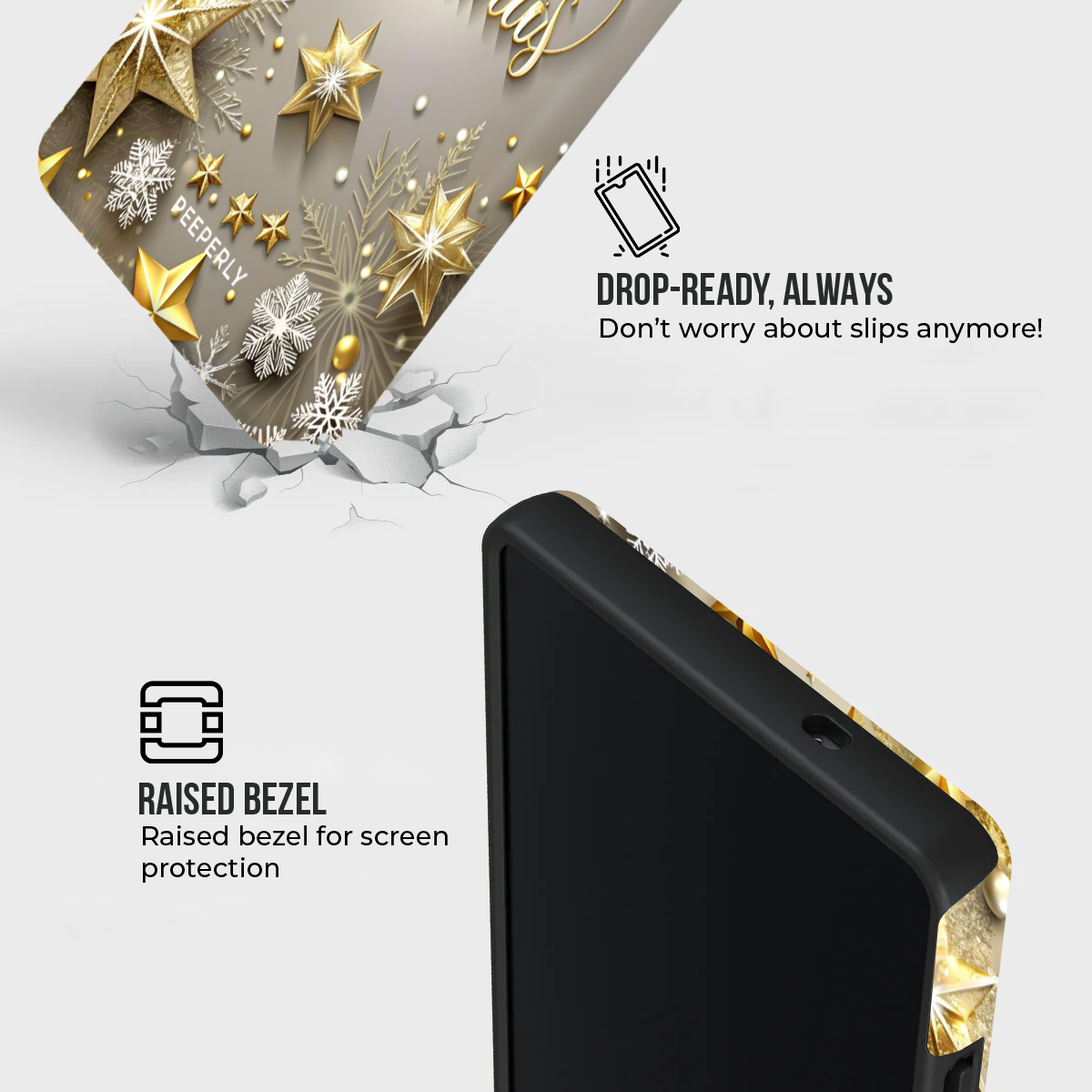 Elevate your holiday spirit with a phone case that shines in timeless elegance. Featuring radiant gold stars, delicate snowflakes, and luxurious festive detailing, this design captures the magic and grandeur of the season.