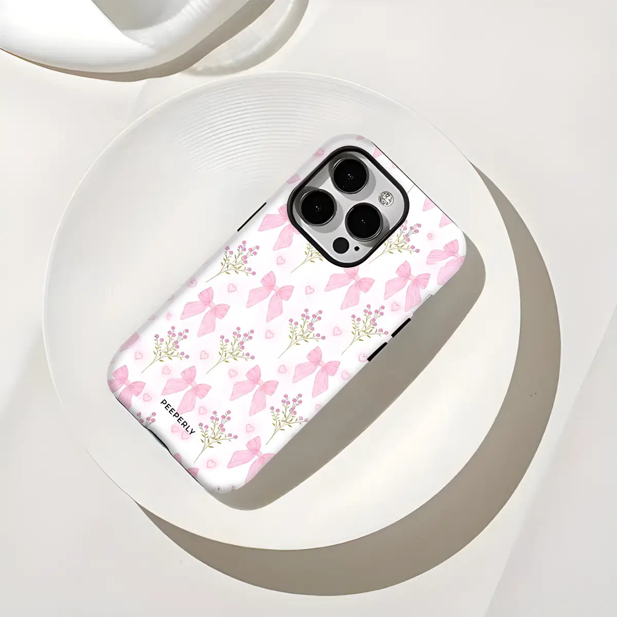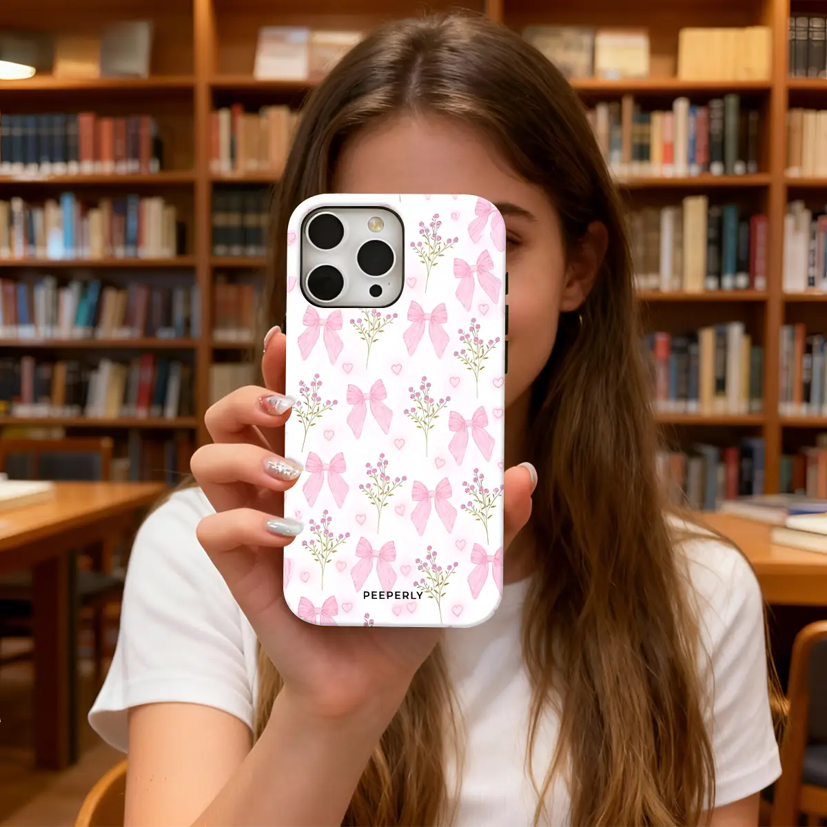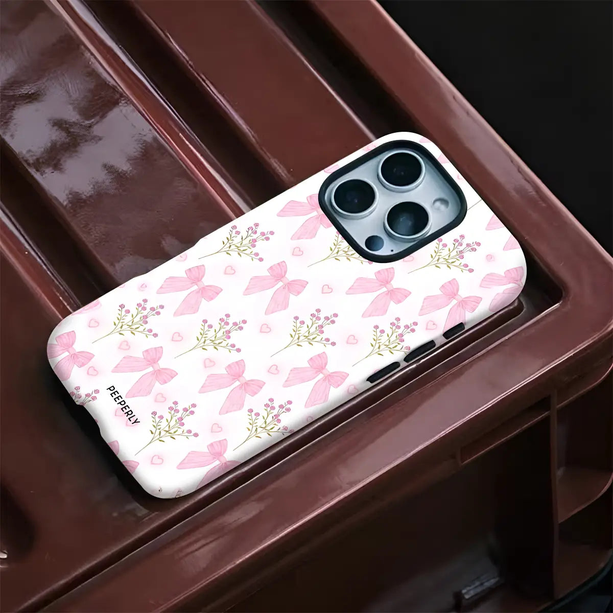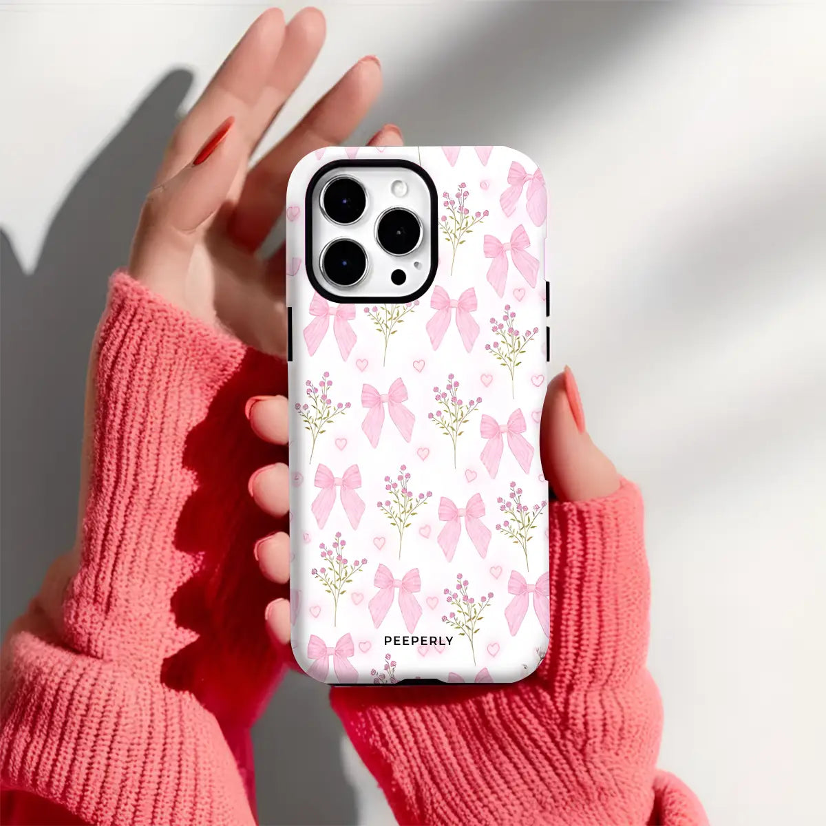 A delicate blend of soft florals and graceful pink ribbons, Blossom Bows brings a sweet, romantic charm to your everyday style. Set against a clean white backdrop, the hand-drawn bows and tiny blossoms create an elegant, feminine look that feels light, airy, and timeless.