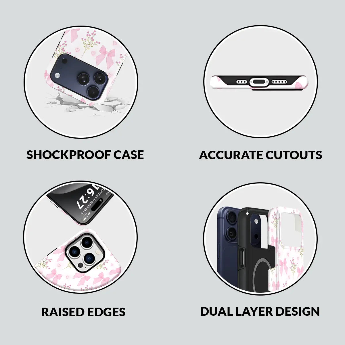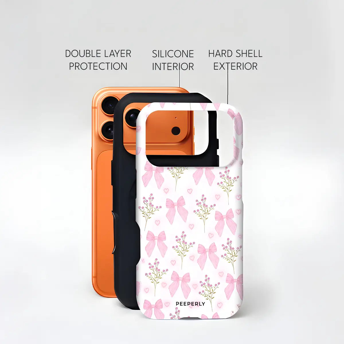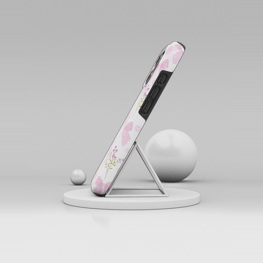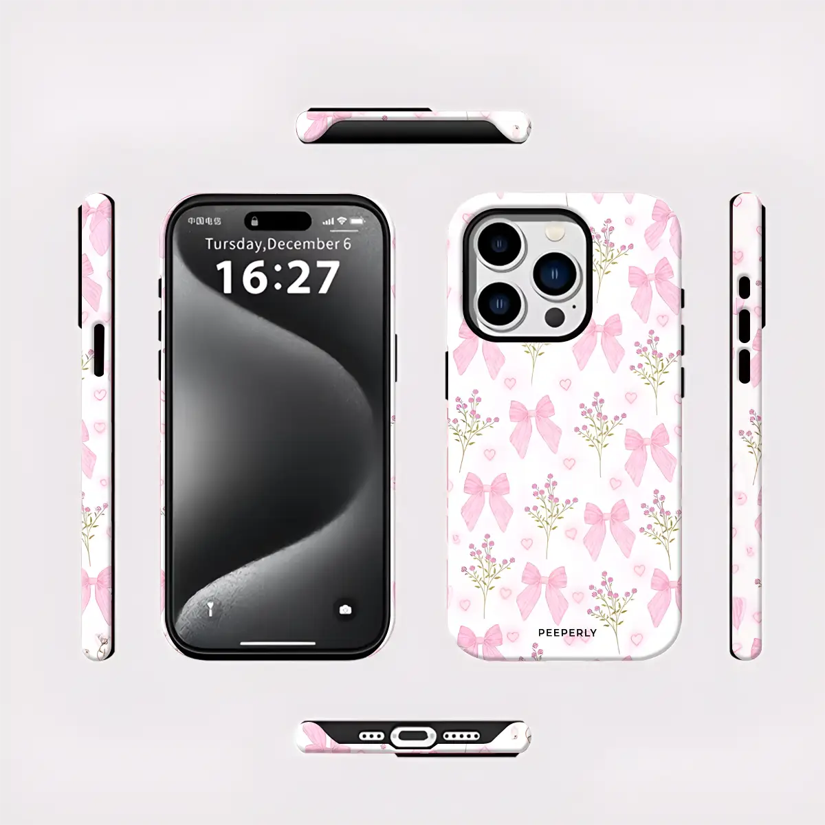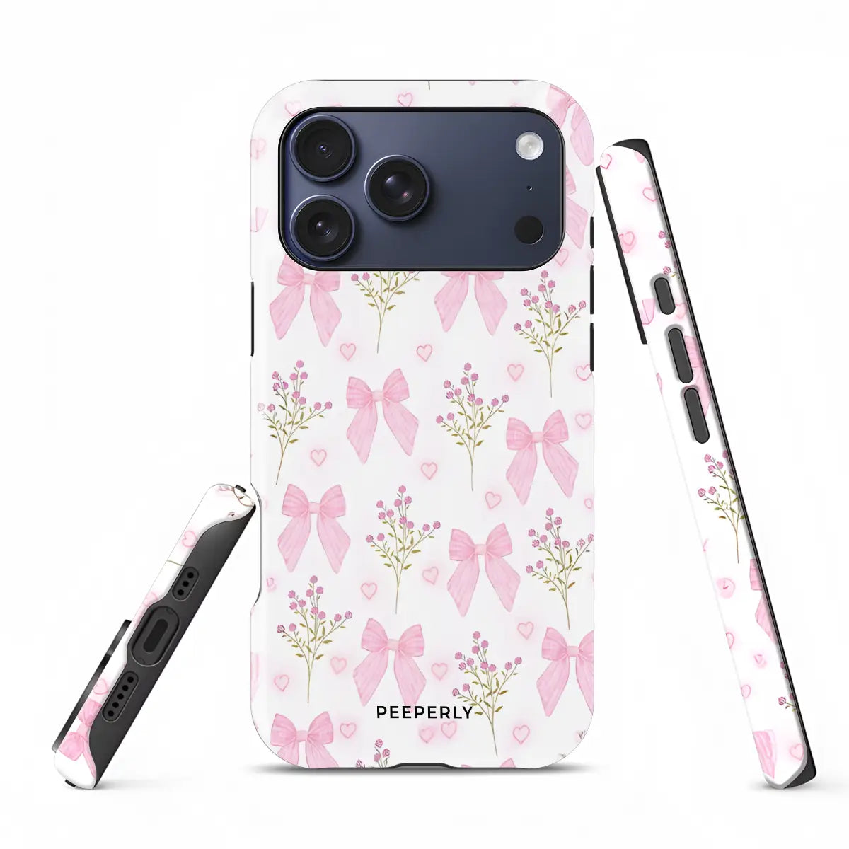 A delicate blend of soft florals and graceful pink ribbons, Blossom Bows brings a sweet, romantic charm to your everyday style. Set against a clean white backdrop, the hand-drawn bows and tiny blossoms create an elegant, feminine look that feels light, airy, and timeless.