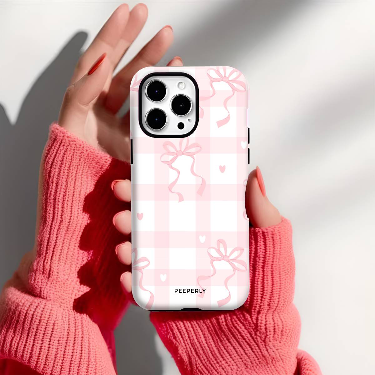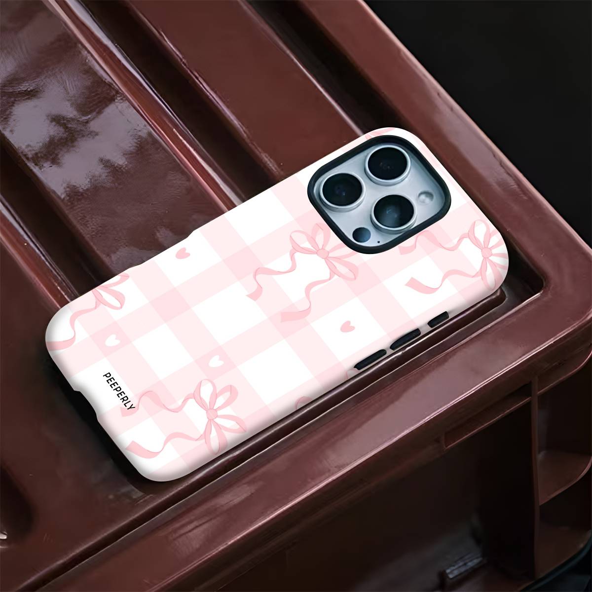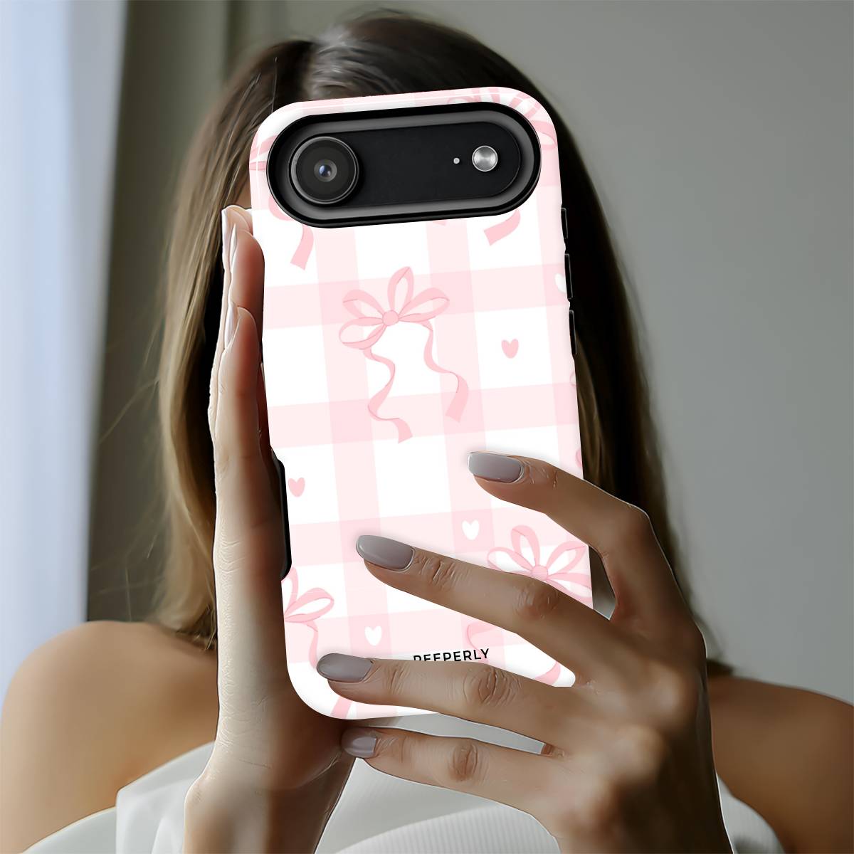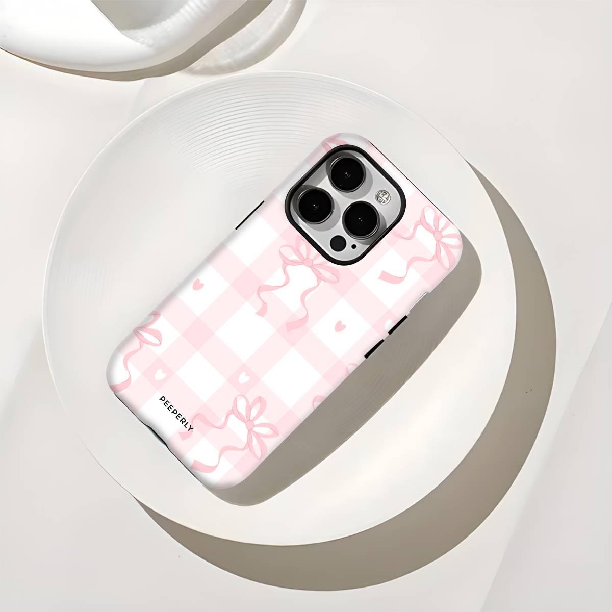 Delicate bows meet a classic grid pattern in the Grid Ribbons Case. Designed with soft pink checks, tiny hearts, and flowing ribbon details, this case brings a charming, gift-wrapped feel to your everyday style.