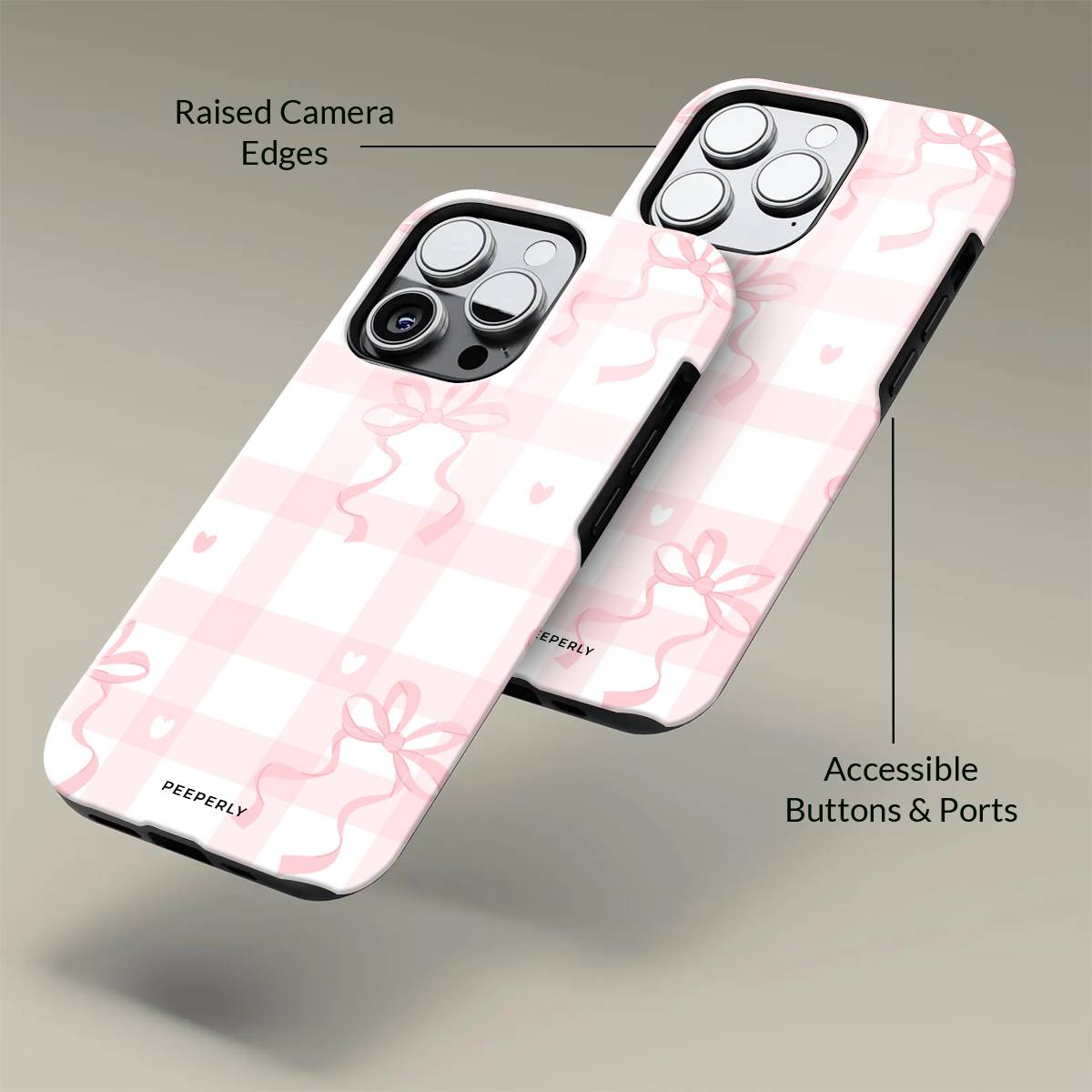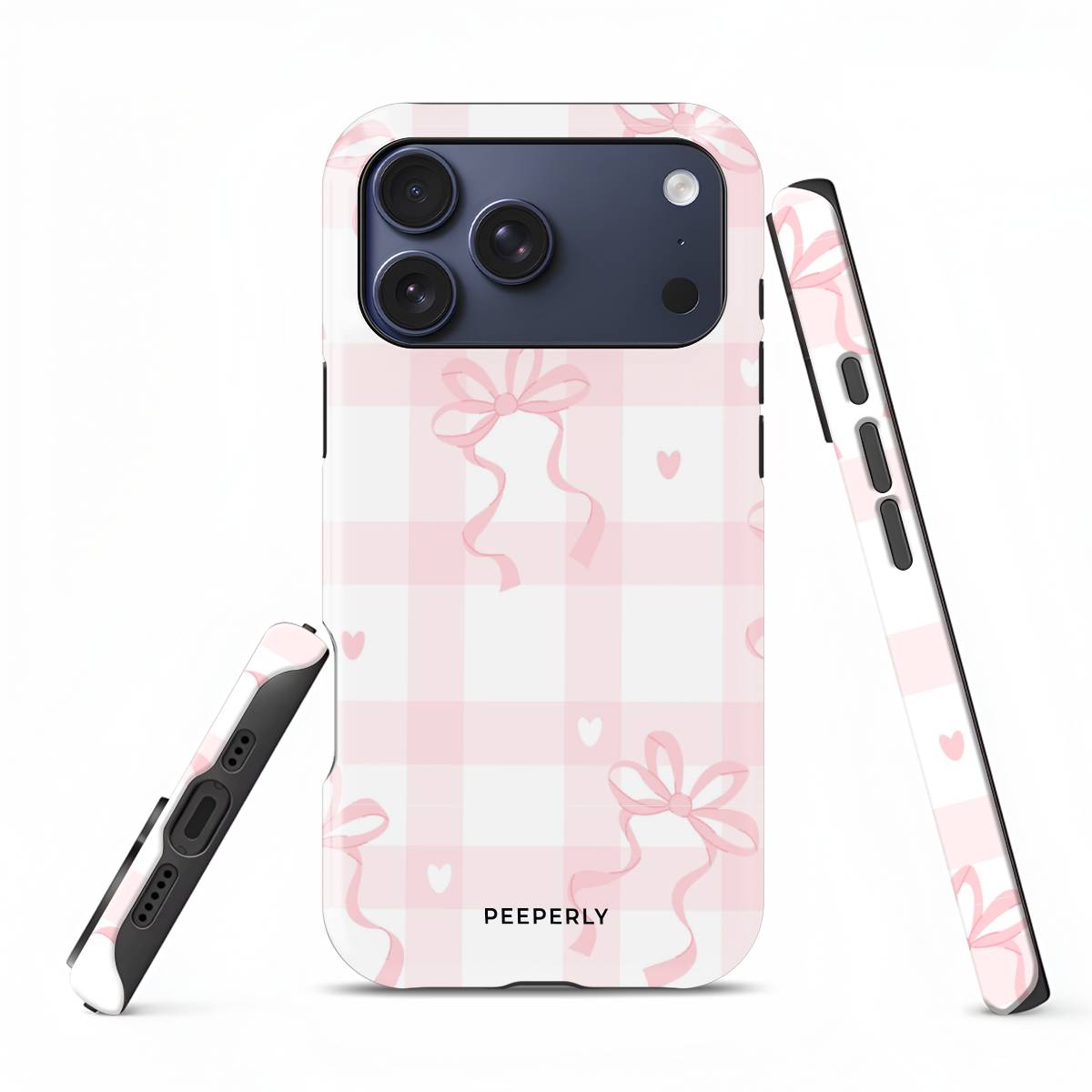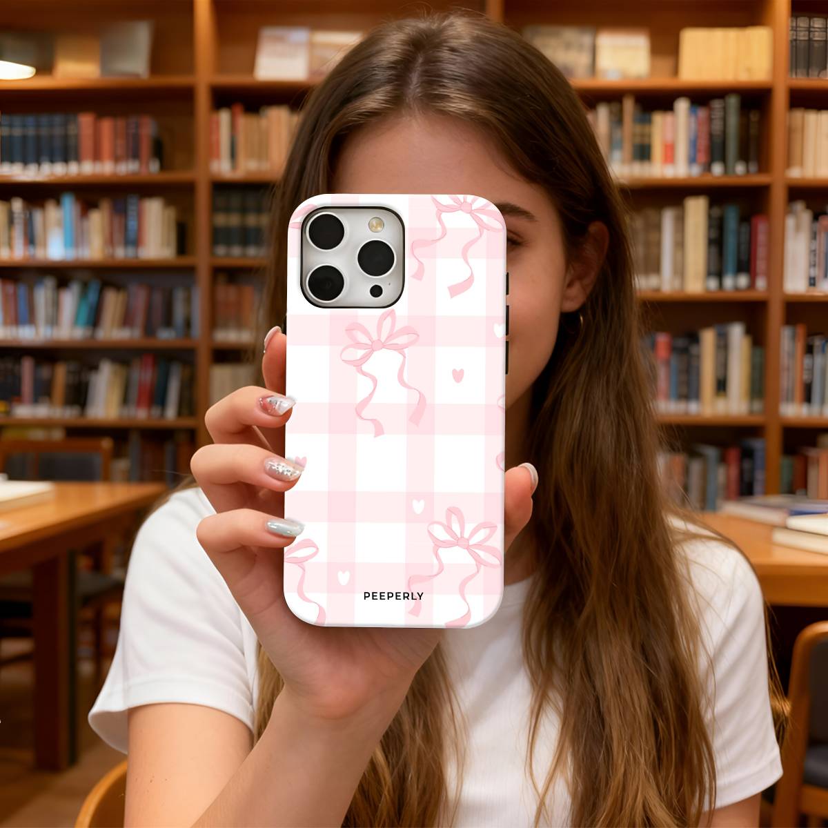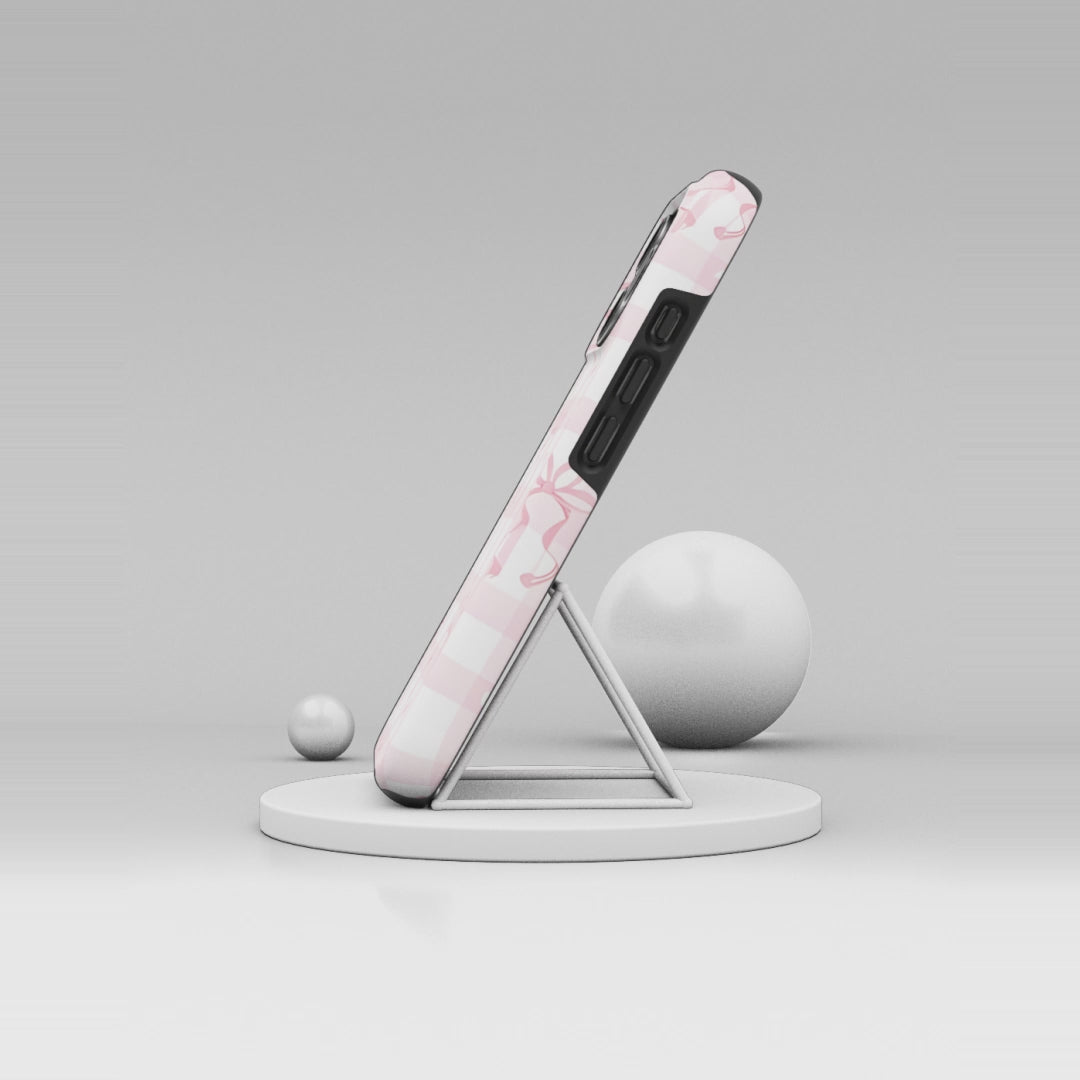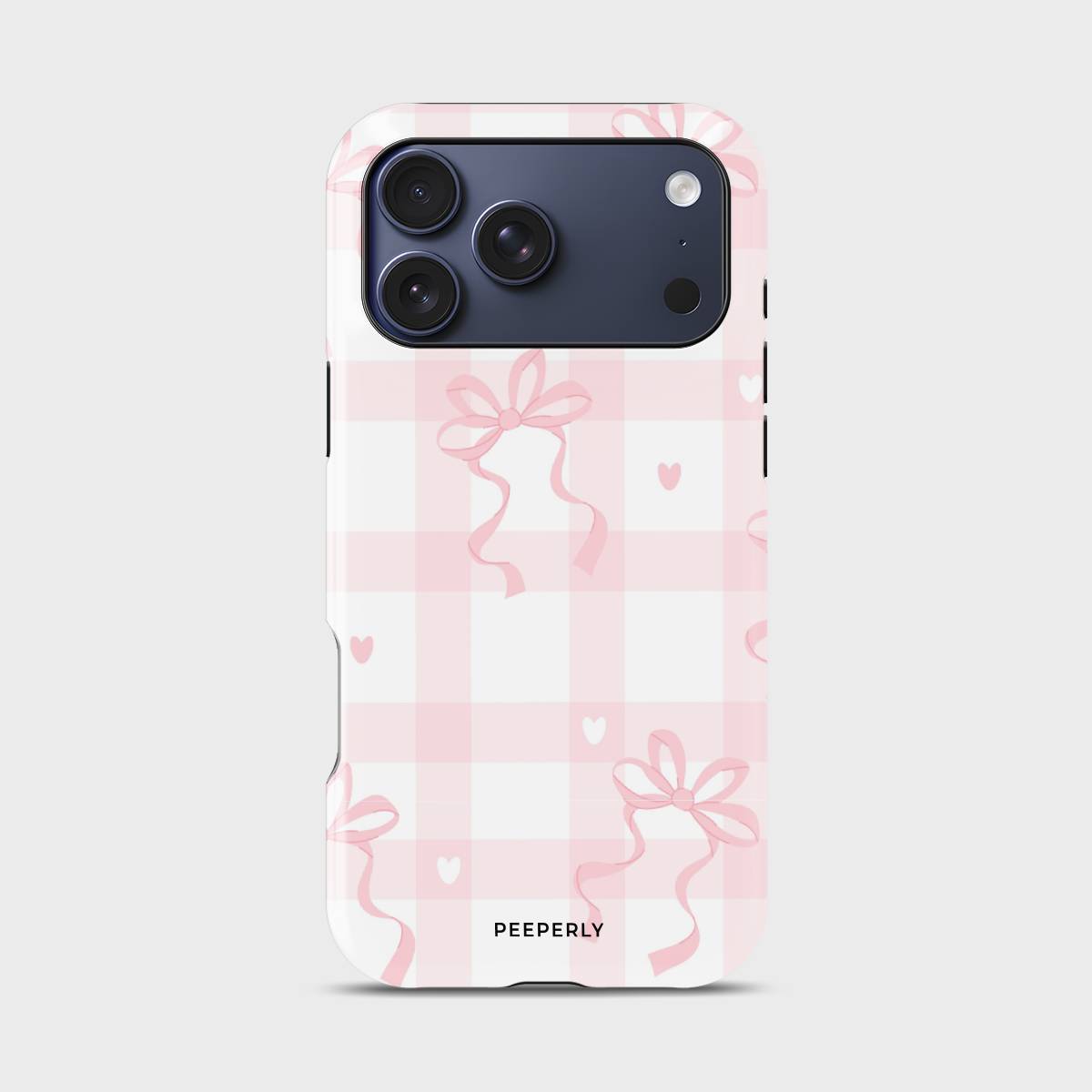 Delicate bows meet a classic grid pattern in the Grid Ribbons Case. Designed with soft pink checks, tiny hearts, and flowing ribbon details, this case brings a charming, gift-wrapped feel to your everyday style.