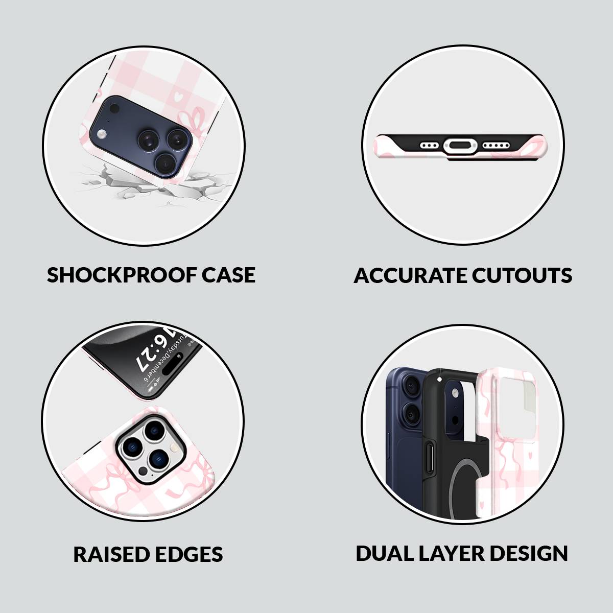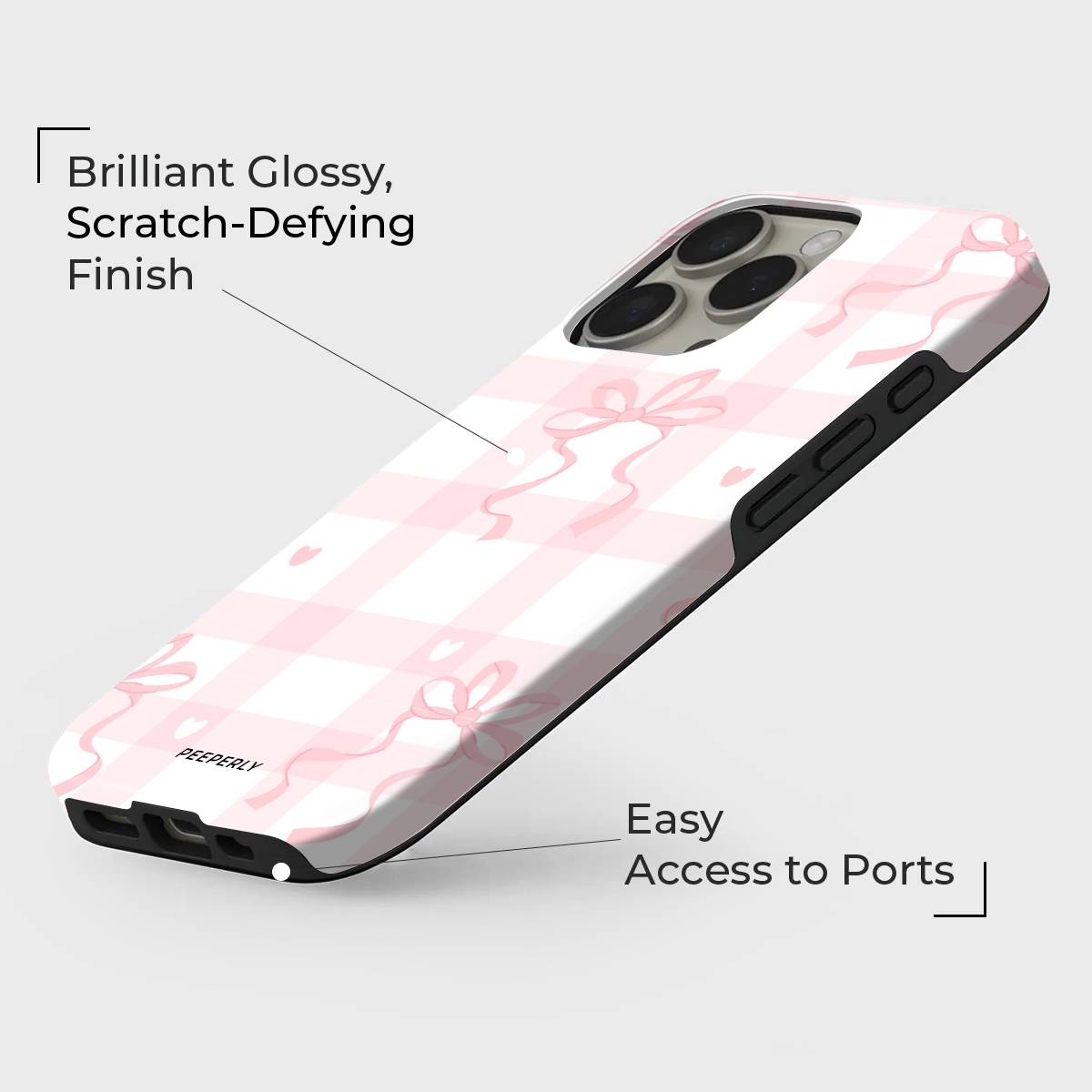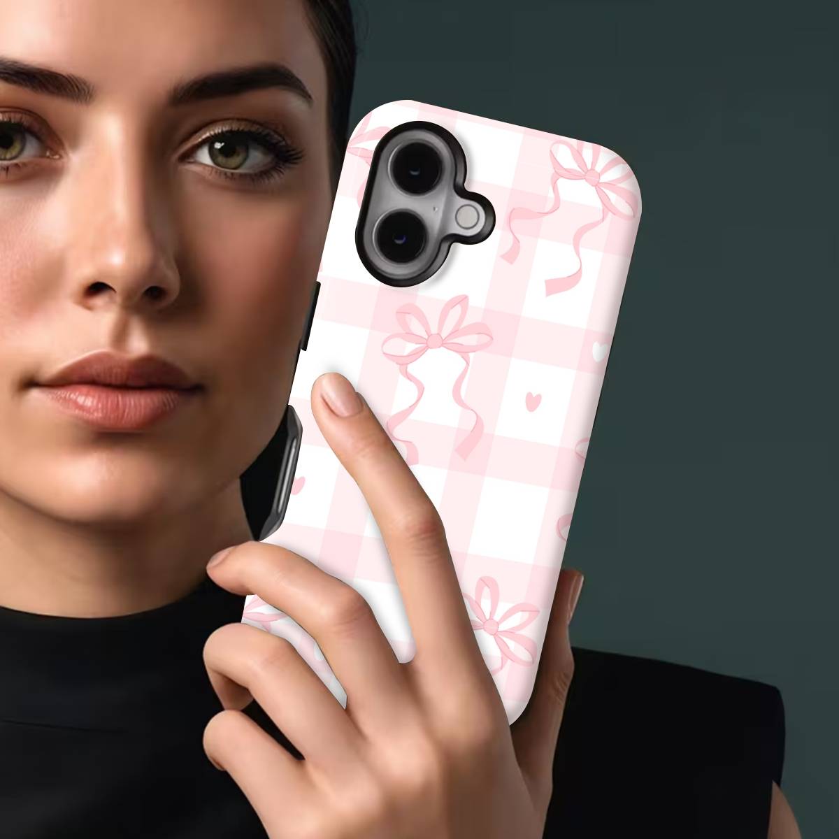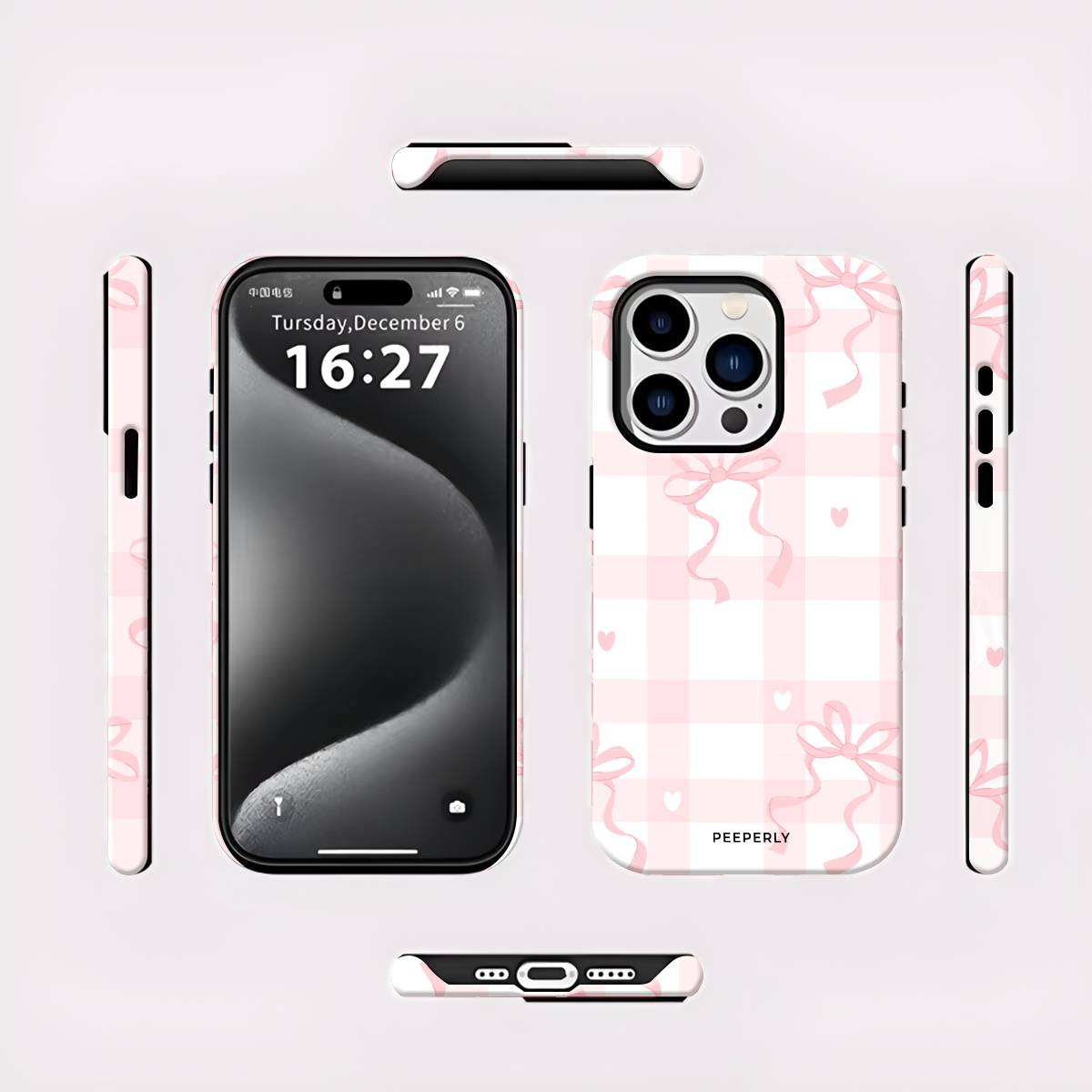 Delicate bows meet a classic grid pattern in the Grid Ribbons Case. Designed with soft pink checks, tiny hearts, and flowing ribbon details, this case brings a charming, gift-wrapped feel to your everyday style.