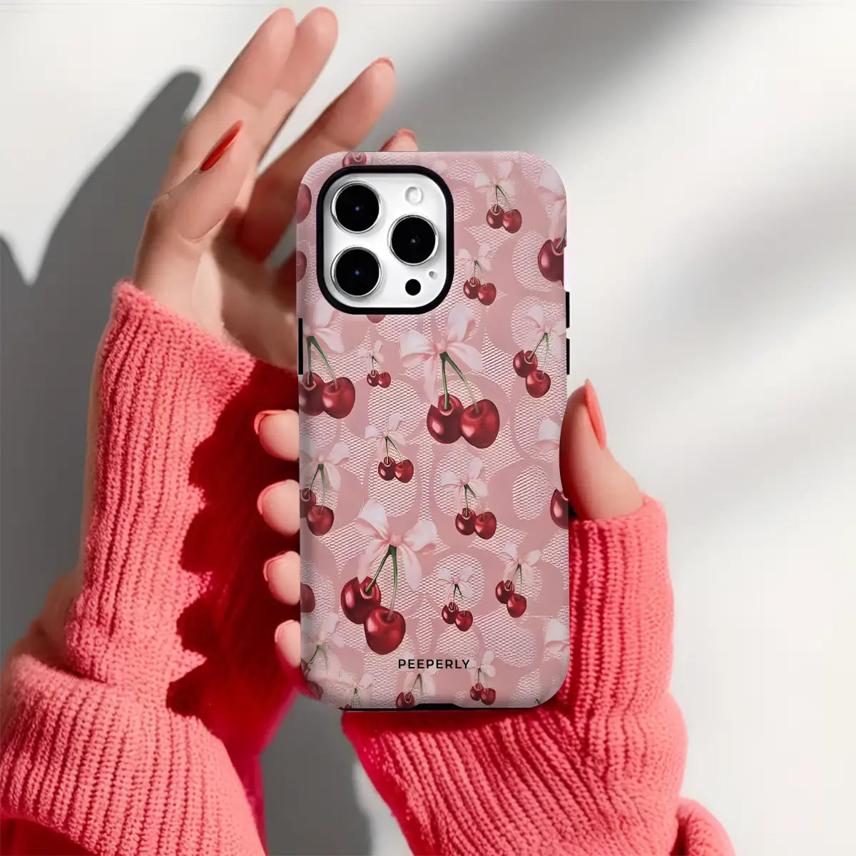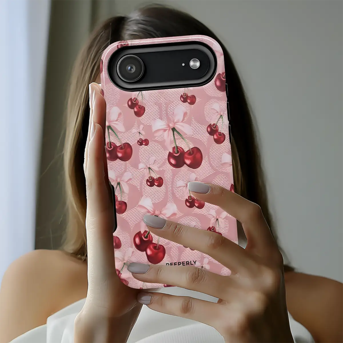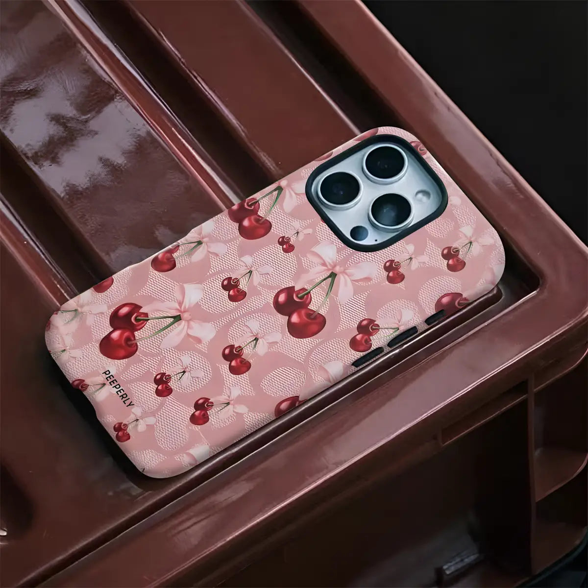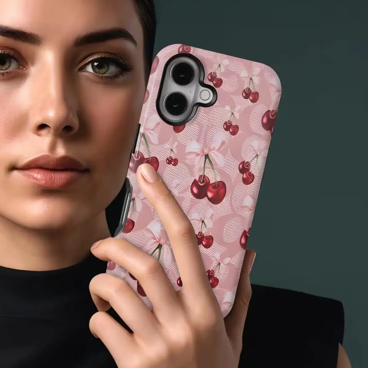A romantic fusion of glossy cherries, soft pink bows, and a delicate lace-inspired backdrop. Lace Cherry Bows blends vintage charm with playful sweetness, creating an elegant yet whimsical look that feels both cozy and couture.