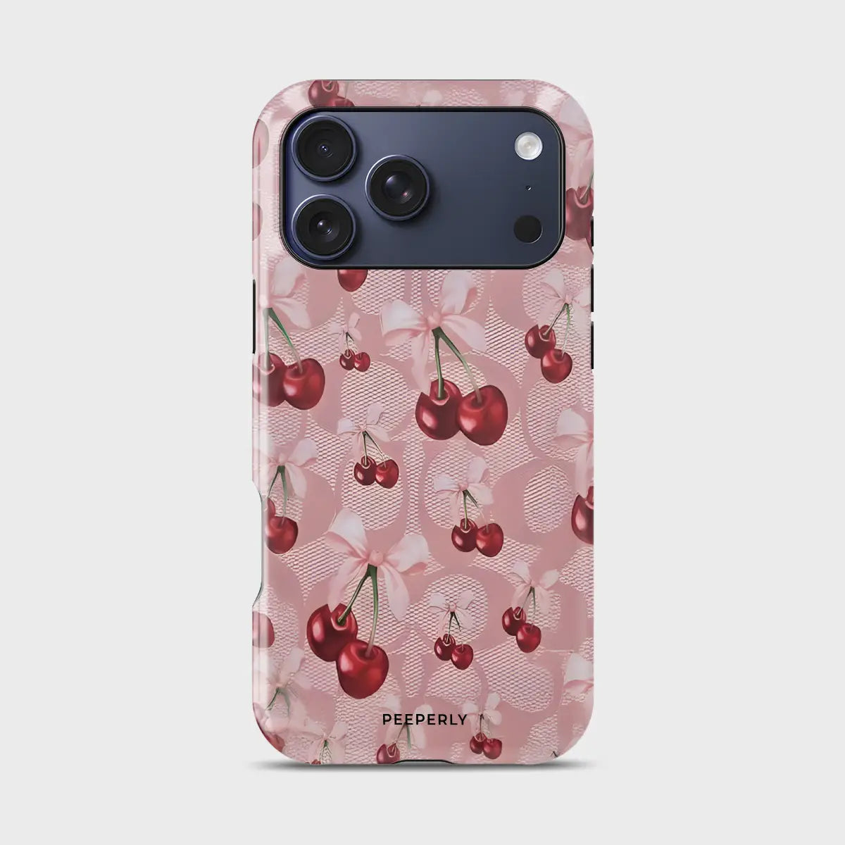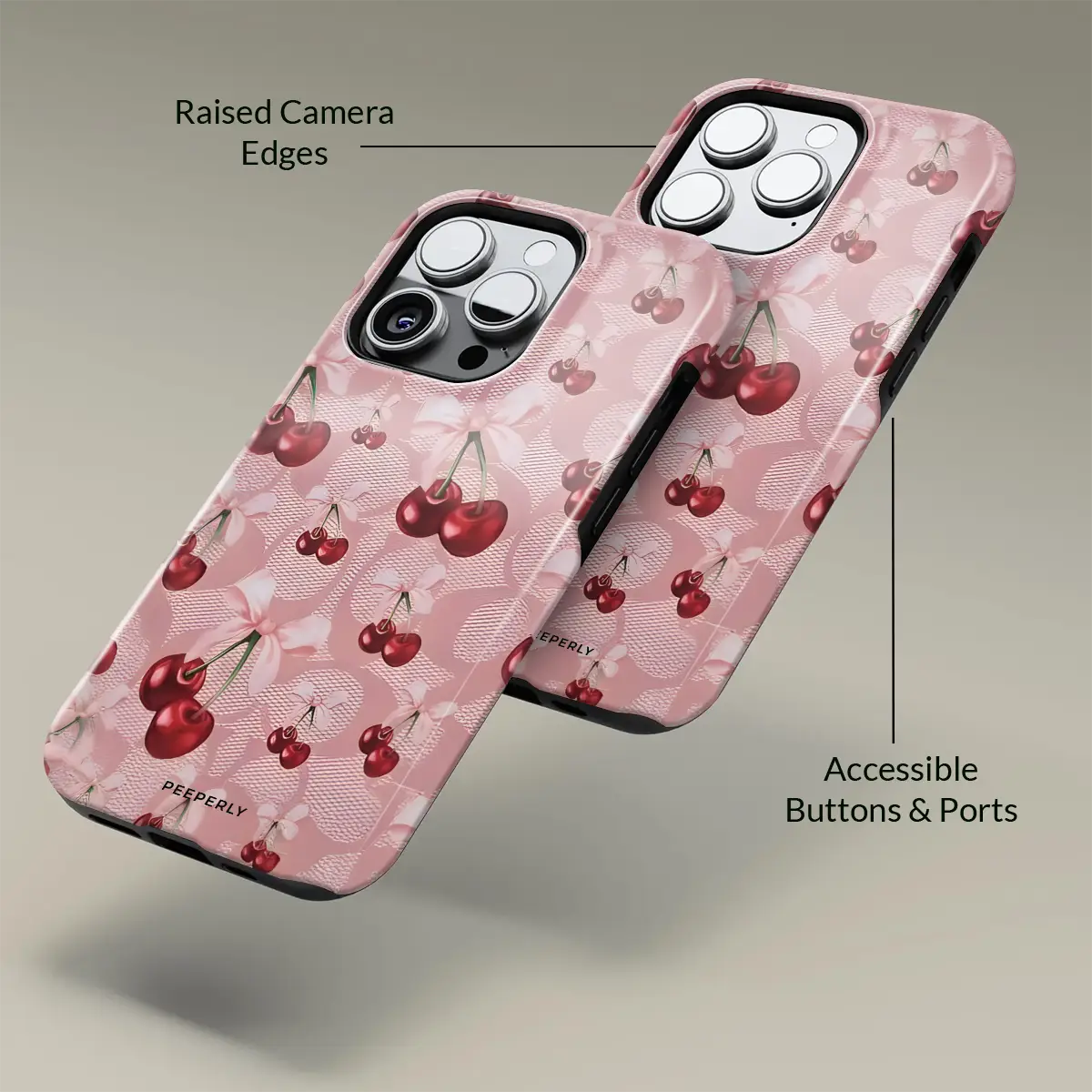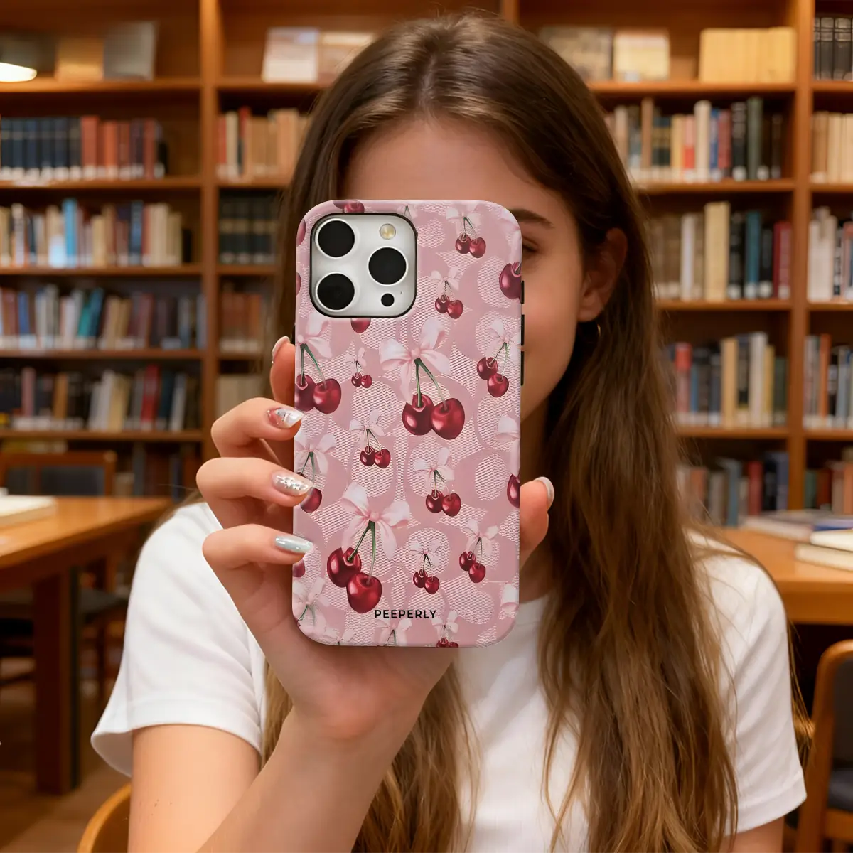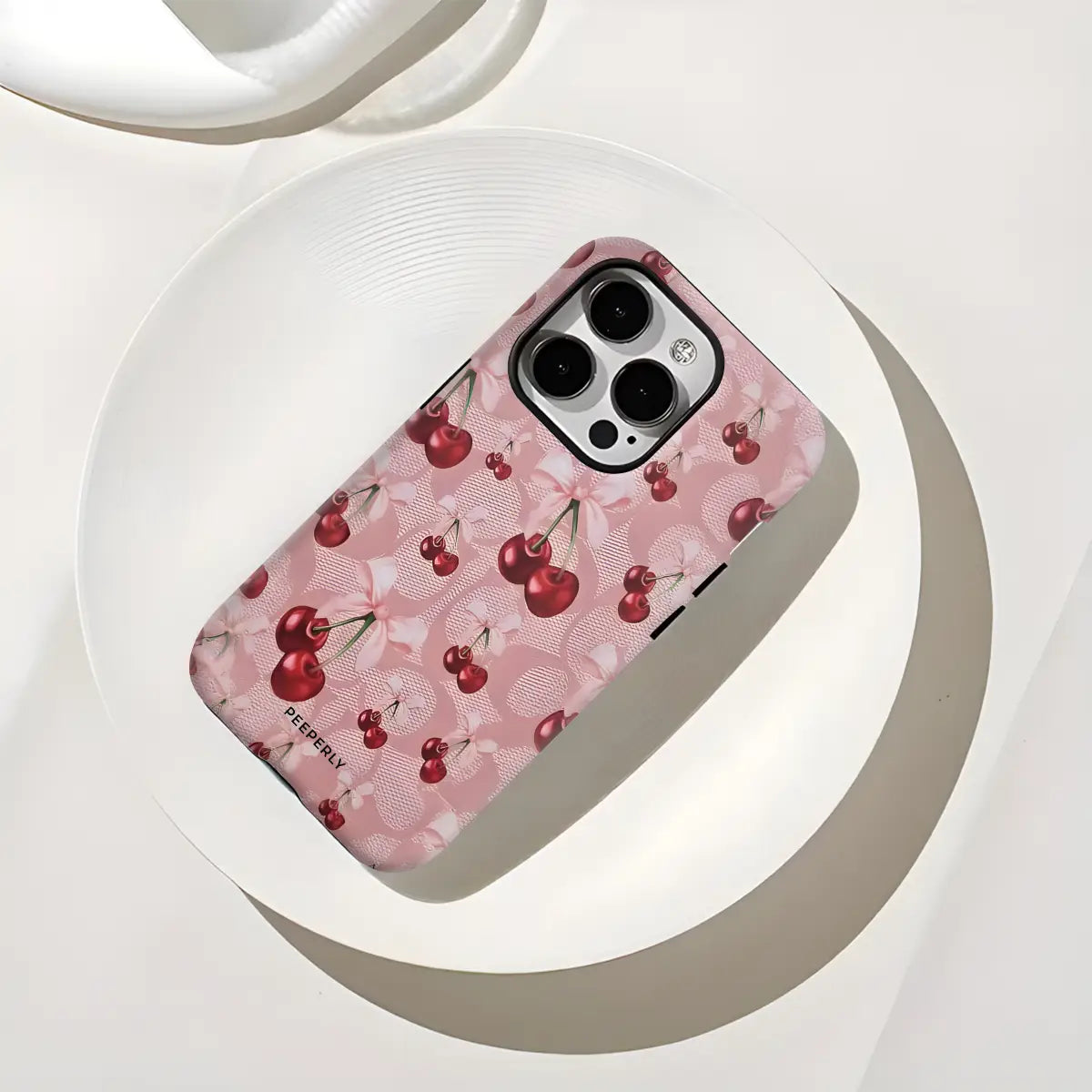 A romantic fusion of glossy cherries, soft pink bows, and a delicate lace-inspired backdrop. Lace Cherry Bows blends vintage charm with playful sweetness, creating an elegant yet whimsical look that feels both cozy and couture.