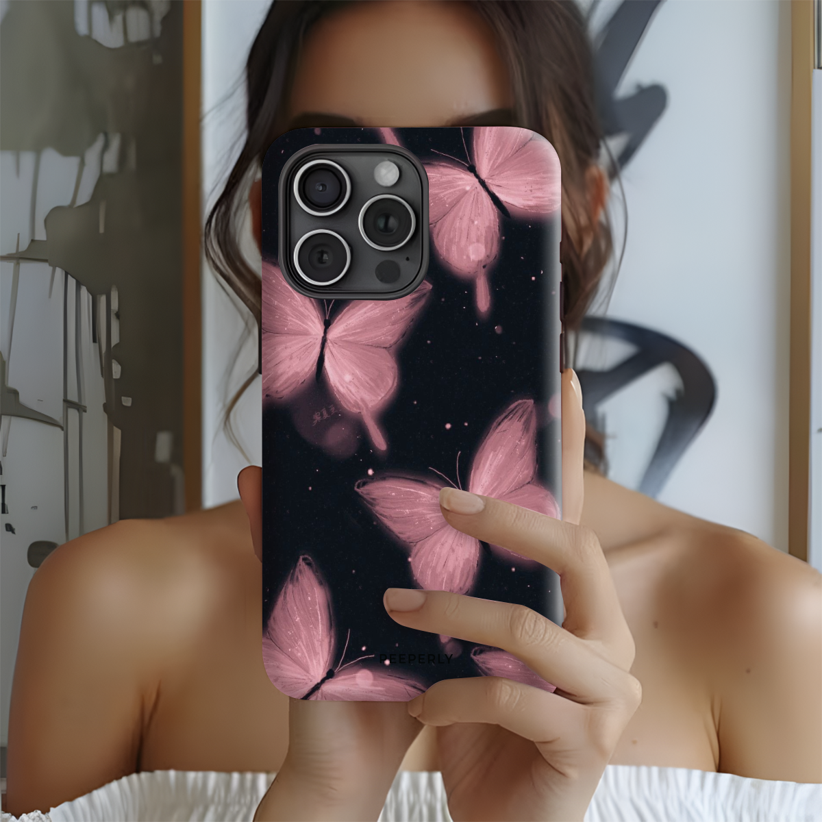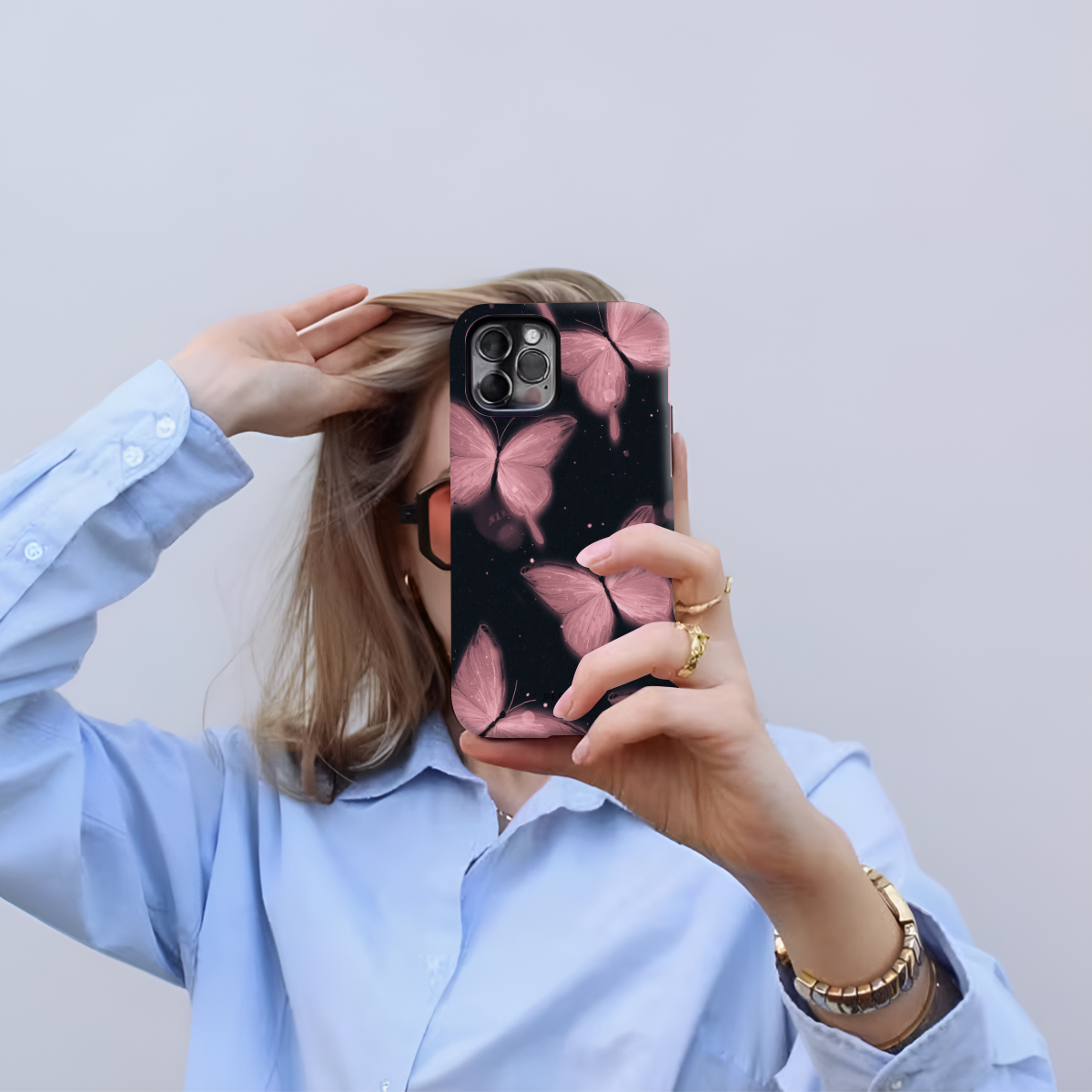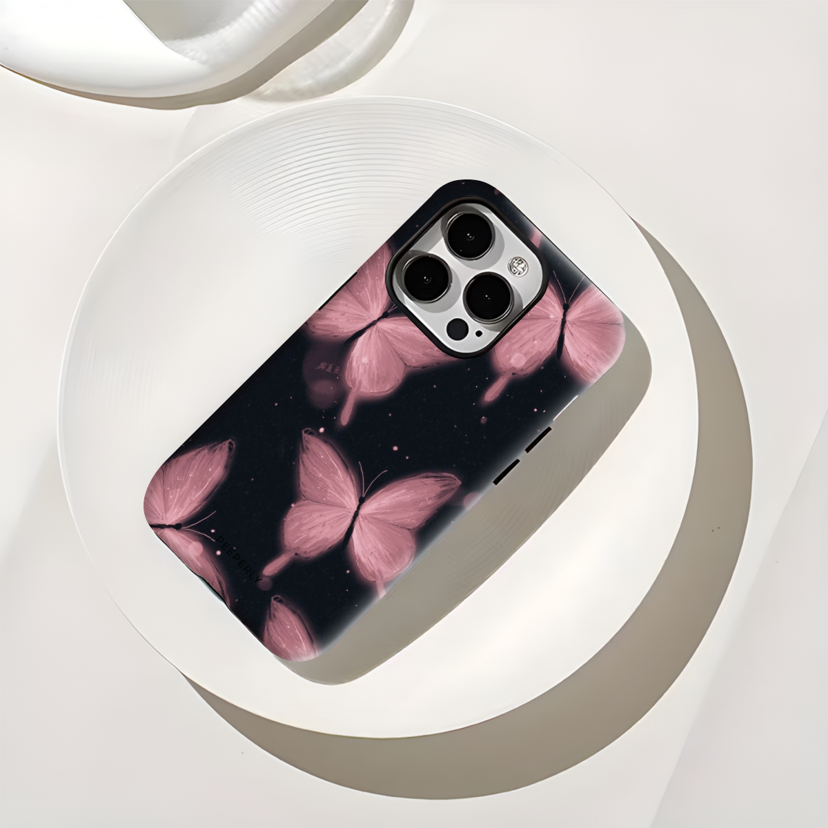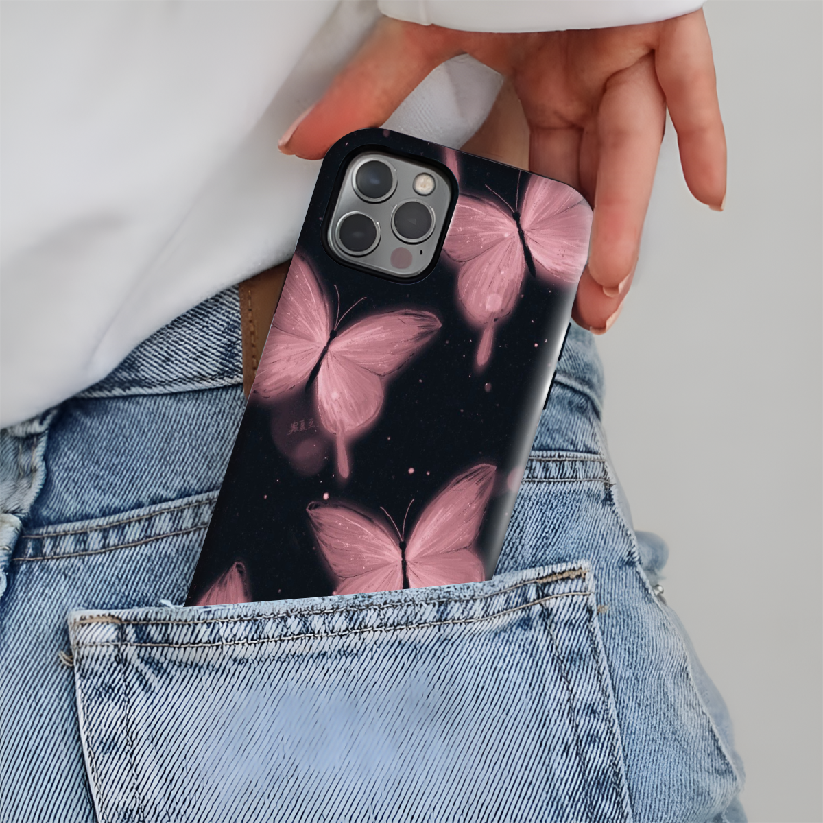 Moonlit Butterflies is a sleek, elegant phone case featuring soft blush butterflies drifting across a deep, midnight background. The contrast of delicate wings against dark tones creates a dreamy, almost celestial feel.