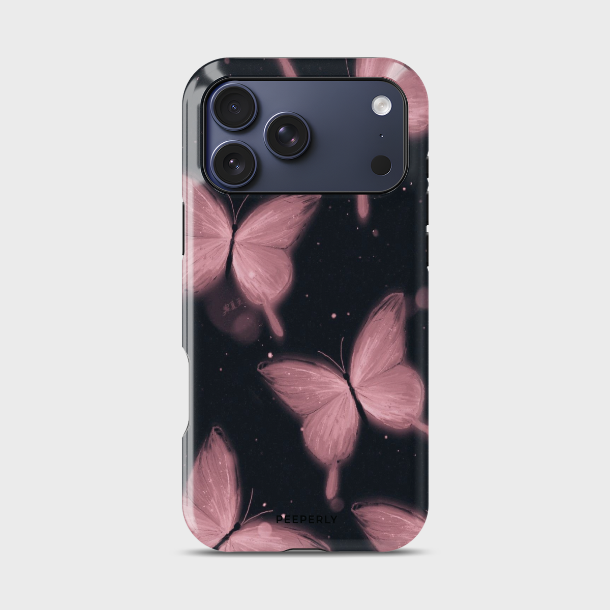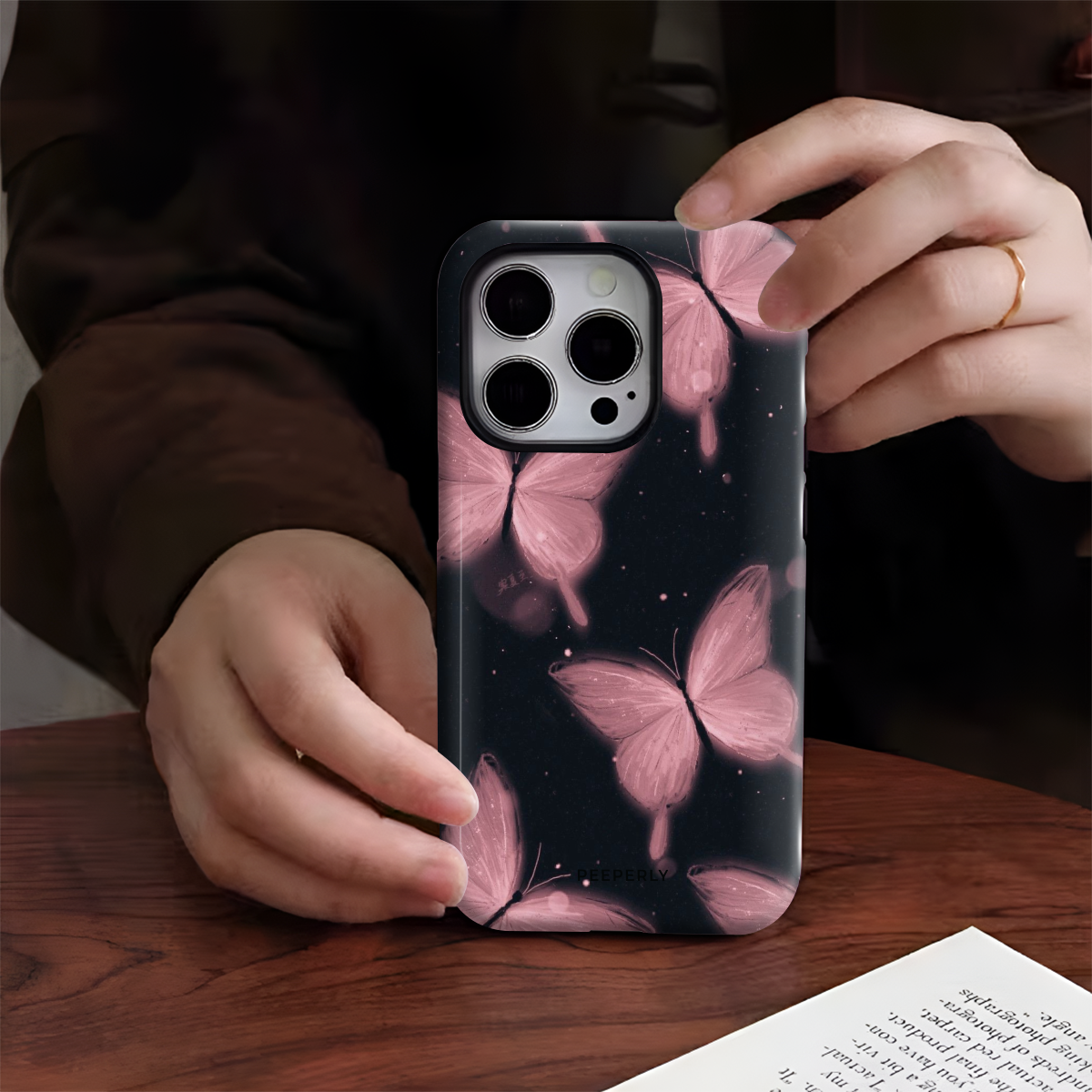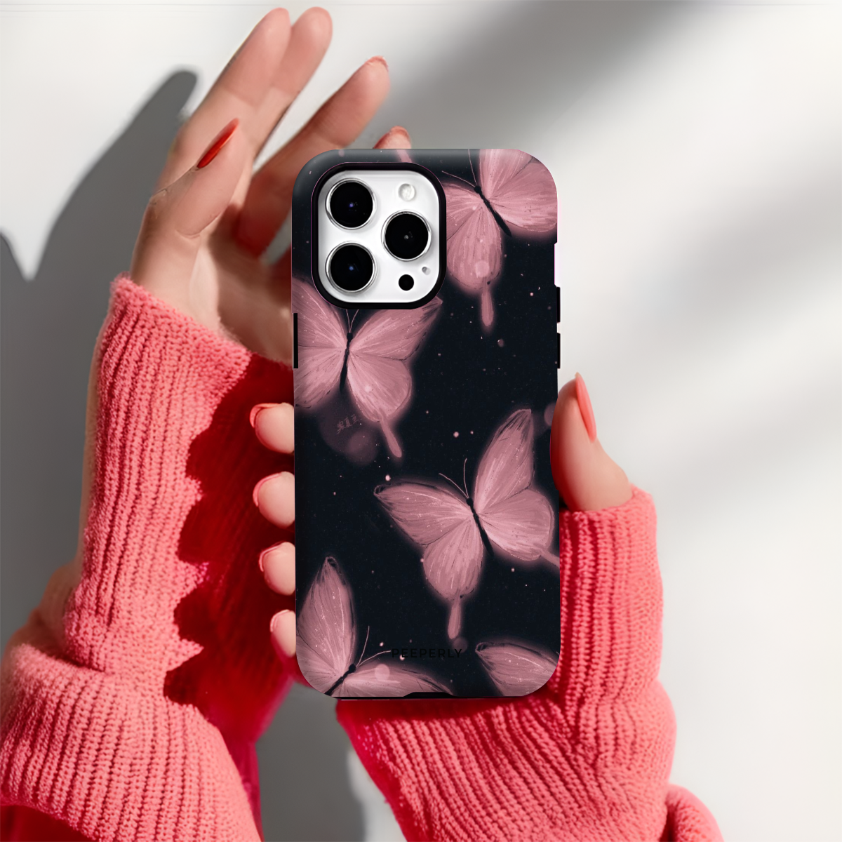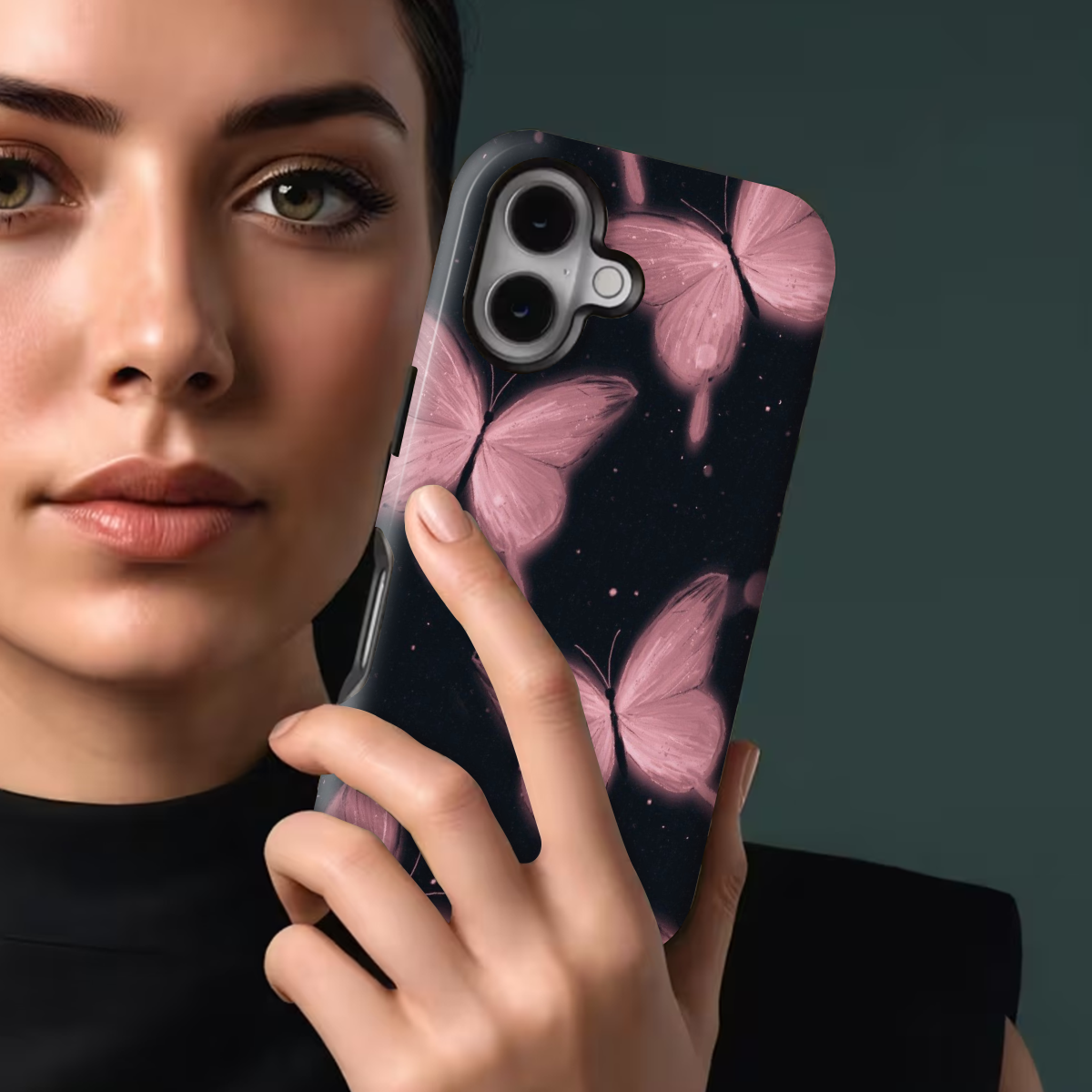 Moonlit Butterflies is a sleek, elegant phone case featuring soft blush butterflies drifting across a deep, midnight background. The contrast of delicate wings against dark tones creates a dreamy, almost celestial feel.