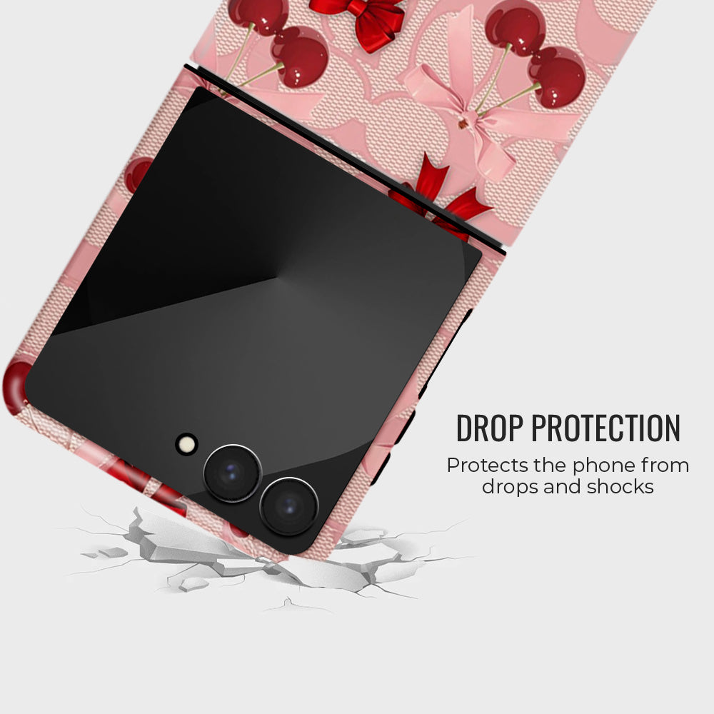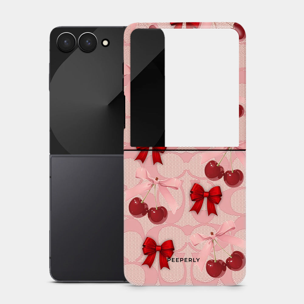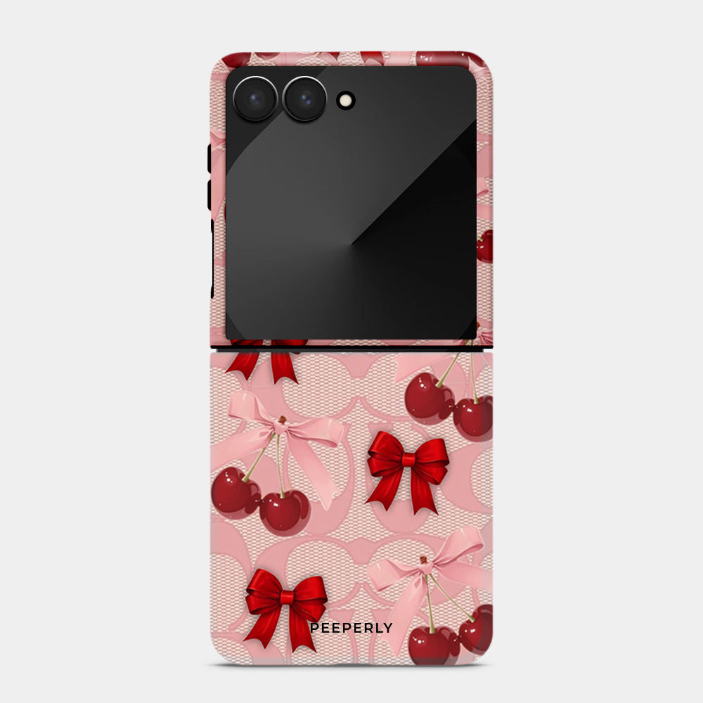 A dreamy pink blend of glossy cherries and dainty ribbon bows, sprinkled with soft romantic charm. This design feels sweet, playful, and effortlessly elegant—like a candy-coated love note wrapped in satin.