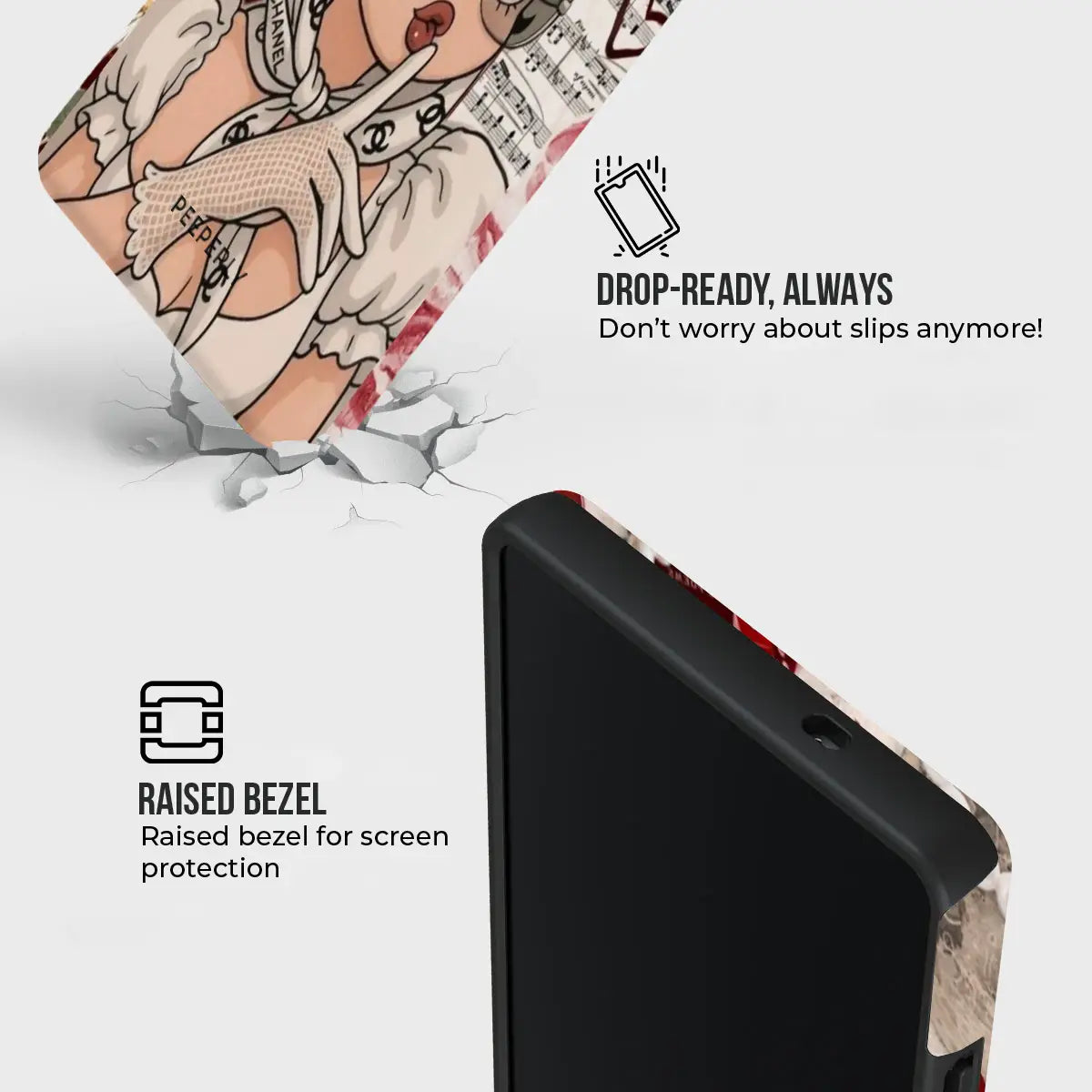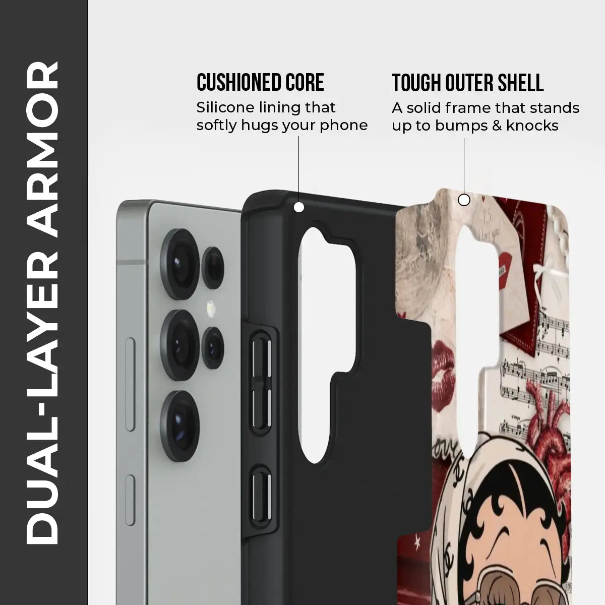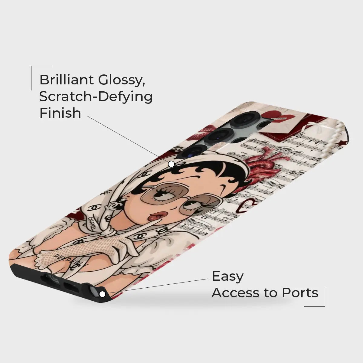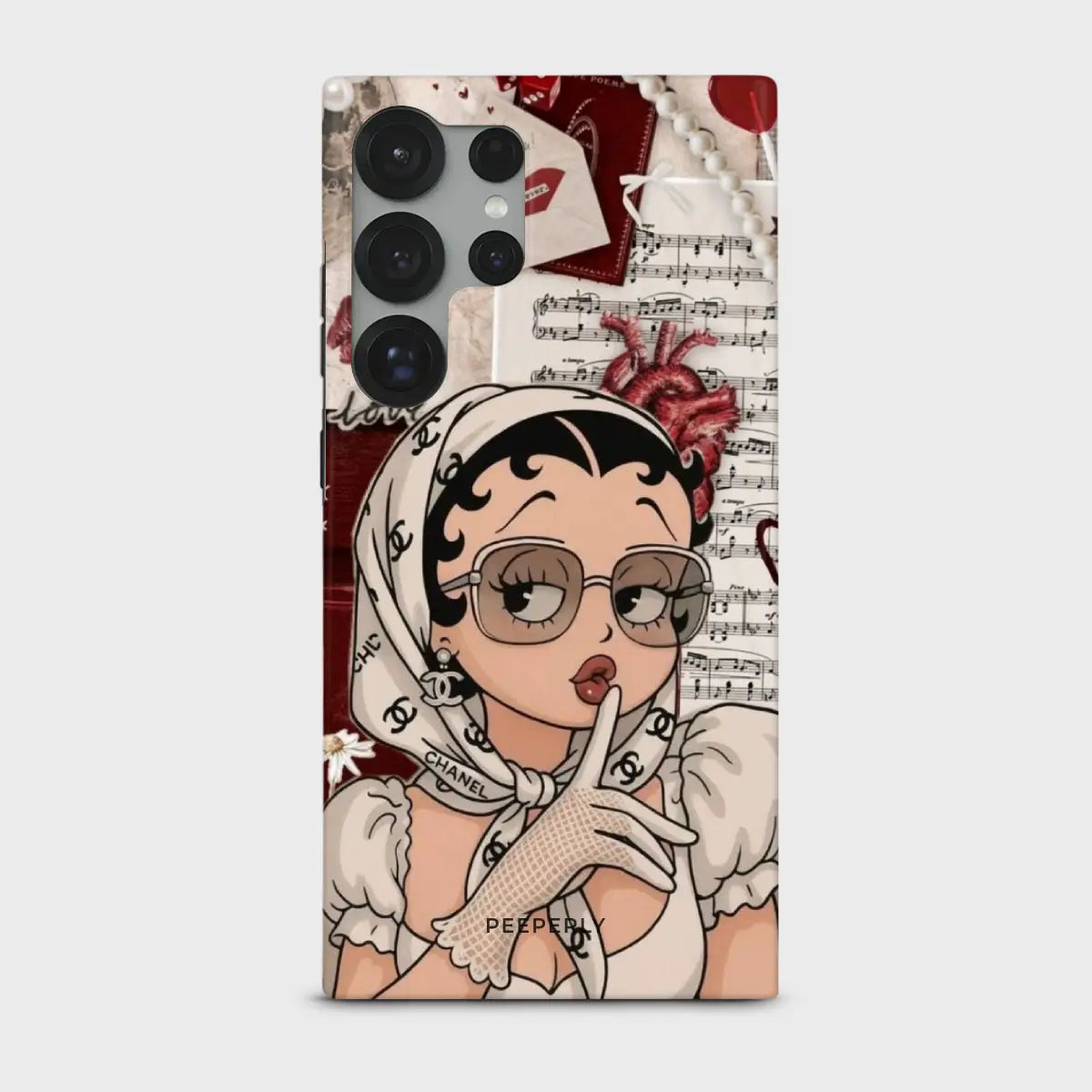 A bold, retro-inspired design featuring a chic cartoon muse layered over romantic reds, pearls, and handwritten textures. This case radiates confidence, vintage glam, and playful attitude—perfect for those who love to stand out with a touch of old-school diva energy and modern charm.