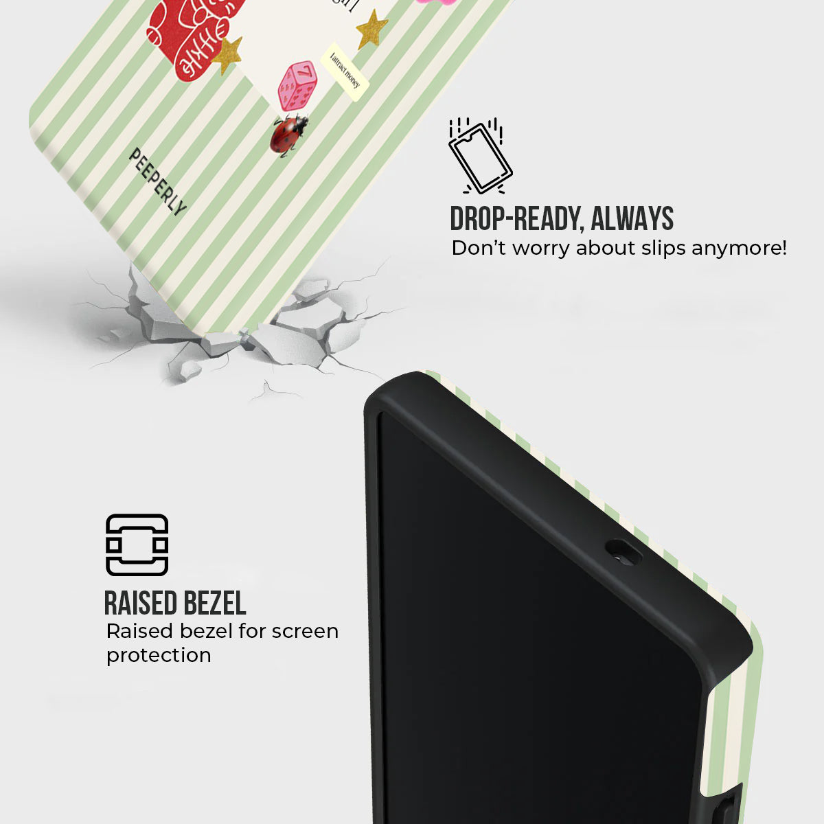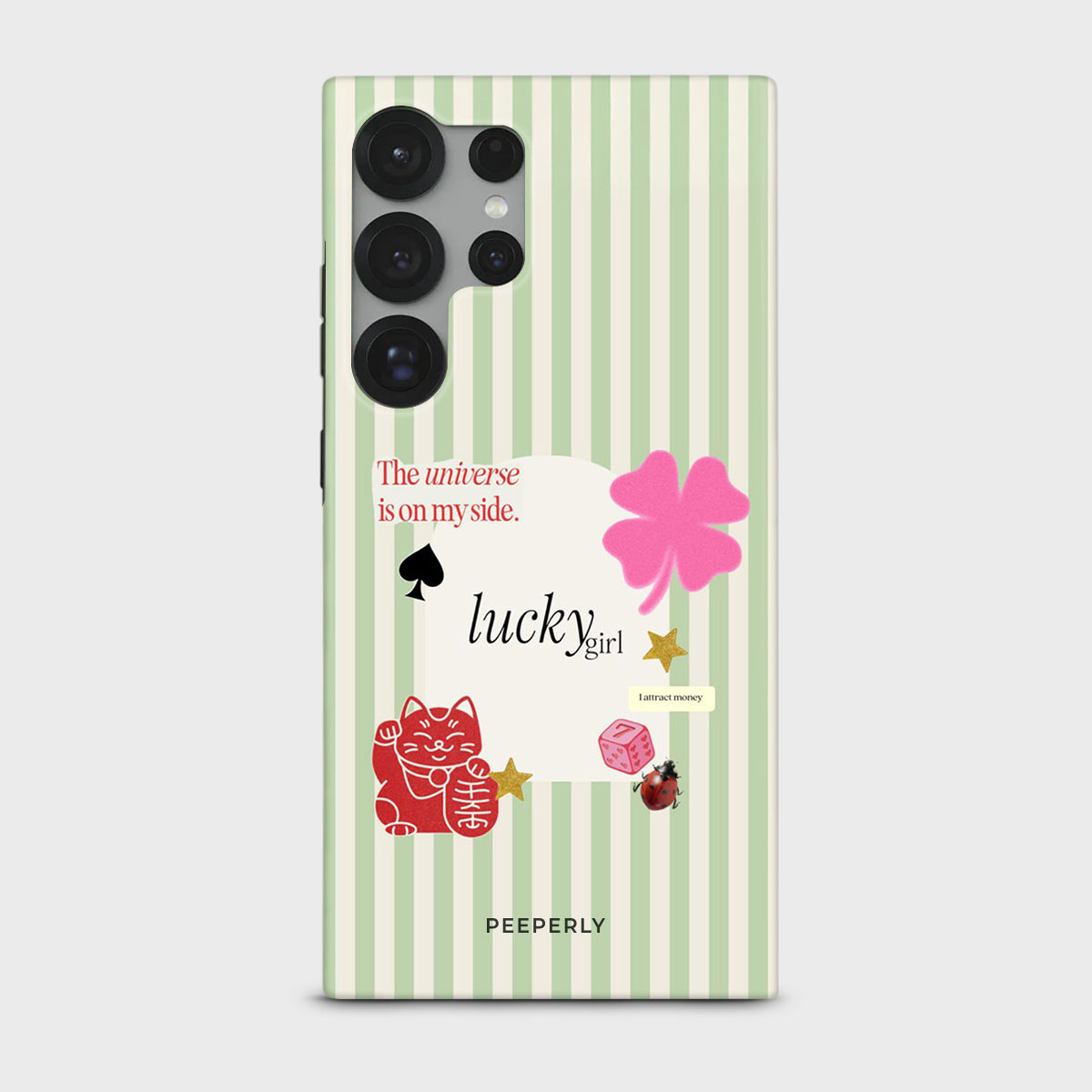A charming blend of soft stripes and playful symbols that celebrate everyday luck. From clovers to lucky icons, this design is all about small joys, positive signs, and feel-good moments—perfect for carrying a little fortune with you wherever you go.
