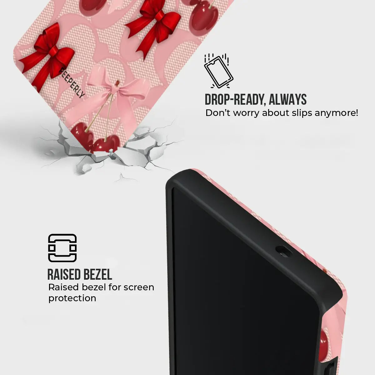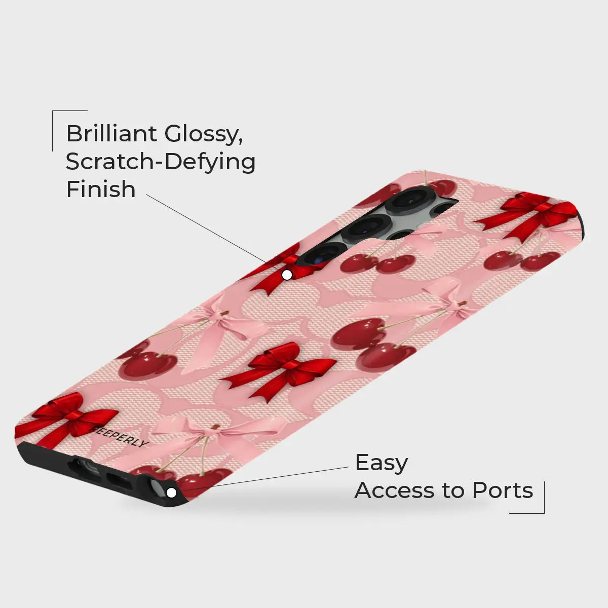 A dreamy pink blend of glossy cherries and dainty ribbon bows, sprinkled with soft romantic charm. This design feels sweet, playful, and effortlessly elegant—like a candy-coated love note wrapped in satin.