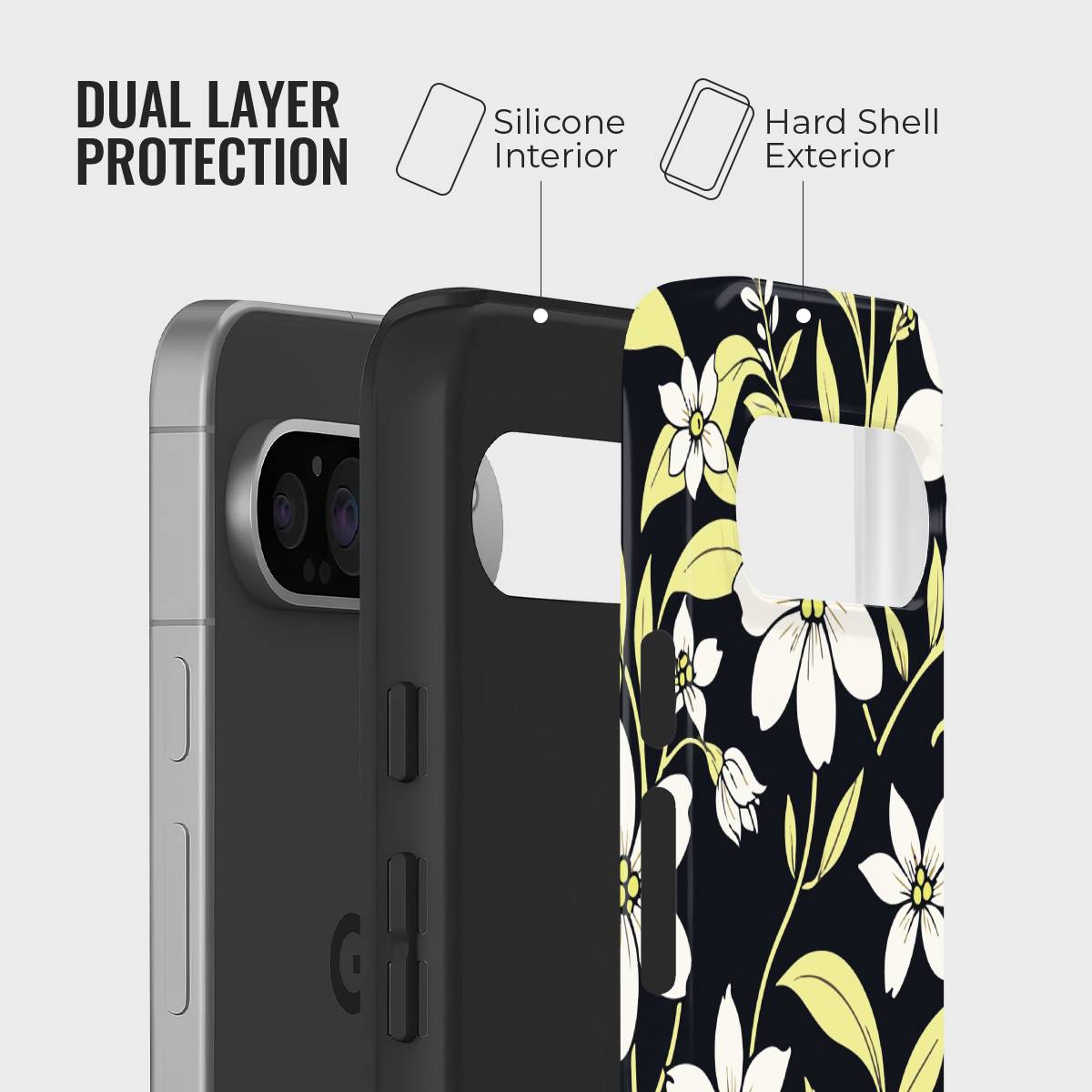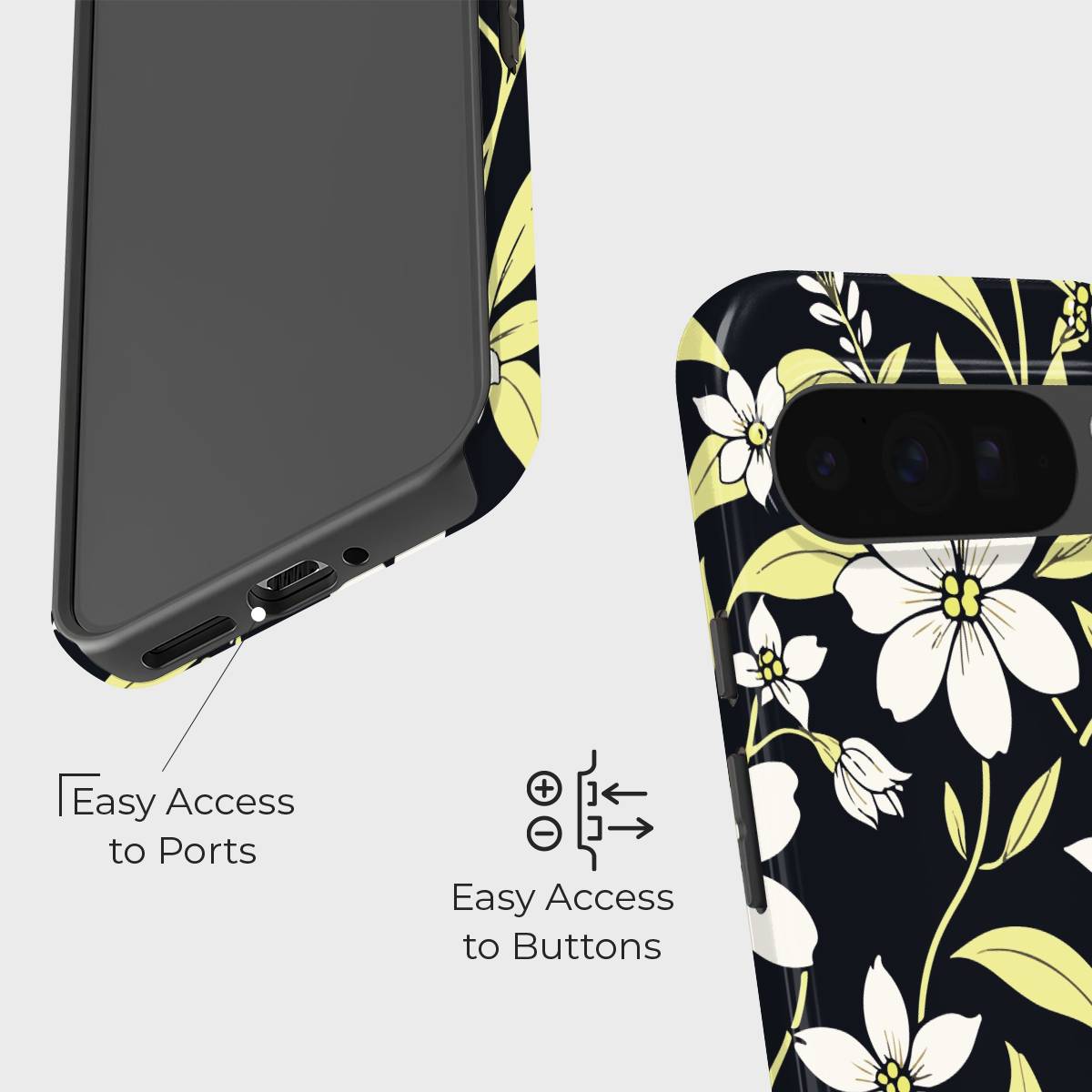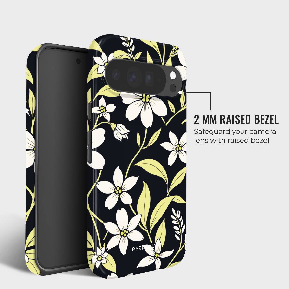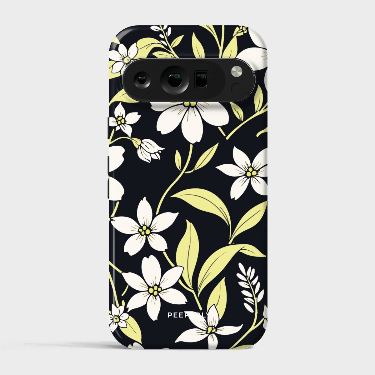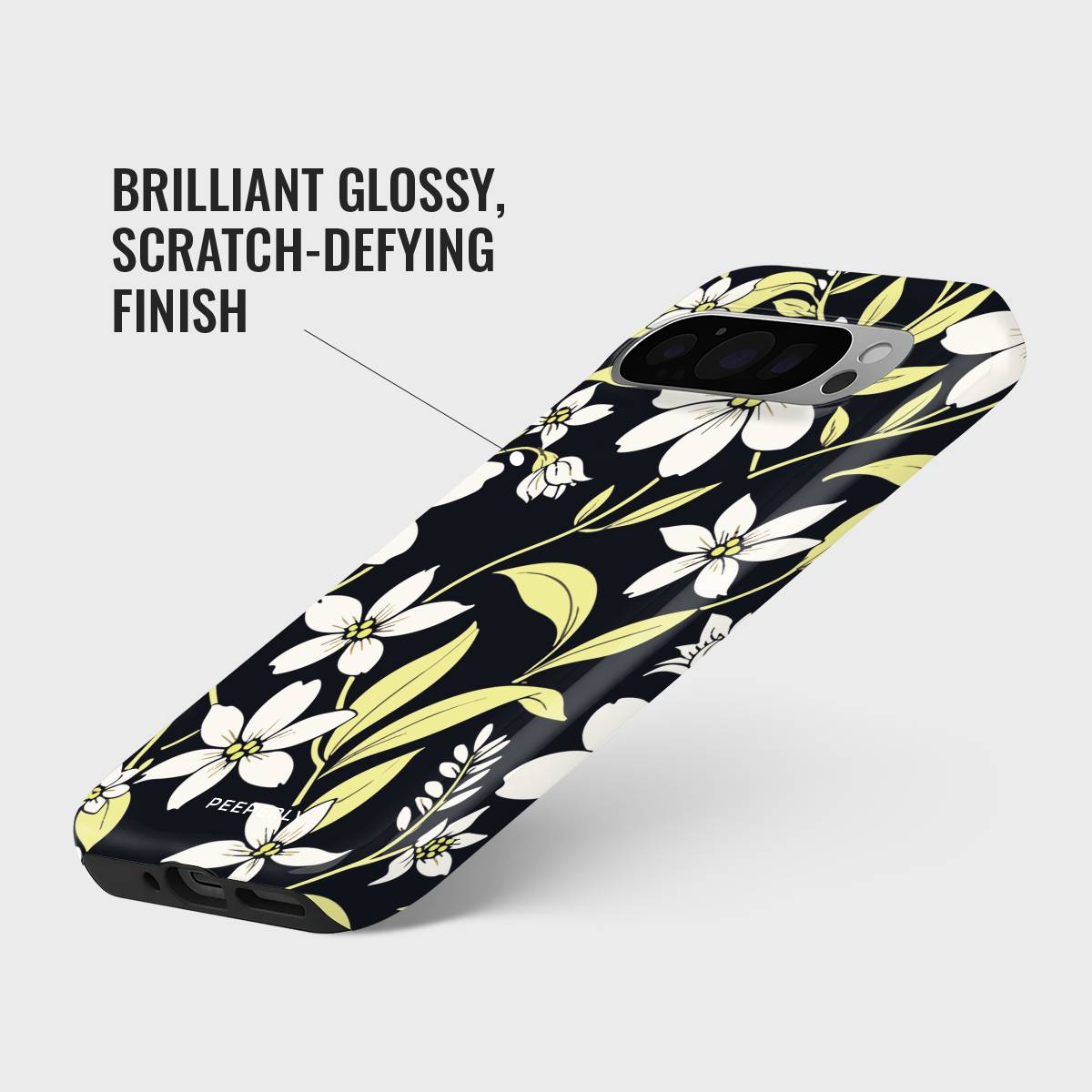 Embrace the elegance of nature after dusk with the Mystic Grace mobile case. Featuring a delicate arrangement of soft white blossoms and pale green leaves against a deep, midnight backdrop, this case captures the serene charm of a moonlit garden. Designed for those who love beauty with a bold edge, Mystic Grace blends sophistication with subtle mystique.