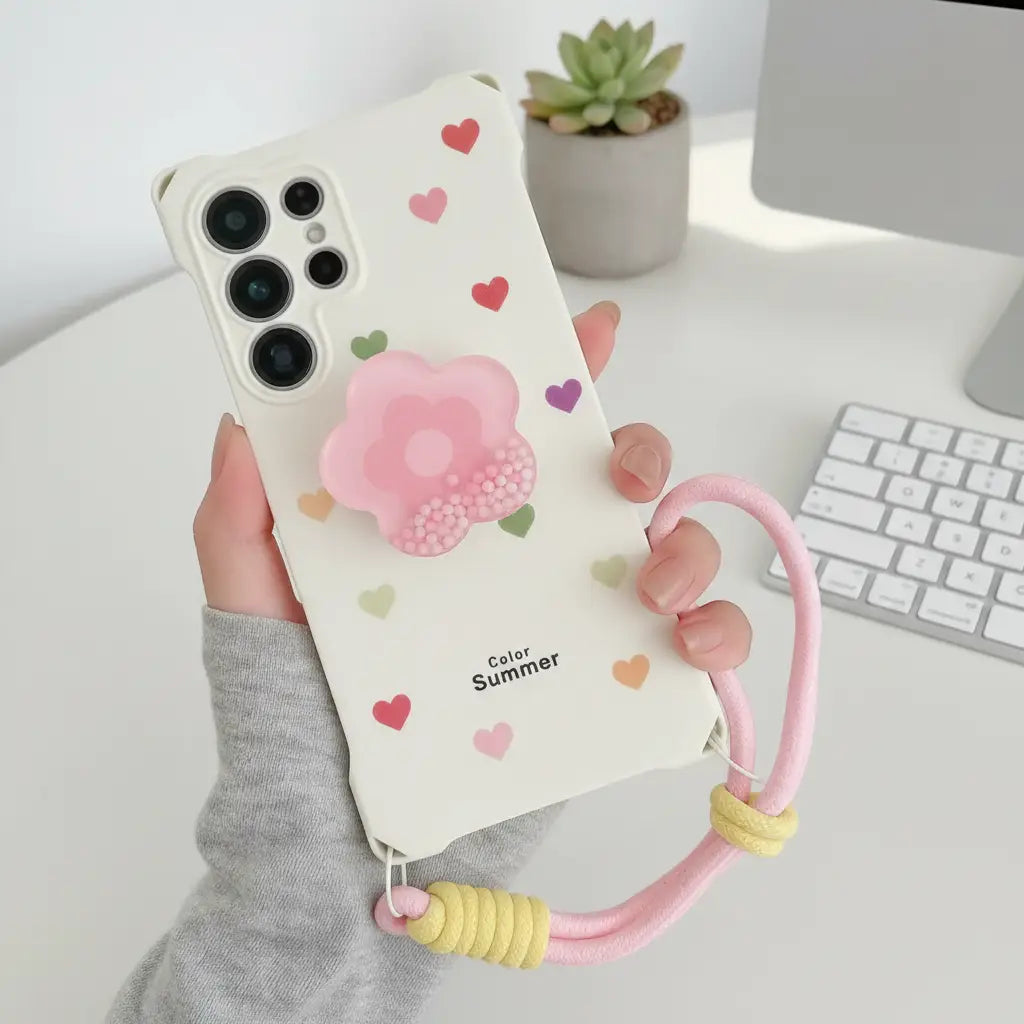 Fall in love with every detail of the Lovely Summer Hearts Case — a perfect mix of cute, cheerful, and protective. This adorable design features a pastel heart pattern and a 3D pink flower pop grip filled with soft beads that add a touch of playful charm