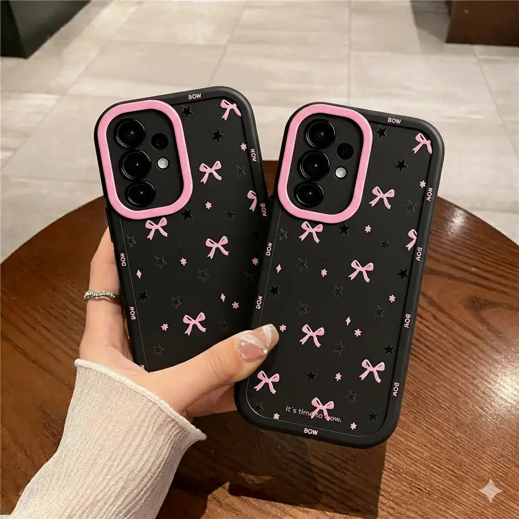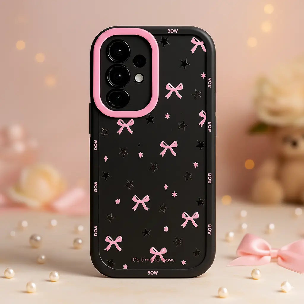 Turn your phone into a dreamy night sky with the Cosmic Bows case — a perfect blend of cuteness and cosmic charm. Featuring delicate pink bows scattered across a jet-black background with shimmering stars, this case brings a playful yet mysterious vibe to your style. The soft matte finish and protective bumpers keep your phone looking adorable and safe.
