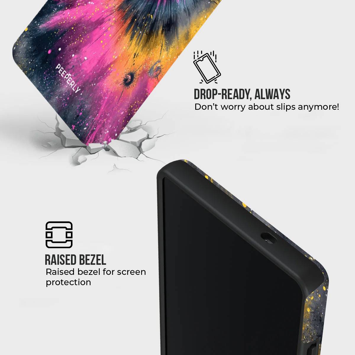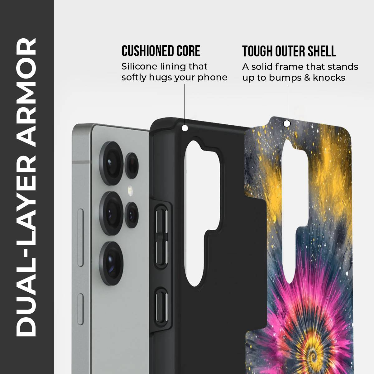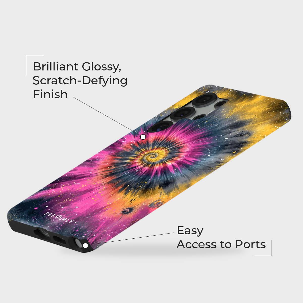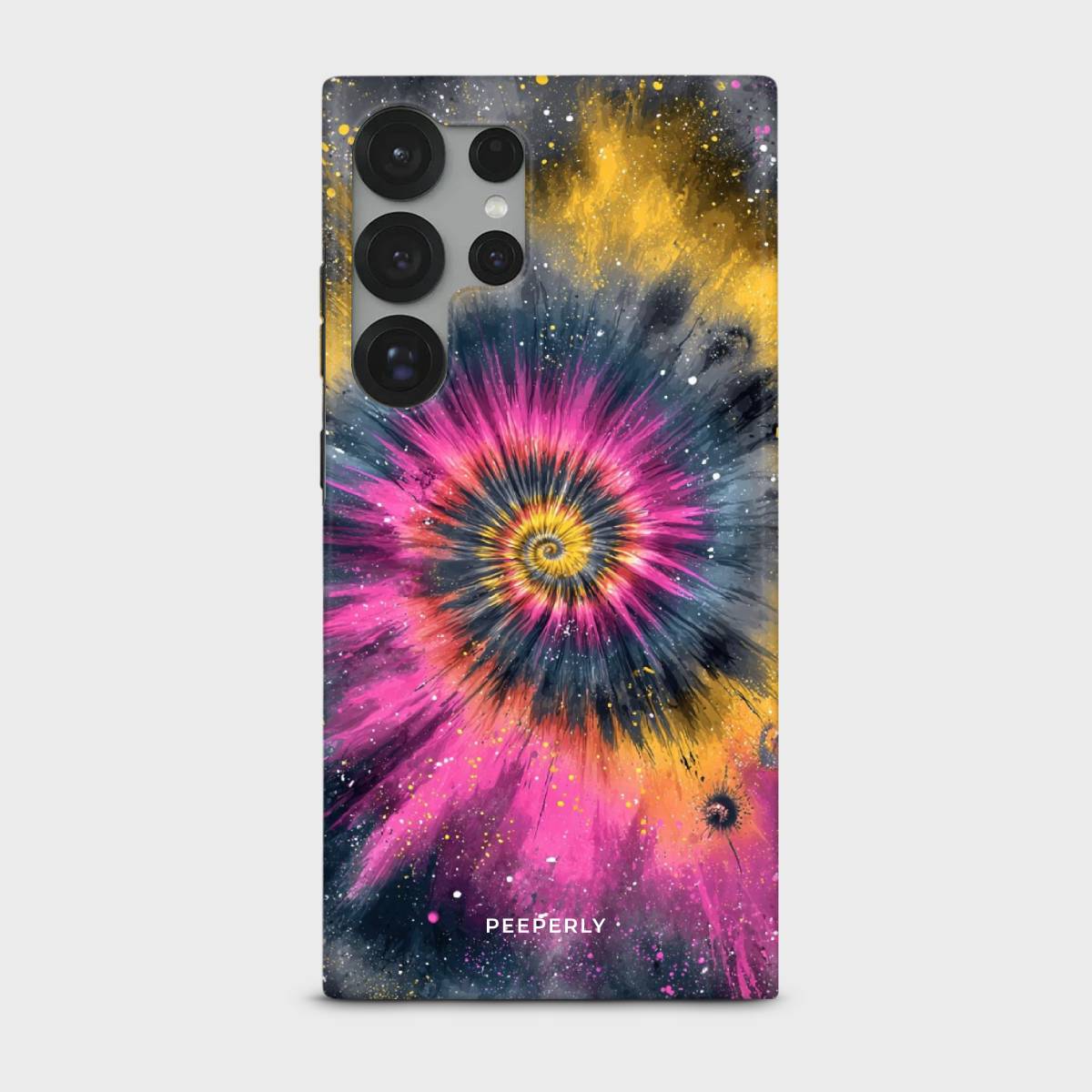 Make your phone stand out with this bold and vibrant case that captures the energy of a cosmic tie-dye explosion. The swirling blend of electric pink, golden yellow, and deep midnight hues creates a dazzling spiral that feels alive with motion.
