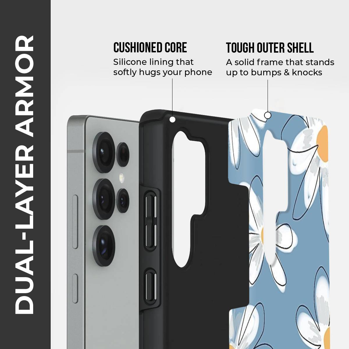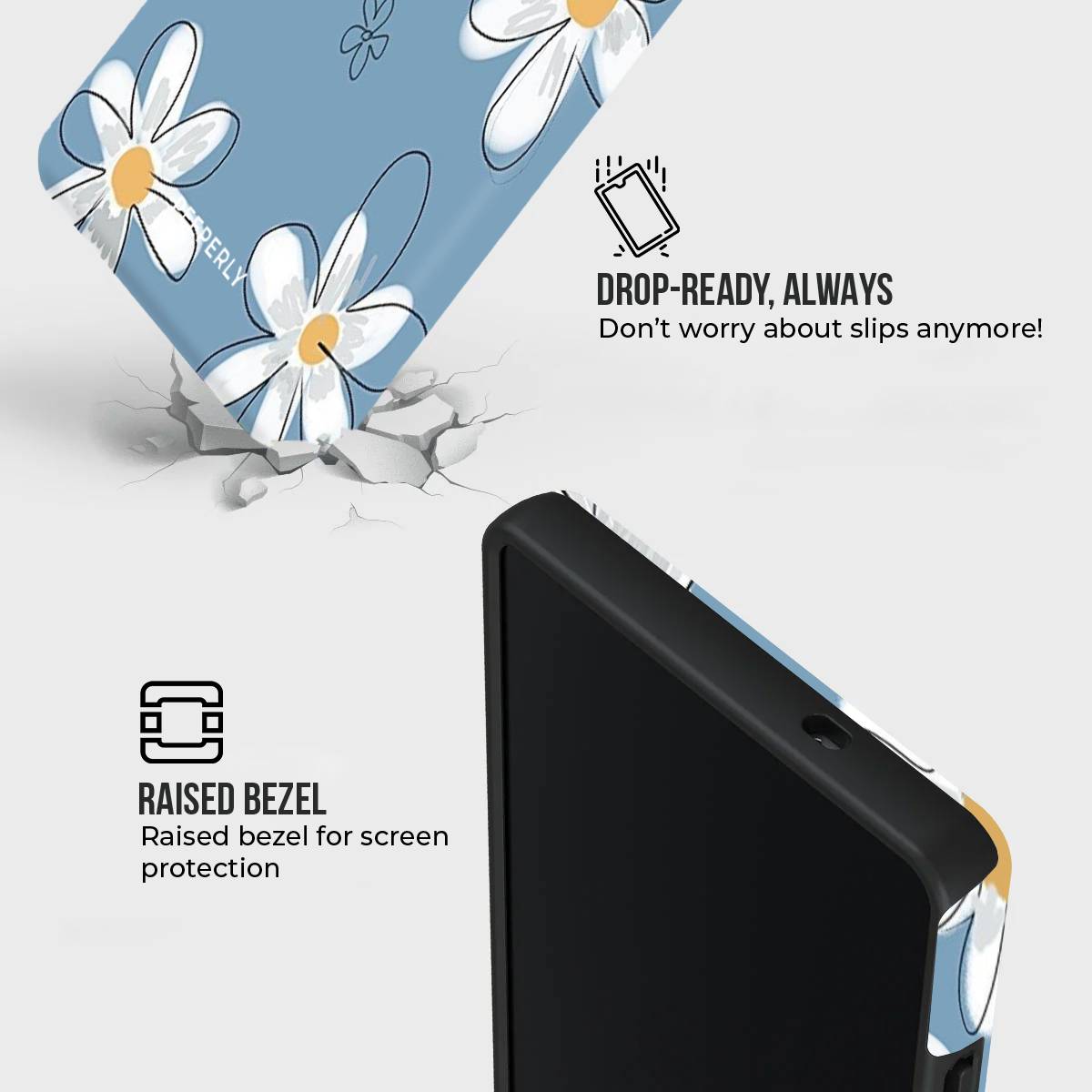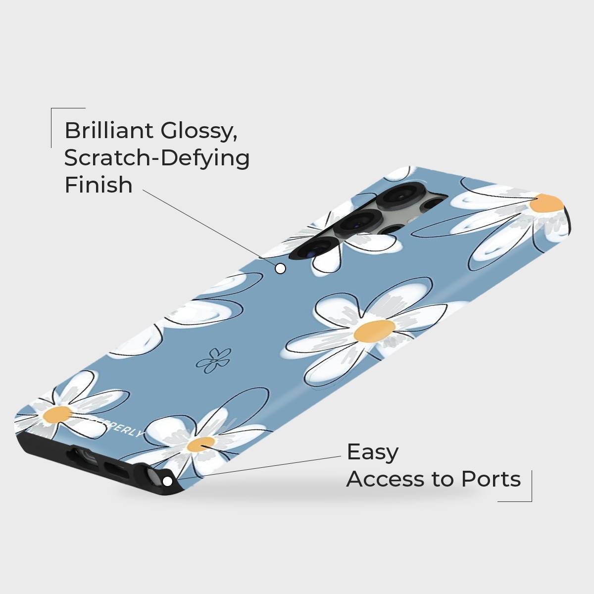 Let your phone bloom with charm and creativity. Meadow Muse is inspired by sunlit fields and the gentle grace of wildflowers, featuring hand-drawn white daisies dancing across a serene sky-blue backdrop.