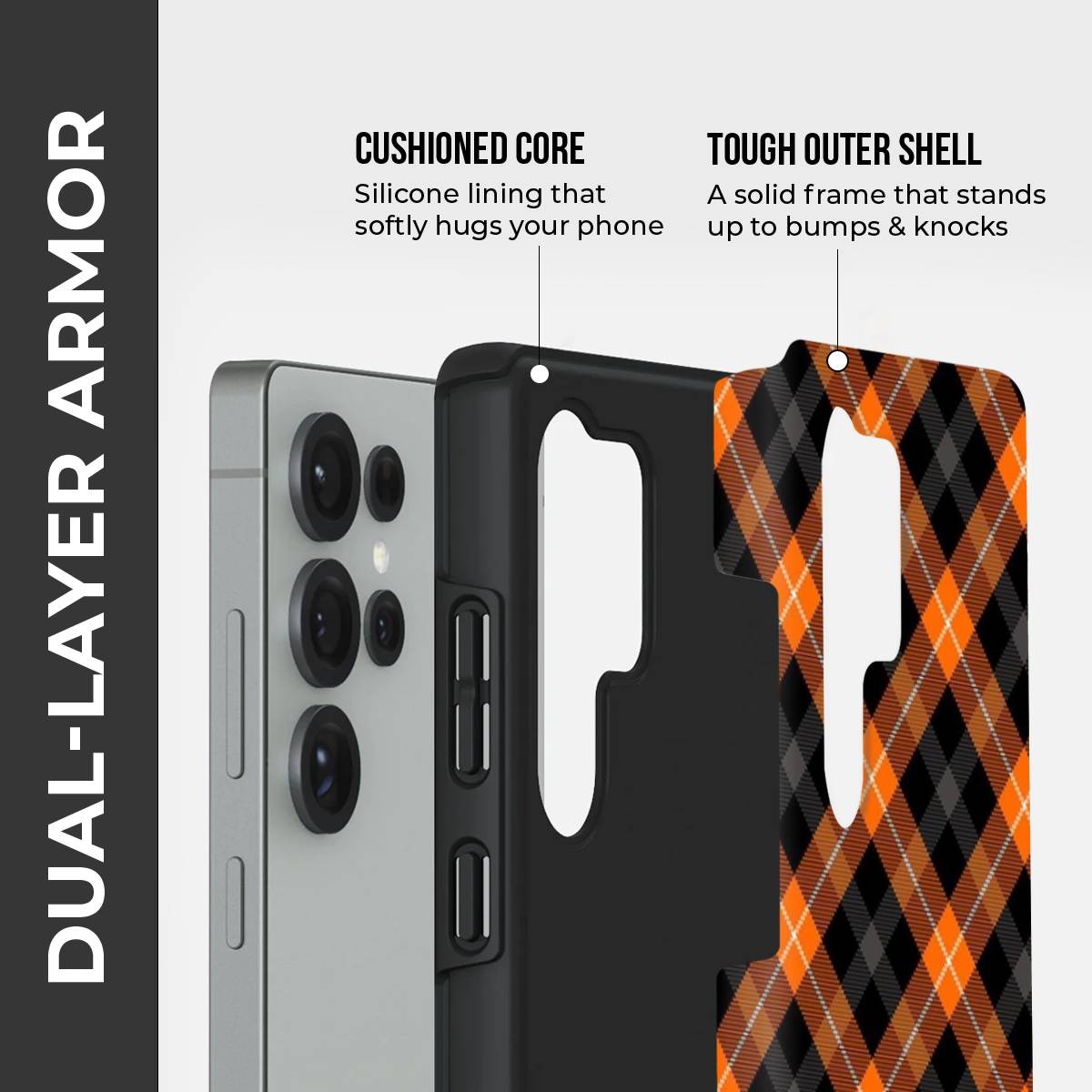 Bring the warmth of autumn and the charm of heritage patterns to your phone with the Timber Check case. Featuring a bold orange, black, and brown plaid design, this case is perfect for those who love timeless style with a modern twist. The rugged tartan-inspired pattern gives your phone a distinctive, cozy-yet-bold look, while offering reliable daily protection.