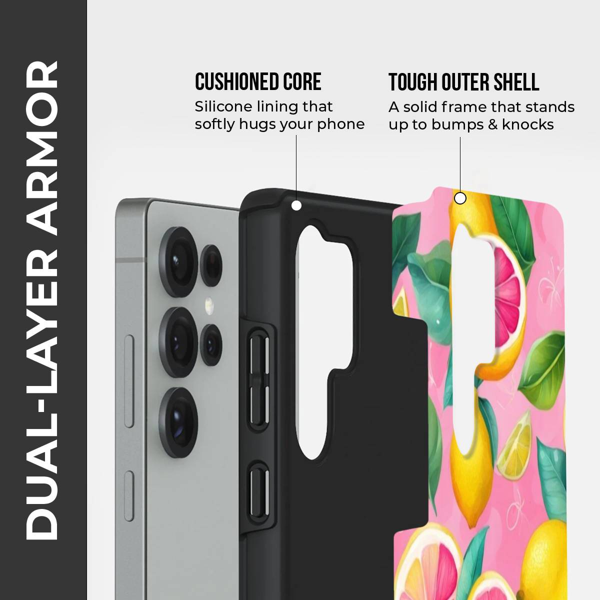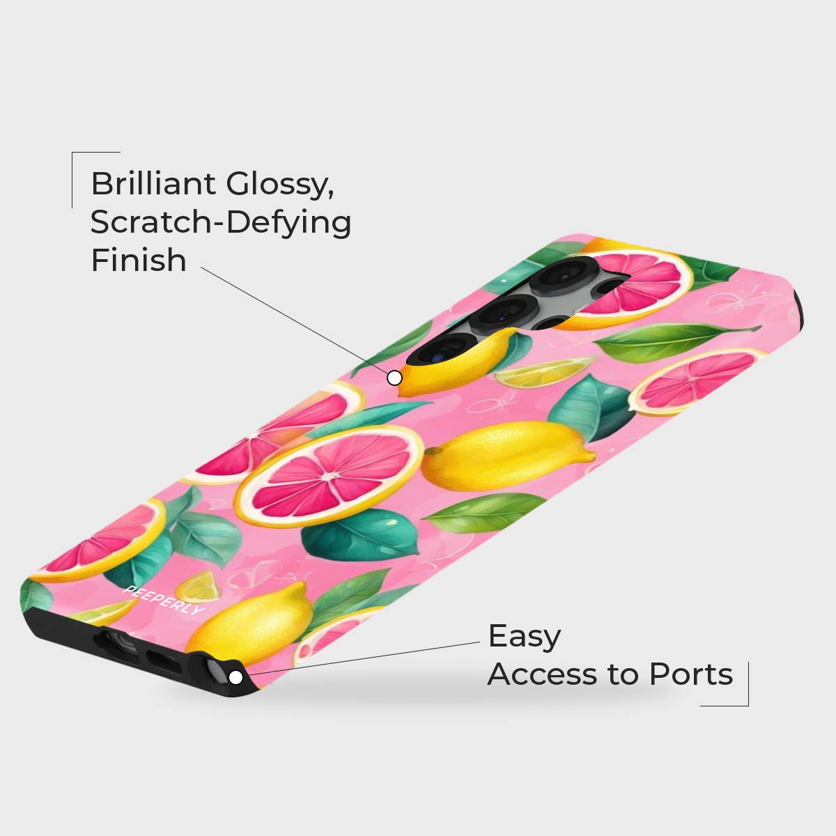 Bring a burst of sunshine to your everyday with the Tropical Twist Case. Featuring a lively mix of zesty lemons, vibrant grapefruits, and lush green leaves against a playful pink backdrop, this case captures the essence of tropical fun. Its refreshing design adds a splash of color and personality to your phone while keeping it stylish and unique.