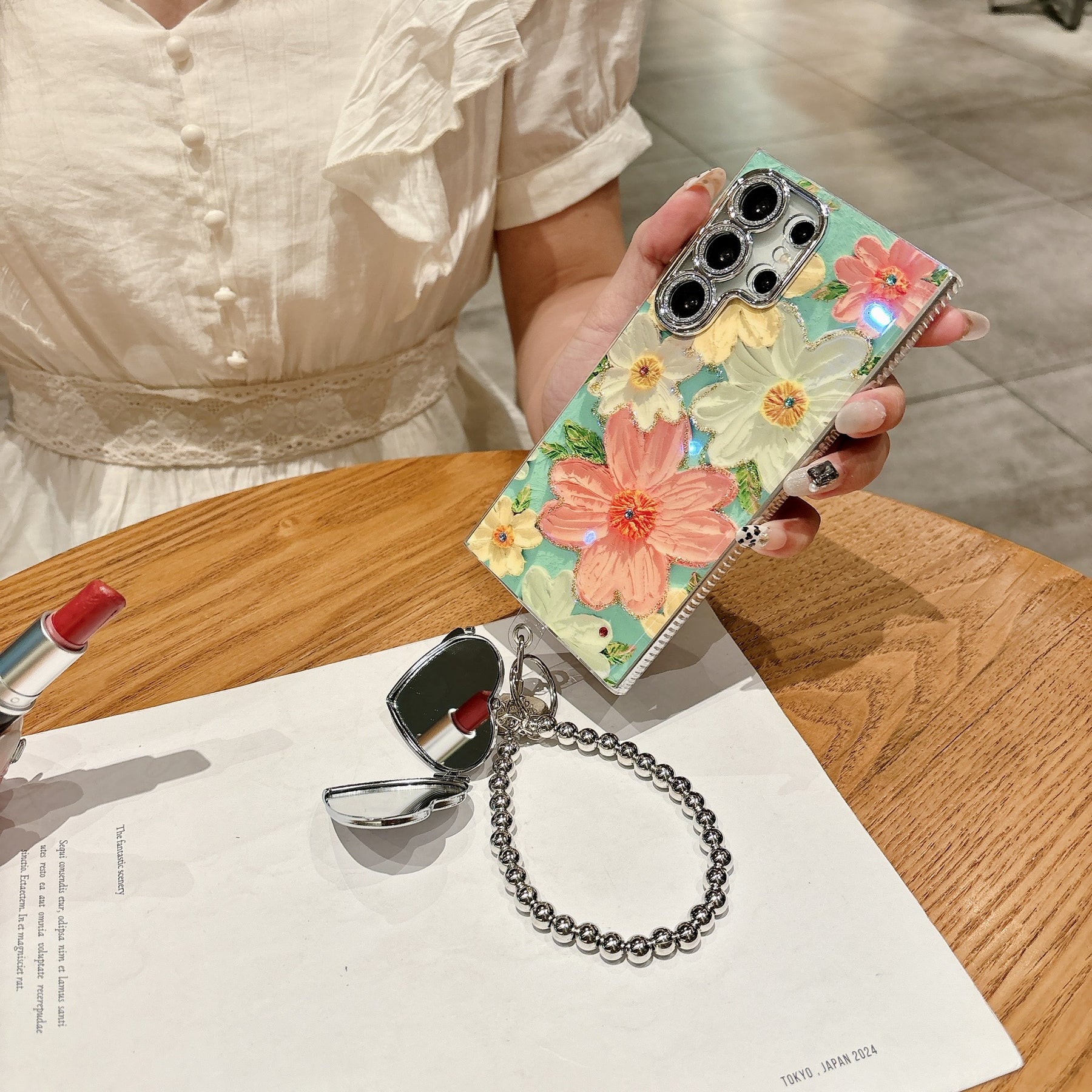 The Romantic Blossom Heart Strap Case blends timeless floral beauty with modern elegance. Designed with soft pastel blossoms and a charming heart-shaped mirror accent, this case transforms your phone into a stylish accessory. The detachable metal chain strap adds both function and flair, allowing you to wear it crossbody or carry it as a statement piece—perfect for everyday outings or special moments.