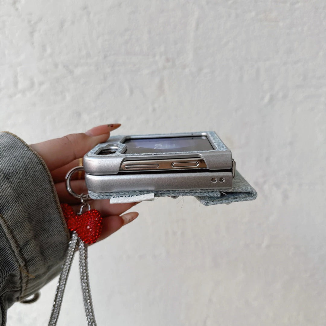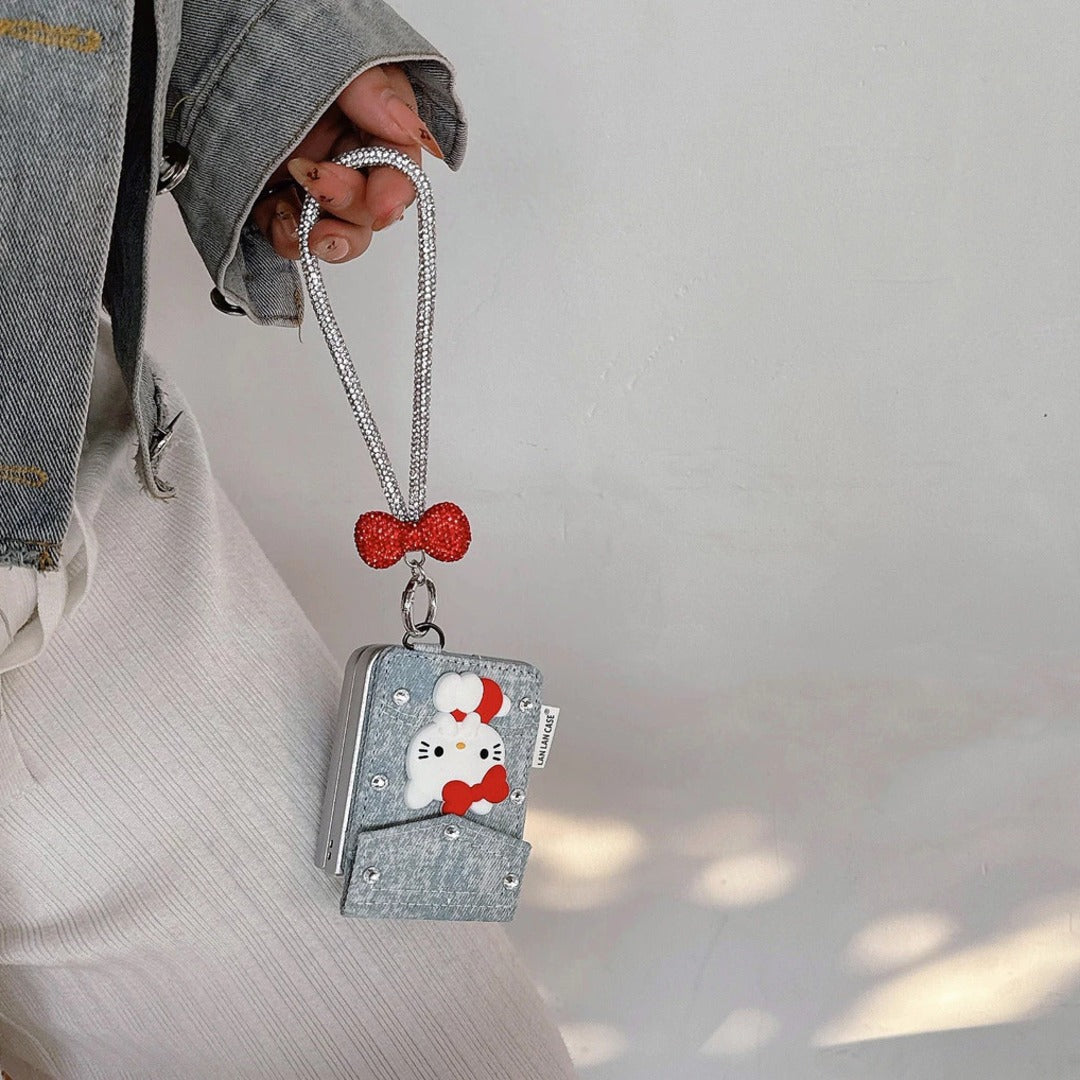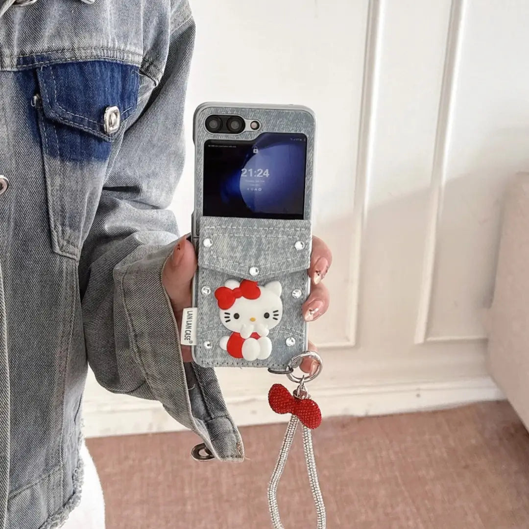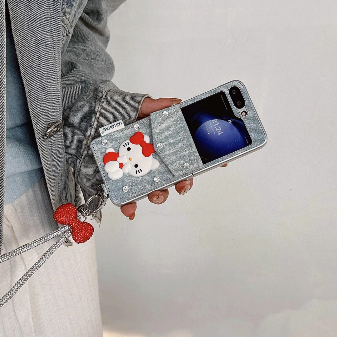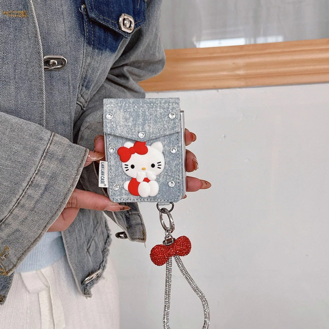 Give your phone a stylish and adorable makeover with the Denim Kitty Case. Designed for fashion lovers, this case features a trendy denim fabric texture with a cute 3D Hello Kitty charm. The built-in pocket adds convenience, allowing you to store small essentials like cash or cards.