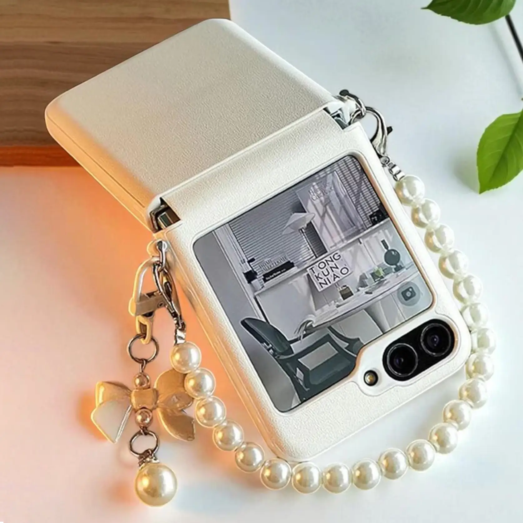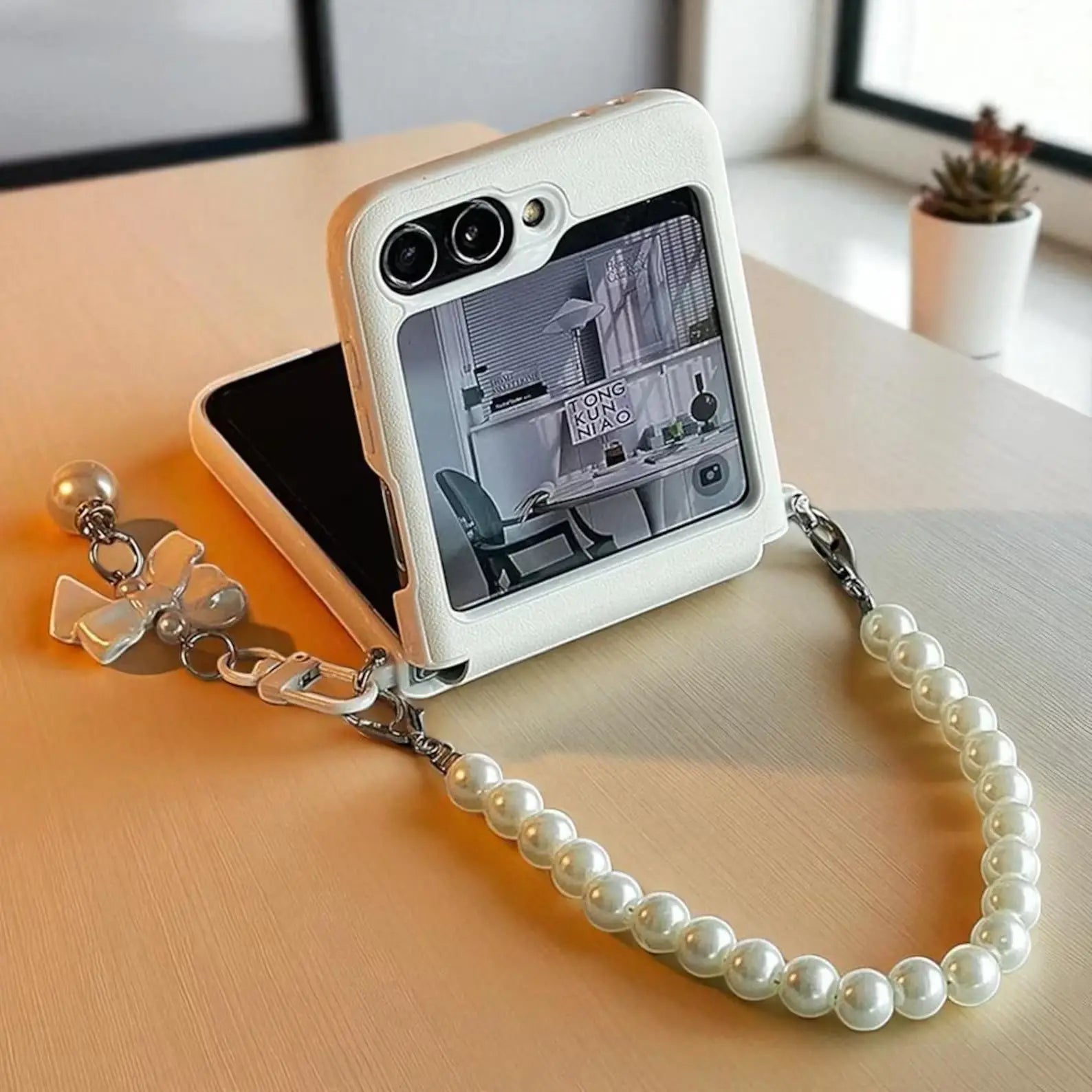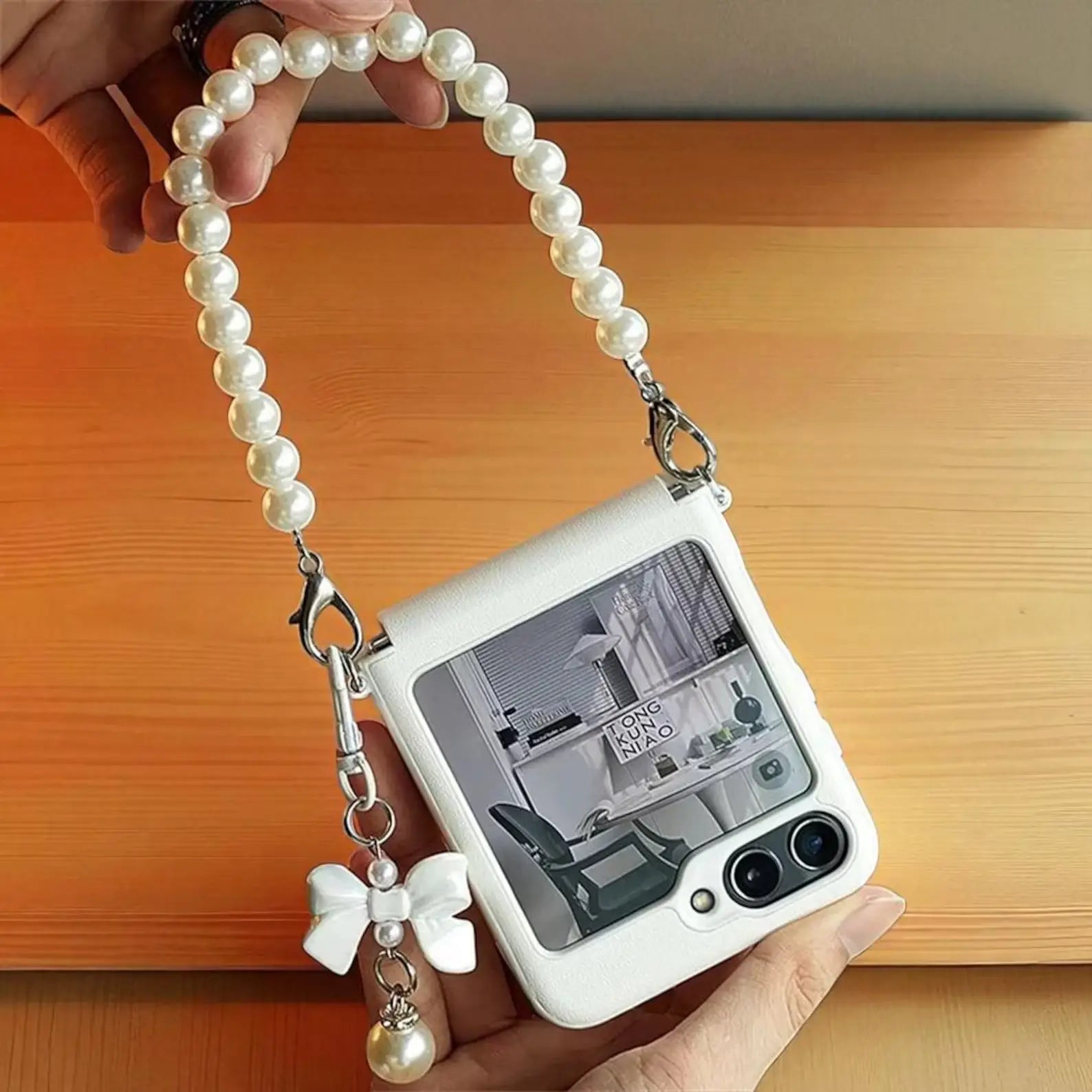 The Ivory Pearl Charm Flip Case brings together elegance and practicality in a design made to elevate your Samsung Flip. Wrapped in a soft ivory leather texture, it features a luxurious pearl bracelet handle paired with a delicate bow charm—adding sophistication, comfort, and style to your everyday carry.