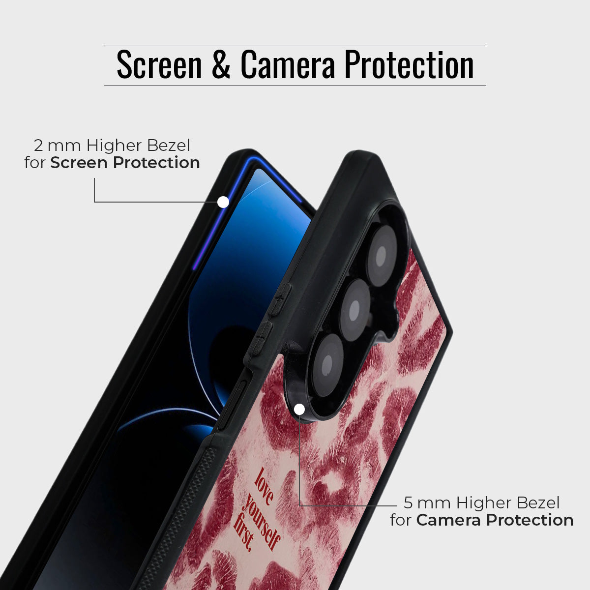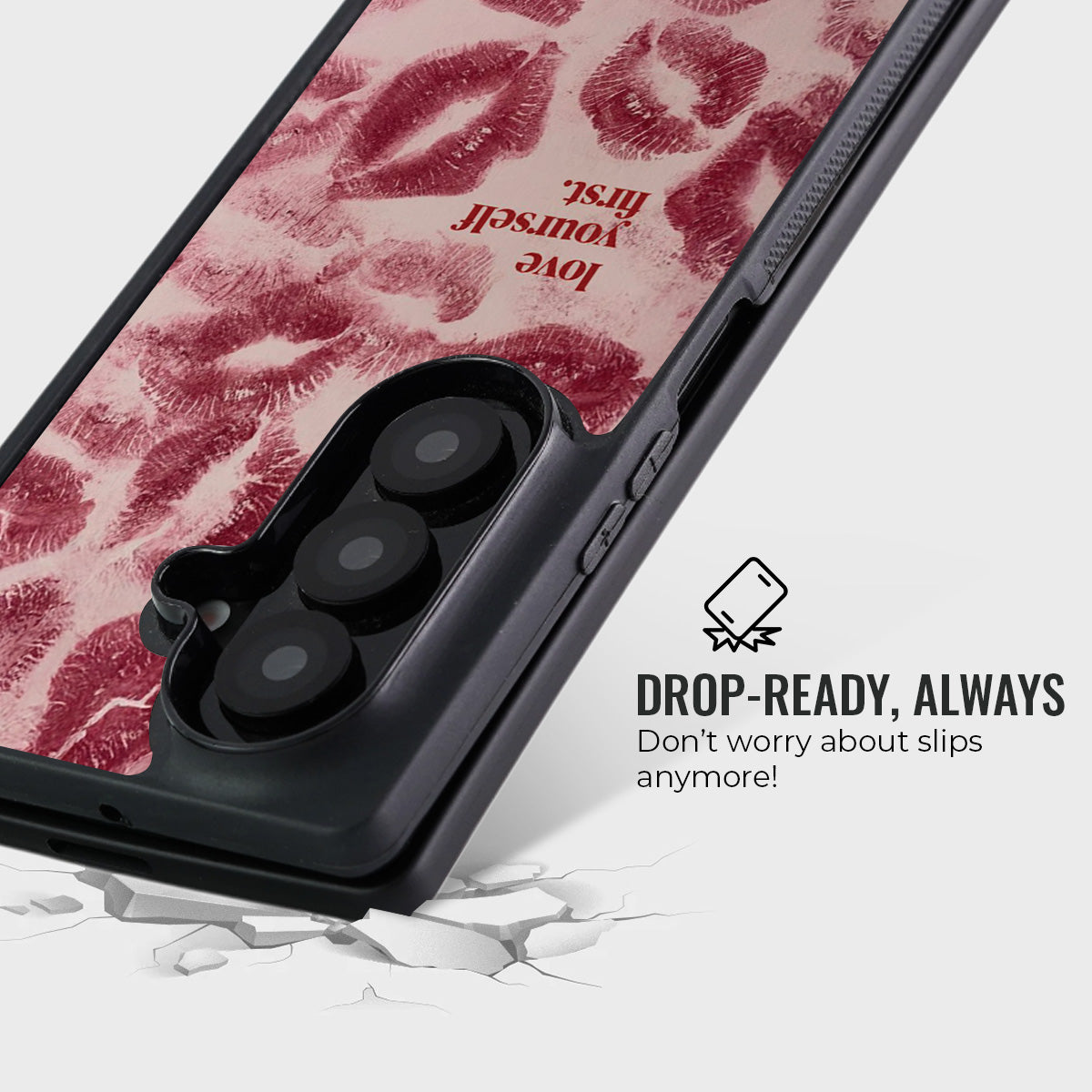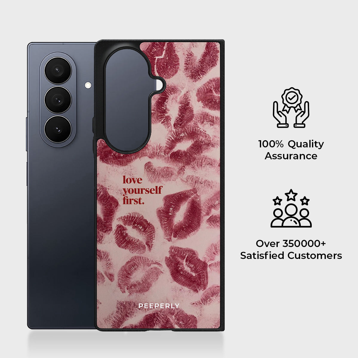 Show the world the strength that comes with loving yourself. This unique phone case, adorned with bold kiss marks and the empowering phrase "Love Yourself First," serves as a constant reminder of your inner power and beauty.