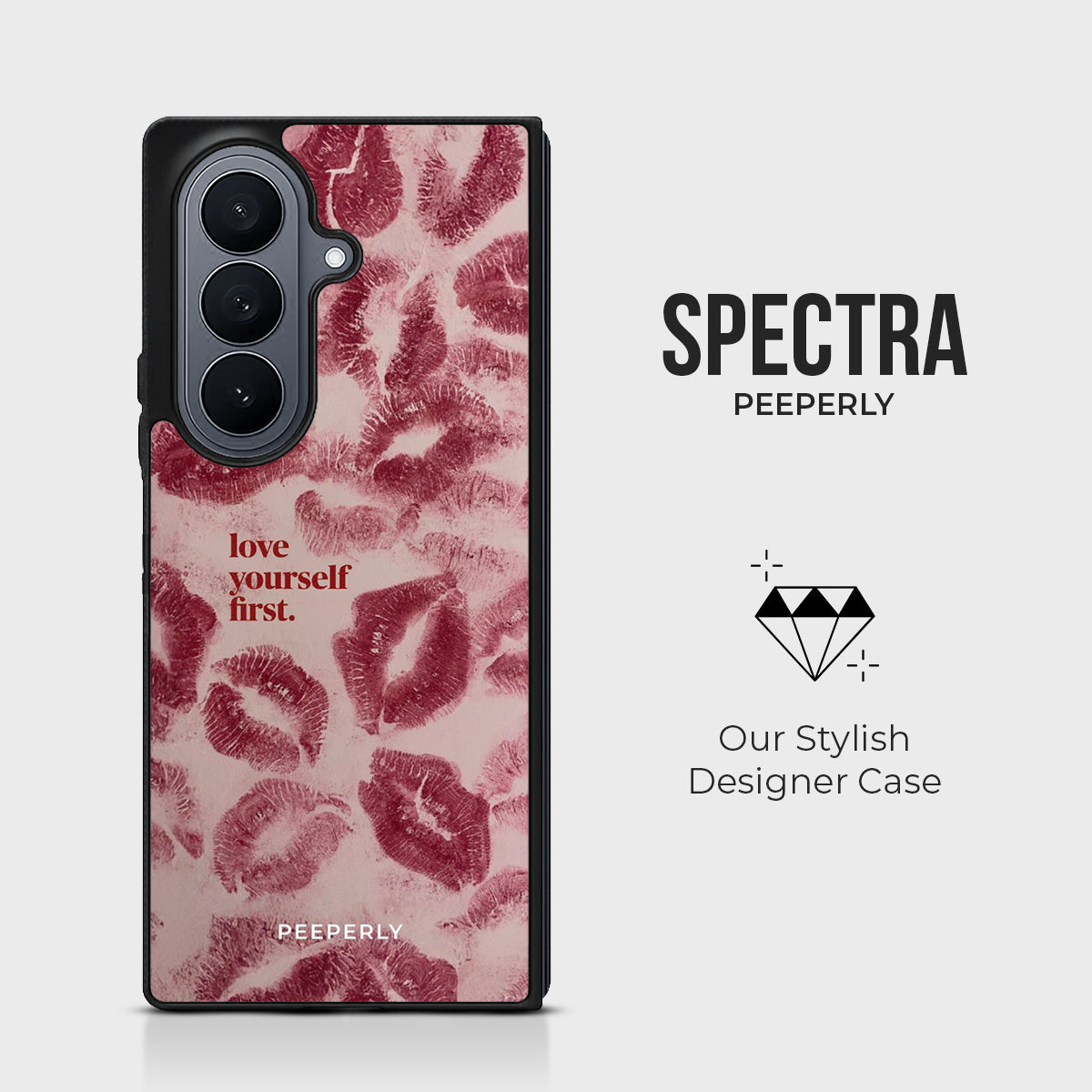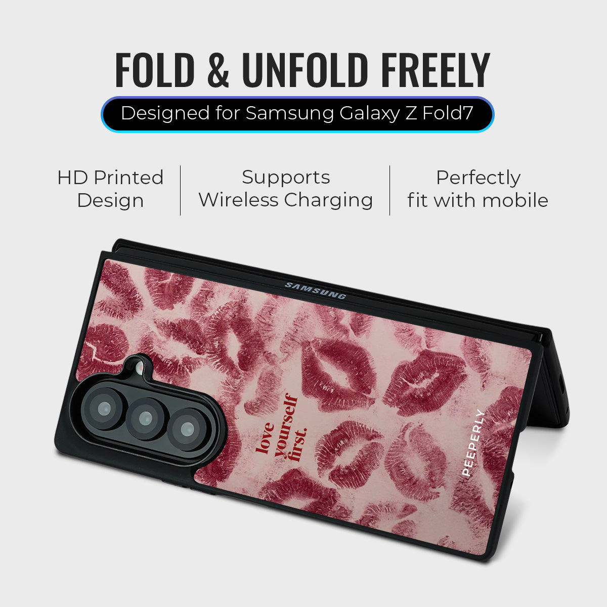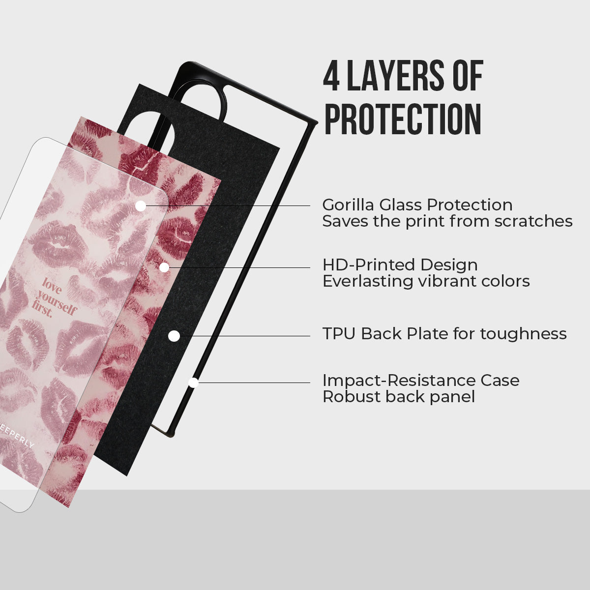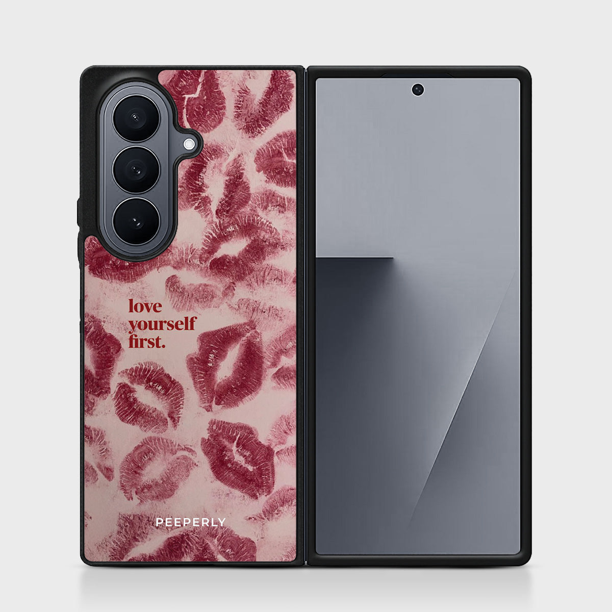 Show the world the strength that comes with loving yourself. This unique phone case, adorned with bold kiss marks and the empowering phrase "Love Yourself First," serves as a constant reminder of your inner power and beauty.