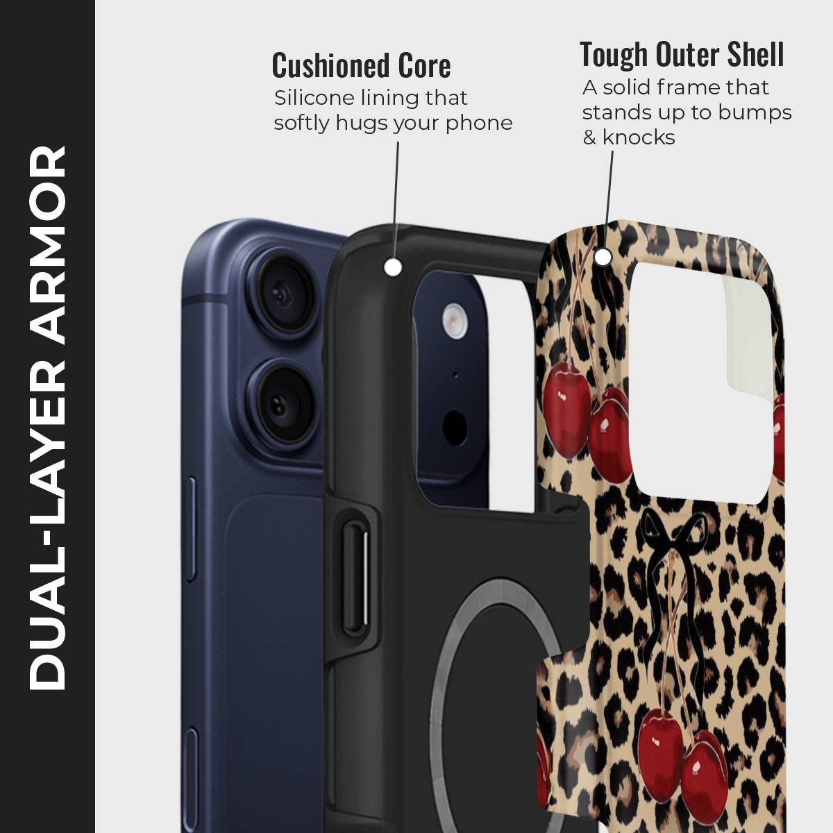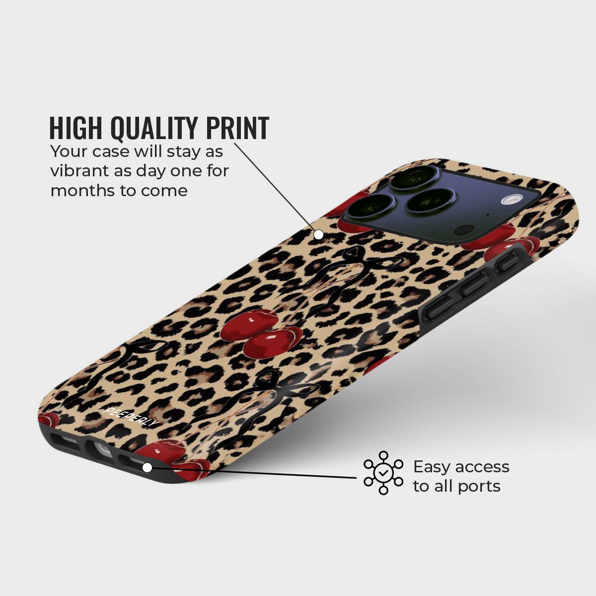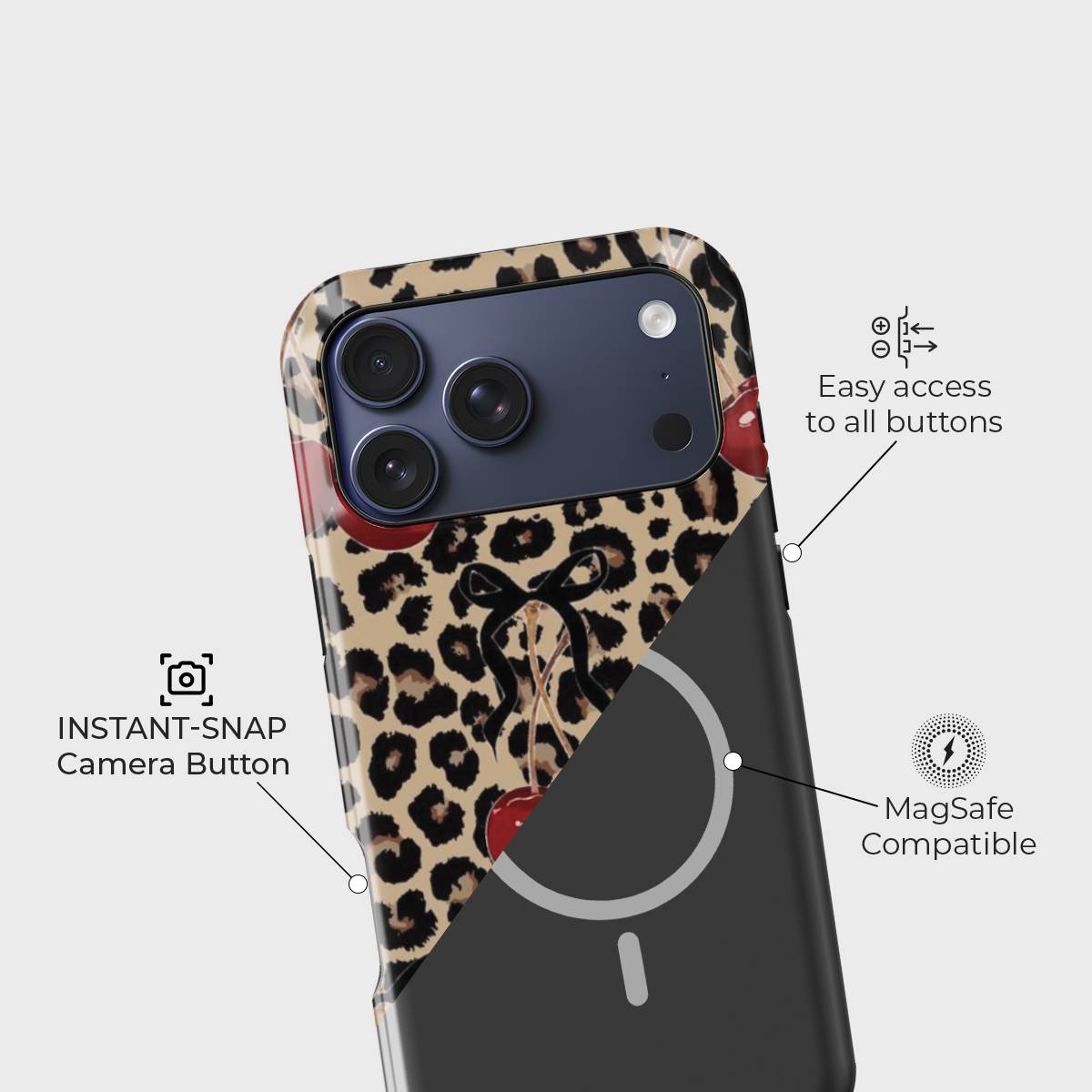 Unleash your wild side with Fierce & Fruity — a daring mix of sultry leopard print and juicy red cherries, tied together with flirty little bows. This eye-catching case is made for bold personalities who love to stand out.