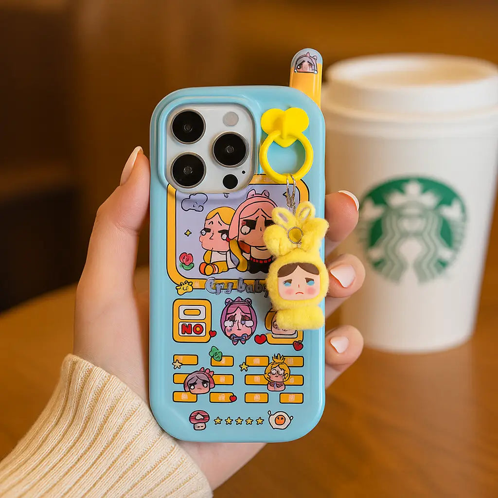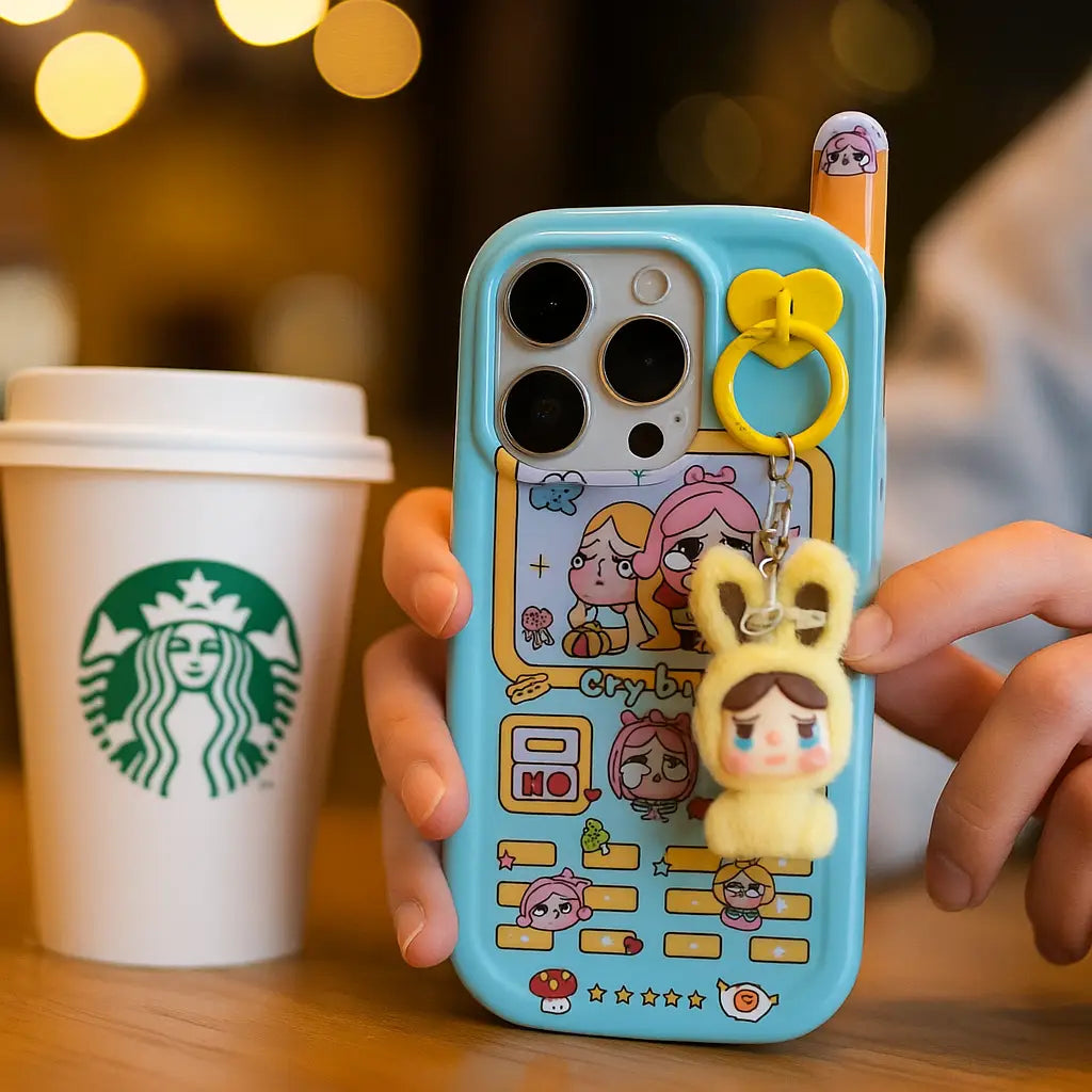Step into a world of cuteness and nostalgia with the Cry Bunny phone case. Inspired by playful arcade vibes and pastel charm, this case features adorable cartoon characters, interactive-style button graphics, and a fuzzy bunny charm that brings the whole look to life.
