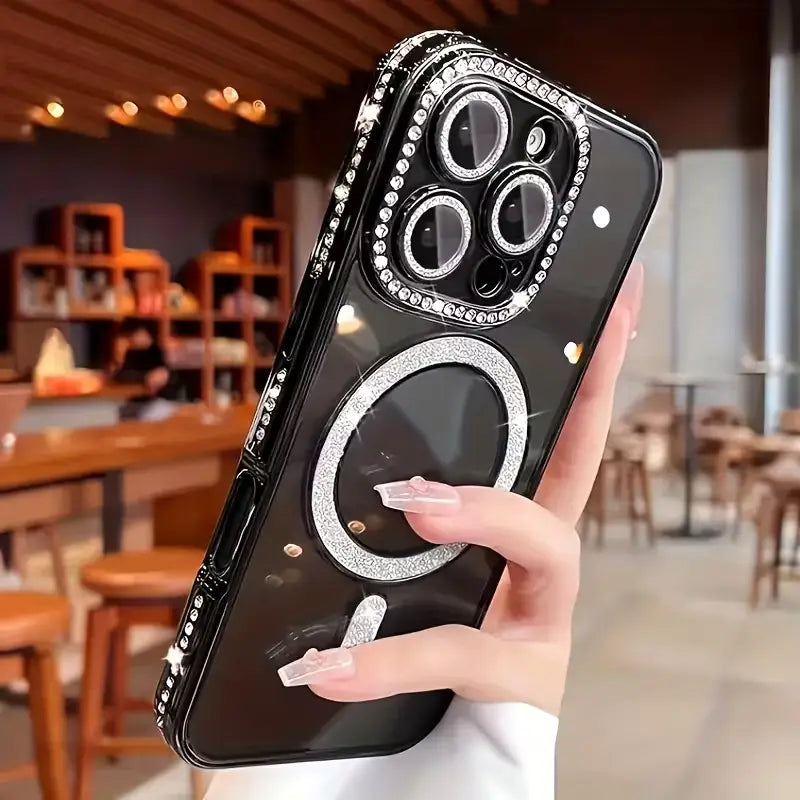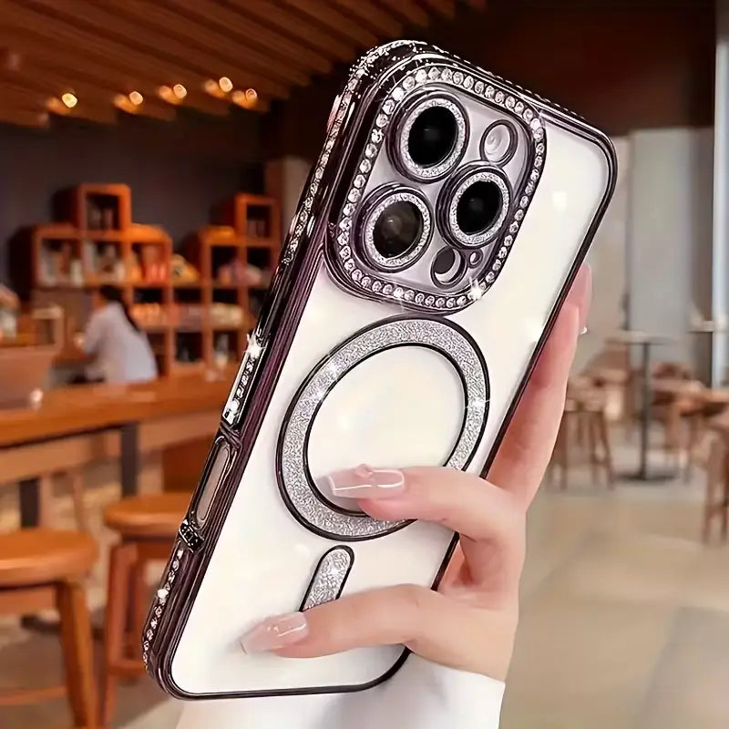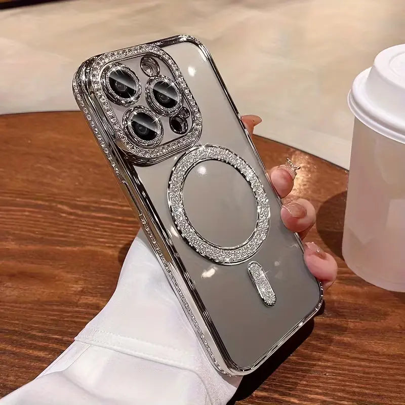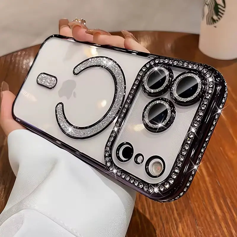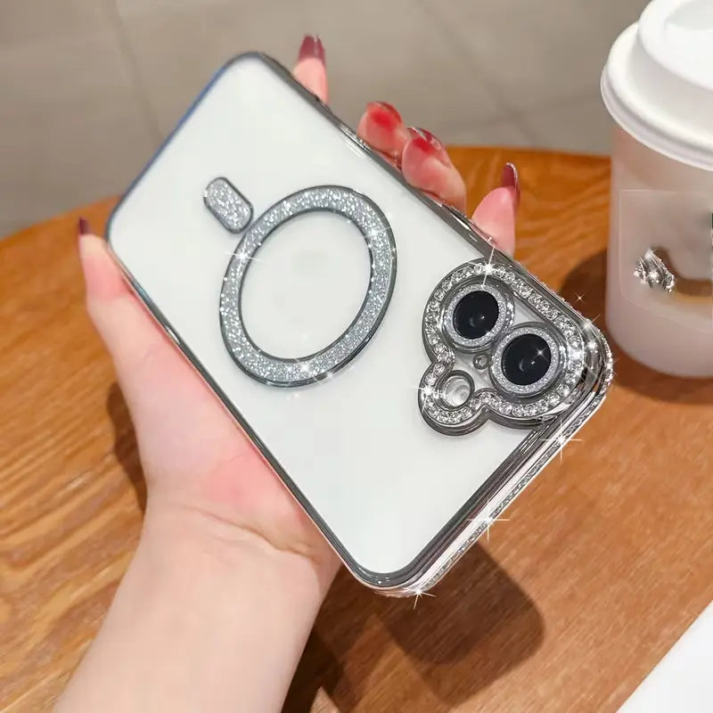 Inspired by the soft glow of sunset, this dazzling case features a golden gradient with a fine glitter finish that shimmers beautifully under any light. The chrome metallic edges and MagSafe-compatible ring add a touch of elegance and practicality, ensuring your phone looks as flawless as it performs.