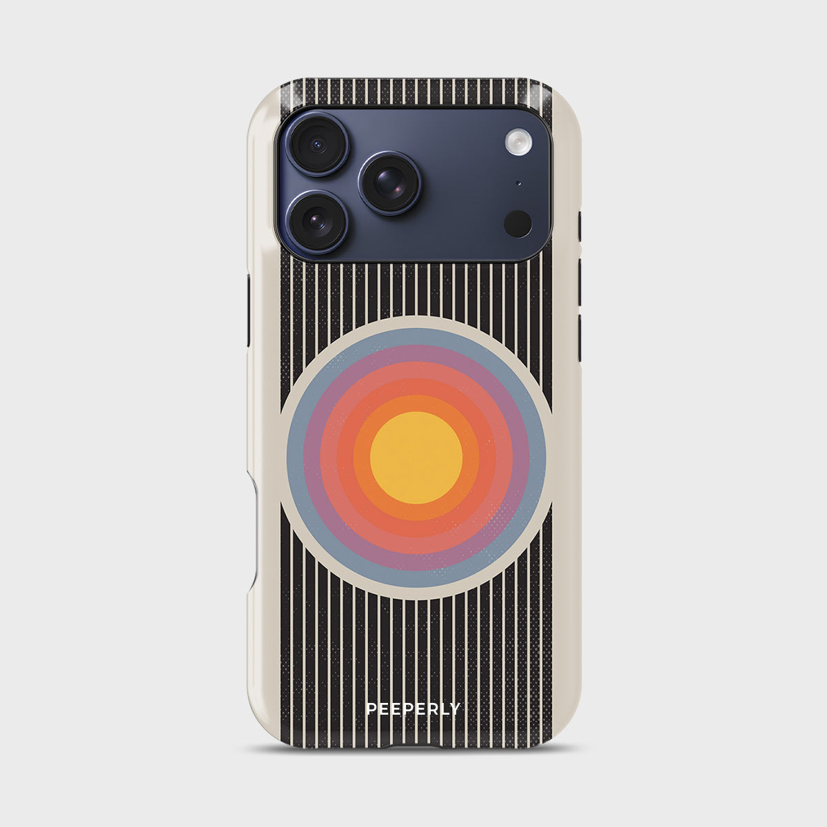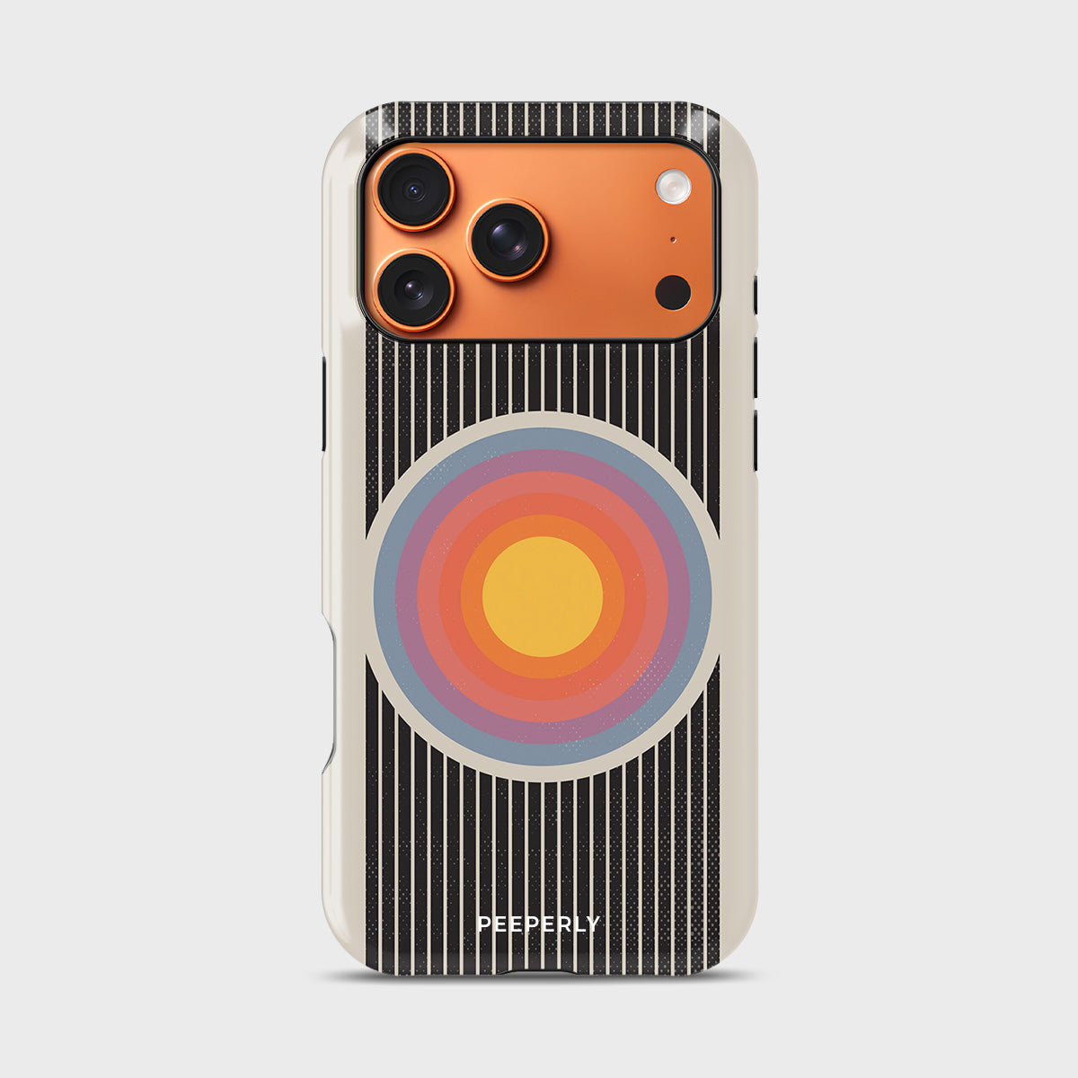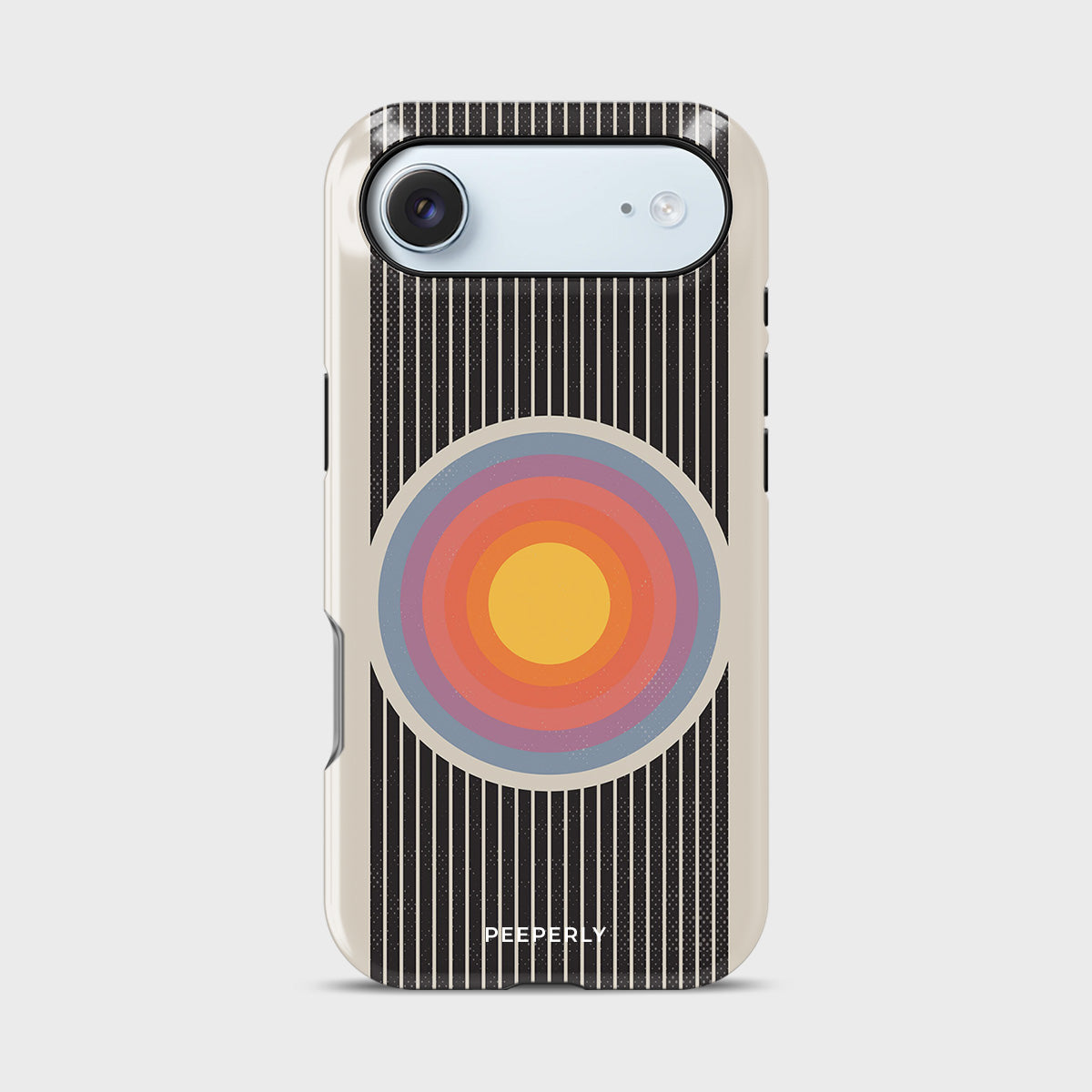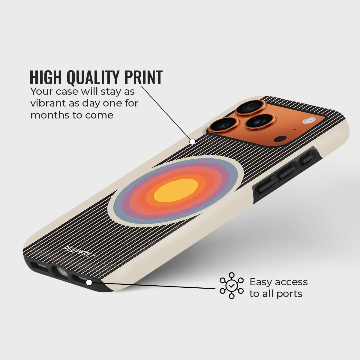 Step into the cosmos with Celestial Target, a bold fusion of retro design and galactic inspiration. This phone case features a hypnotic series of concentric circles radiating in vibrant sunset tones—yellow, orange, red, lavender, and deep blue—set against a sleek, black-striped backdrop.